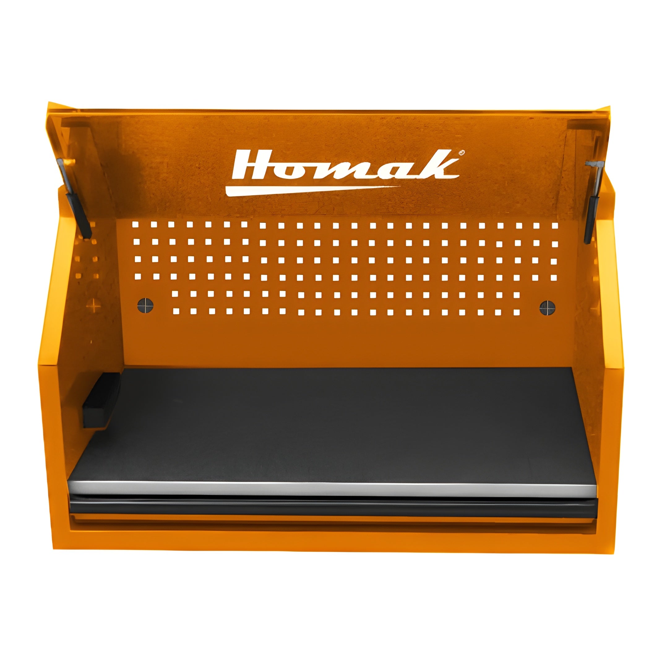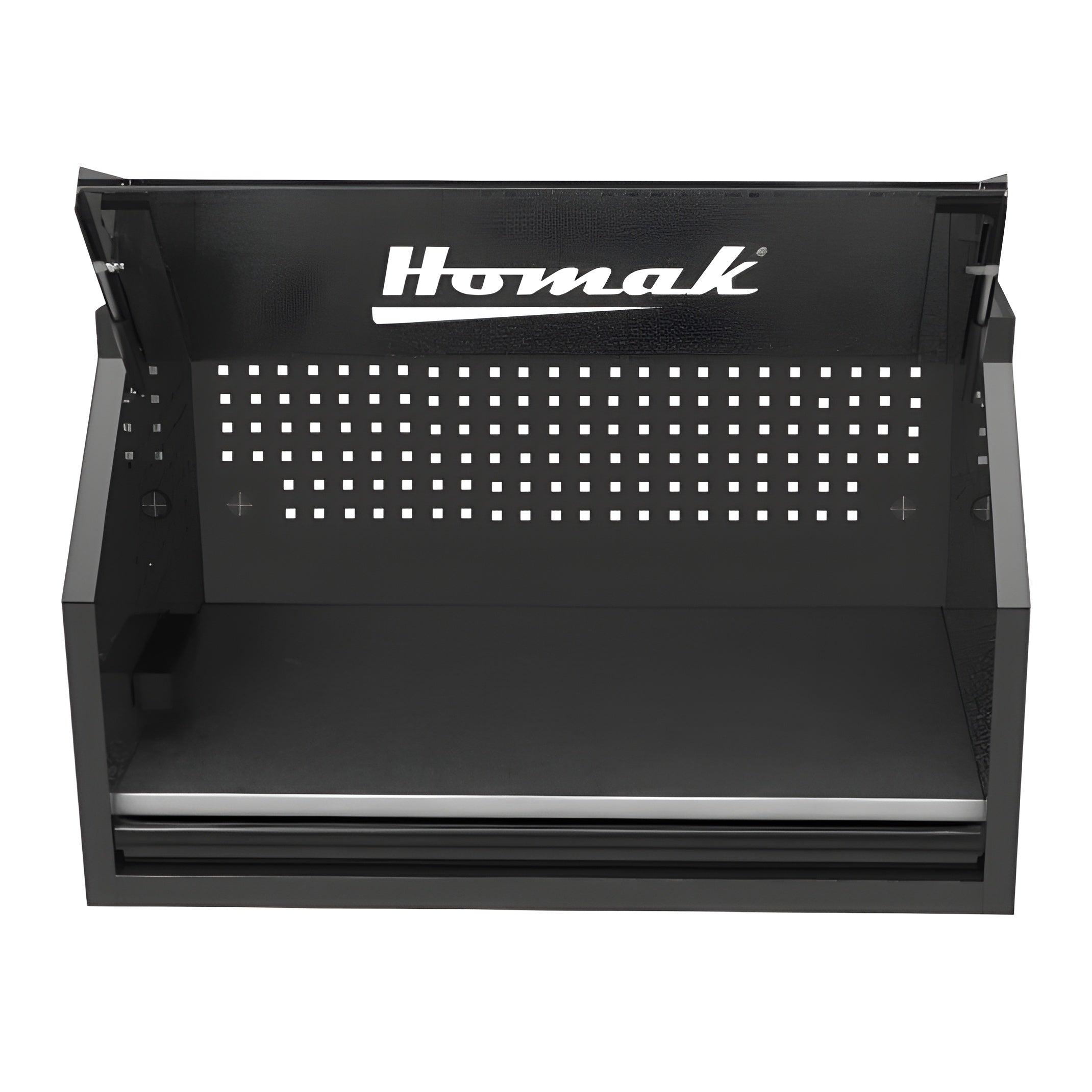 The Homak RS Pro 41" 1 Drawer hutch is designed to enhance the organization of your industrial workspace. Specifically crafted for use atop a roller cabinet, this hutch provides supplementary storage capacity to your current unit. Constructed from robust steel and coated with a UV-resistant black powder finish, it ensures durability while effectively expanding your storage options within your workspace.
