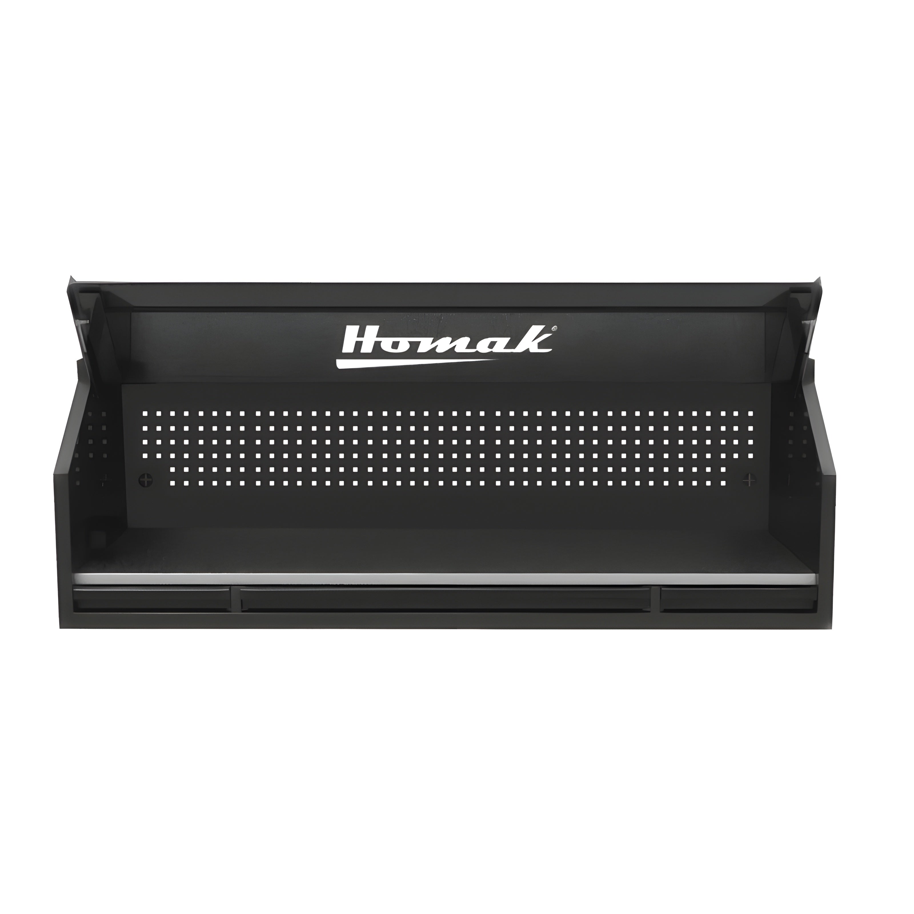 The Homak RS Pro 72" 3 Drawer Hutch is designed to optimize organization within your industrial workspace. Intended for placement atop a roller cabinet, this hutch offers additional storage capacity for your existing unit. Constructed from sturdy steel and finished with a UV-resistant black powder coating, it ensures long-term durability and resilience. Featuring a stainless steel shelf with ample storage space, this hutch provides a convenient area to store various items. Moreover, it includes a tool board backsplash, facilitating the hanging of additional tools and supplies for easy accessibility and efficient utilization of space.