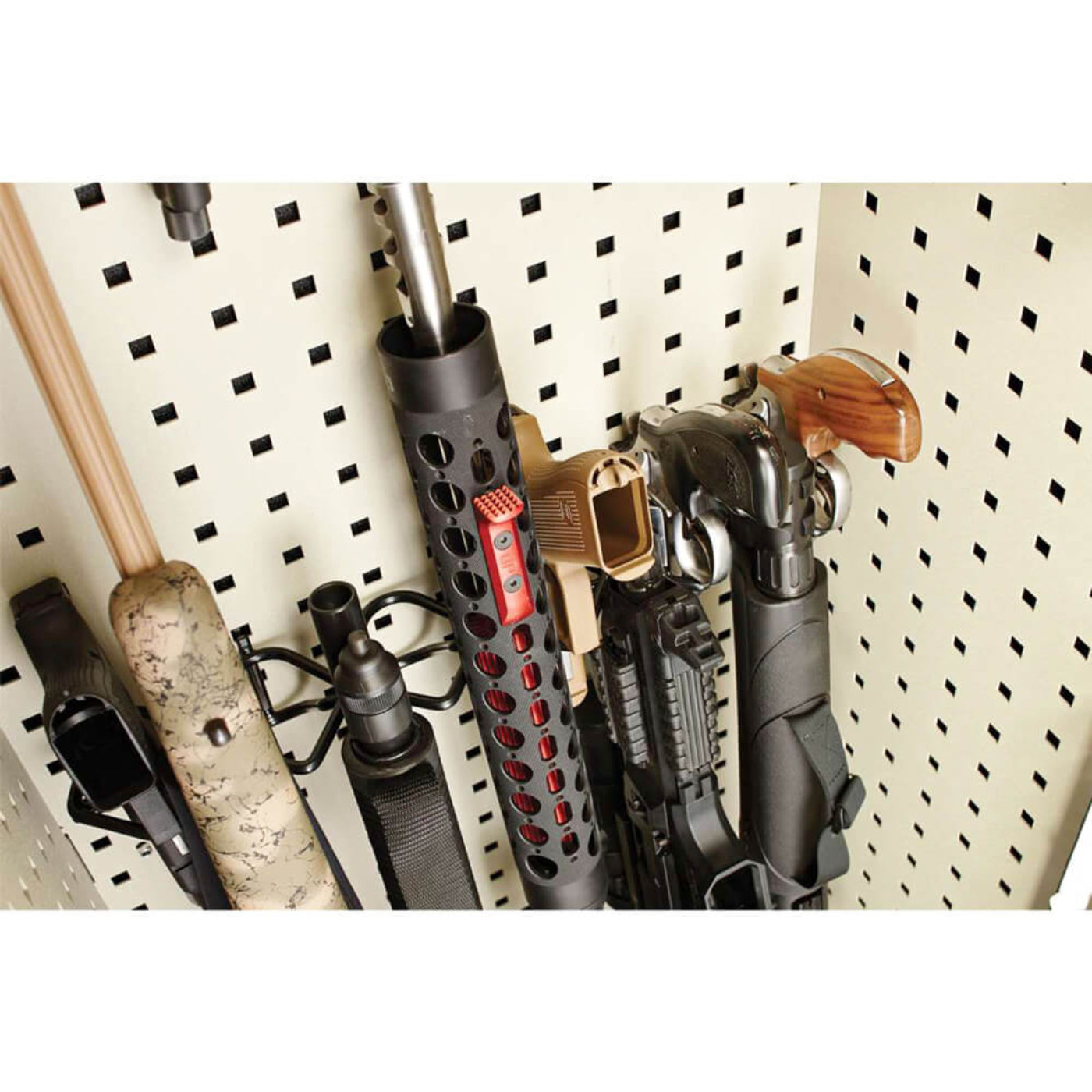 The Square-Lok™ organizing system allows gun racks (included) and other Square-Lok™ accessories to be mounted in numerous configurations to maximize storage. Hornady Security LED lights, magnetic hooks, hygrometer and dehumidifiers are all compatible (sold separately).