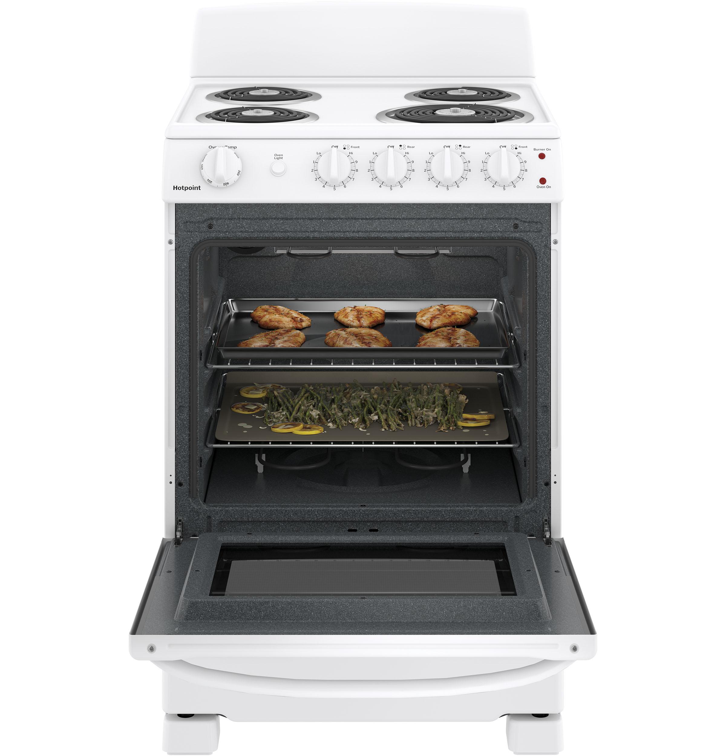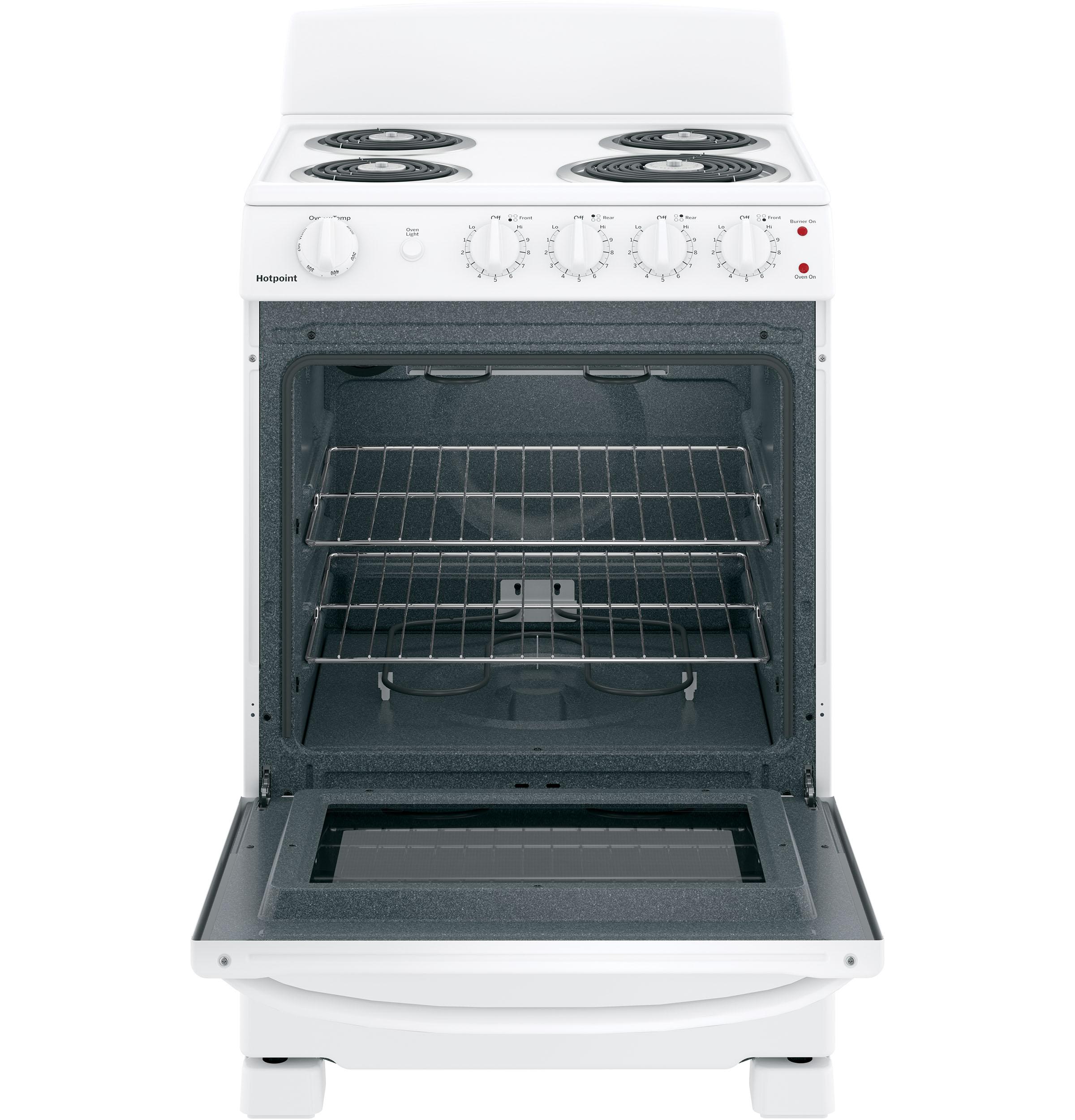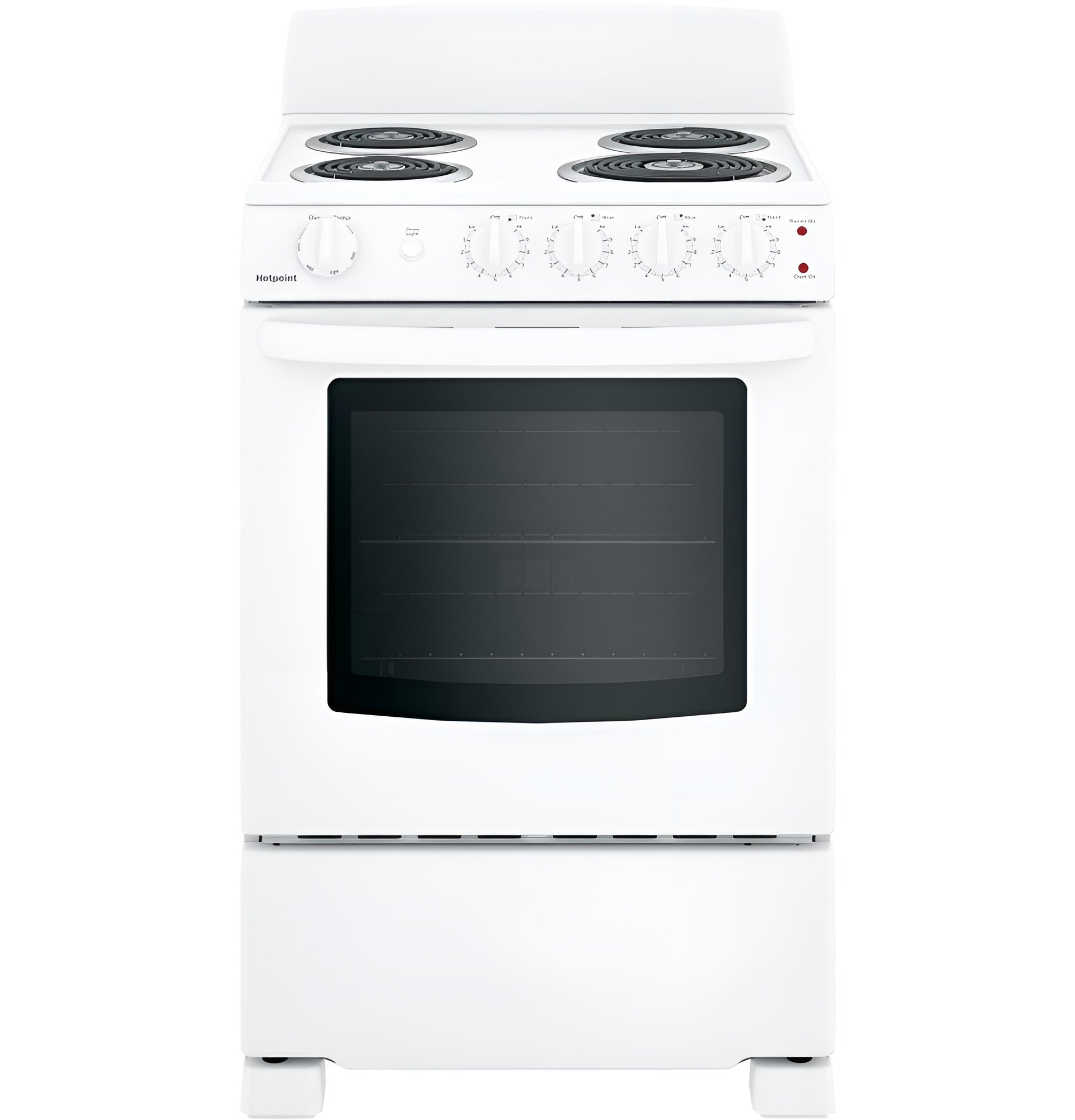 A: The HOTPOINT RAS240DMWW is a 24" free-standing electric range with front-control knobs. It features four coil burners, a spacious oven, and a sleek white finish. The front-control design allows for easy access and control while cooking.