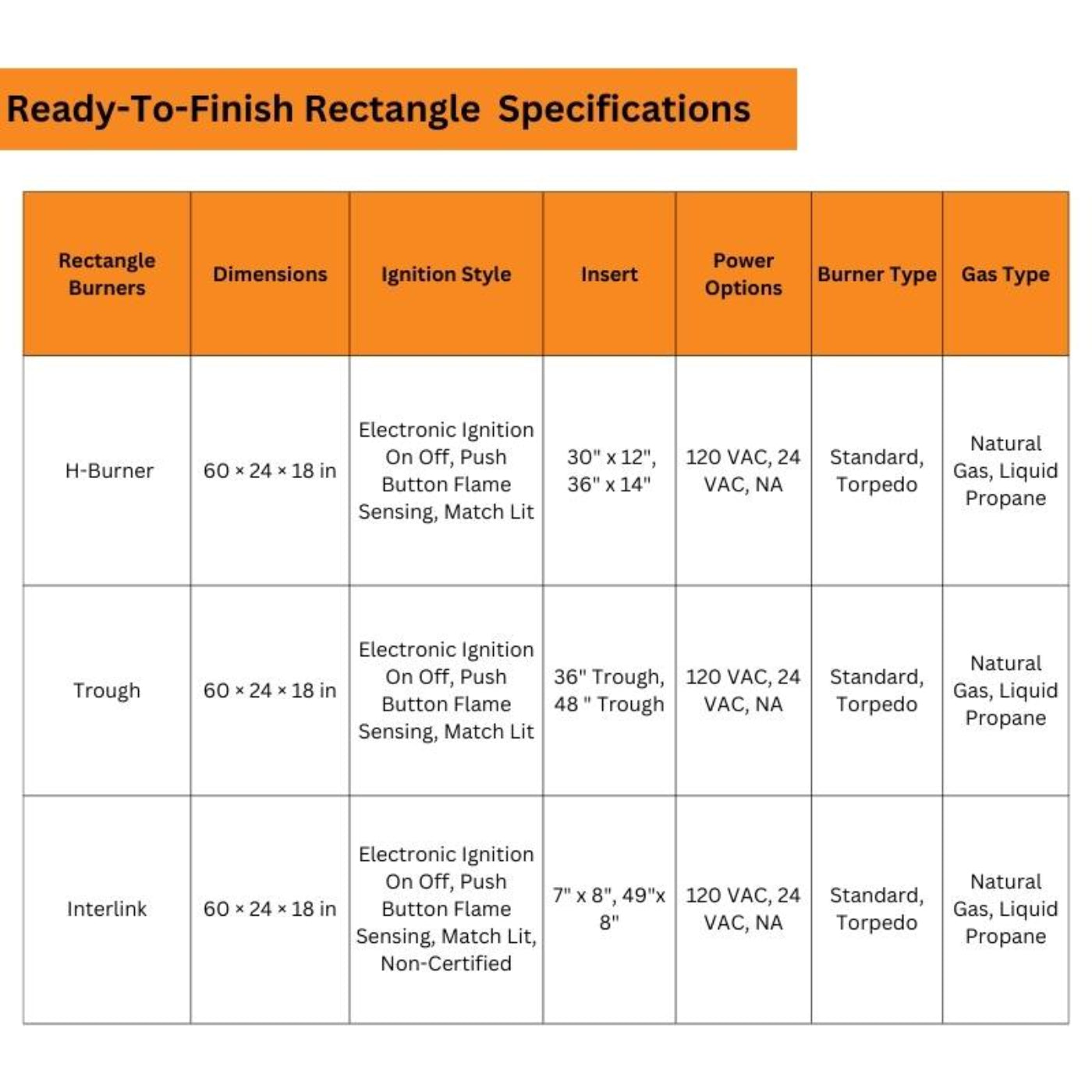 The Rectangle Ready to Finish (RTF) Fire Pit Kit comes in all three ignition styles, Match Lit, Push Button-Flame Sensing, and Electronic ignition and can be finished with any style the build needs to perfectly match the surroundings.