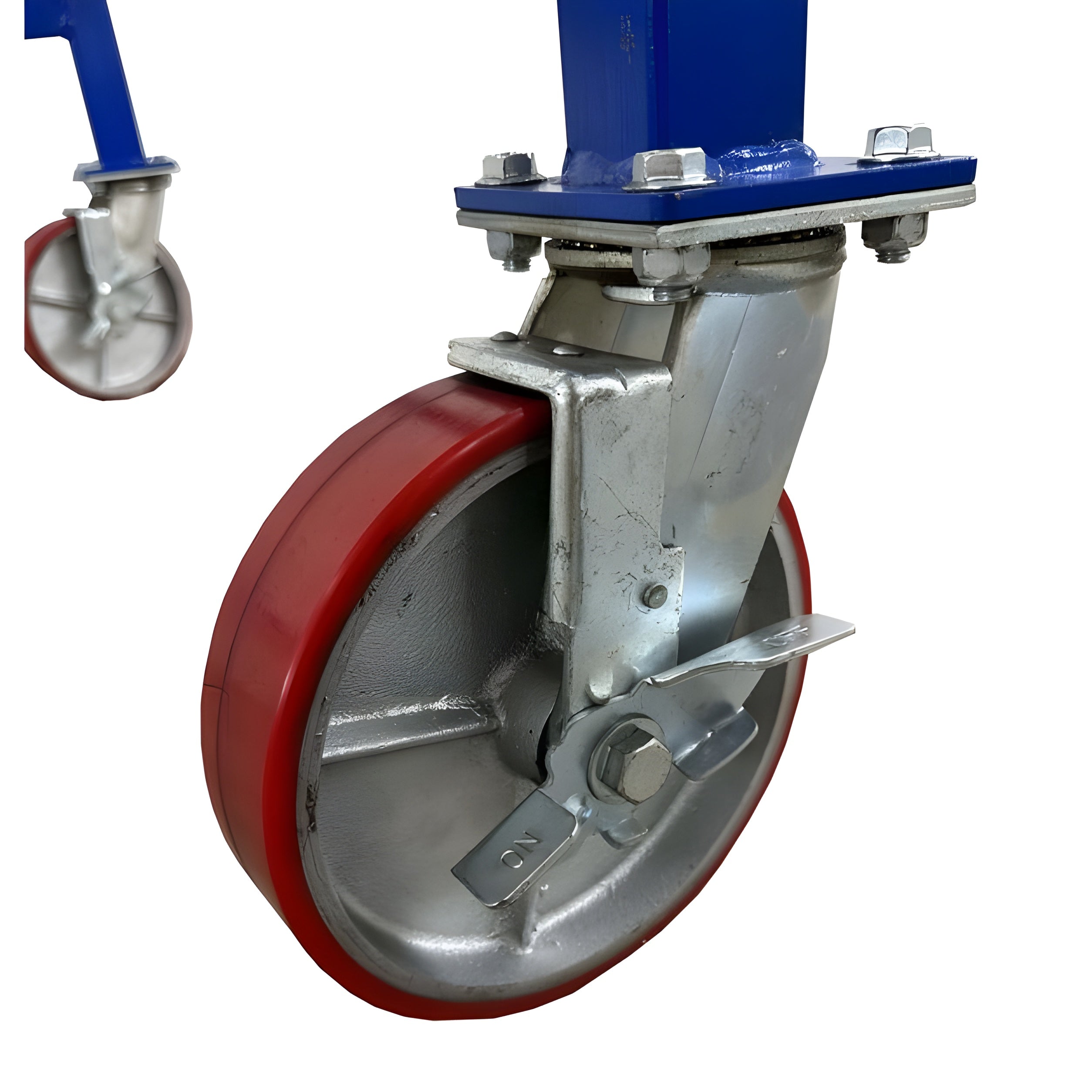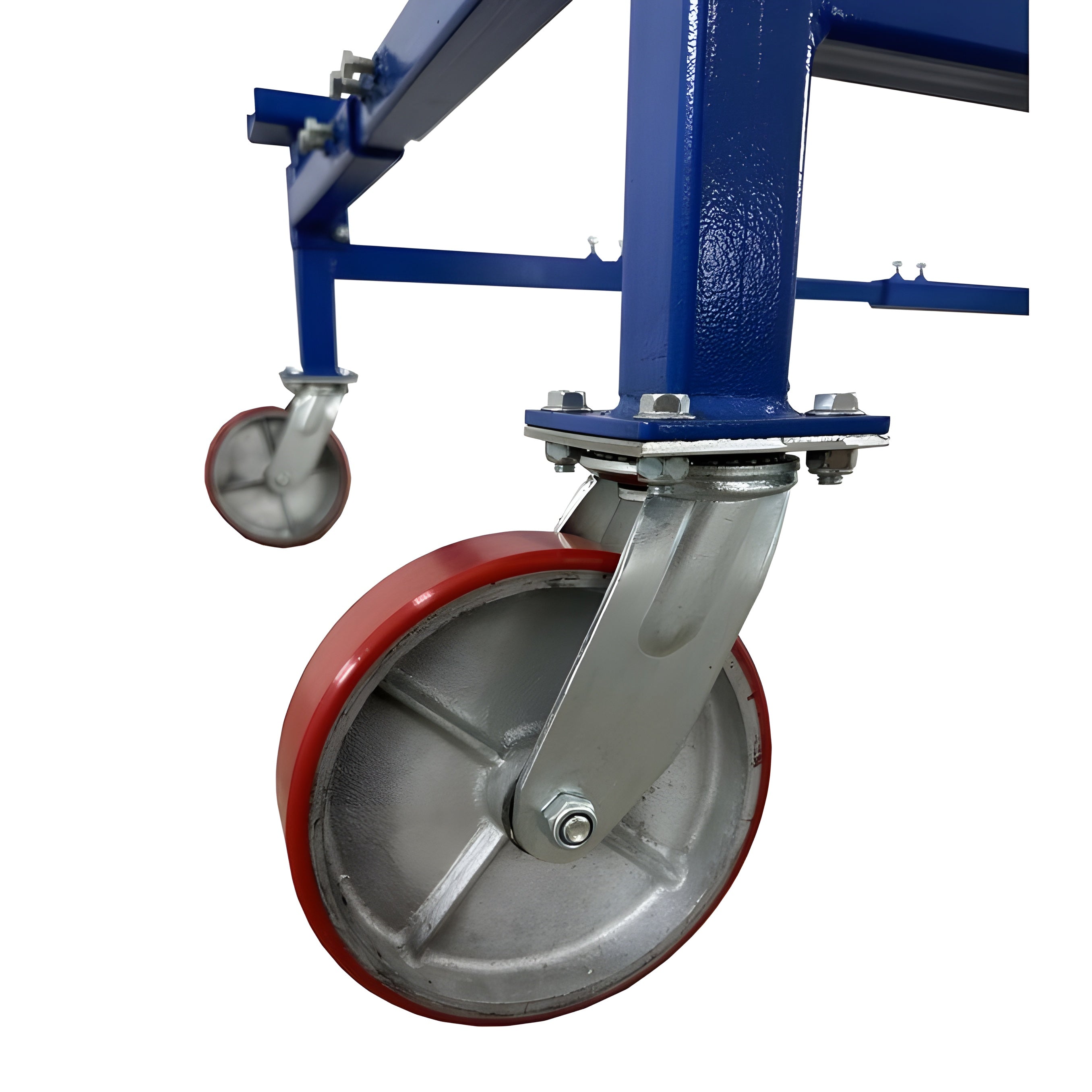 A: Adjustable width and height, heavy-duty steel construction, swivel casters for mobility, and locking mechanisms for stability.