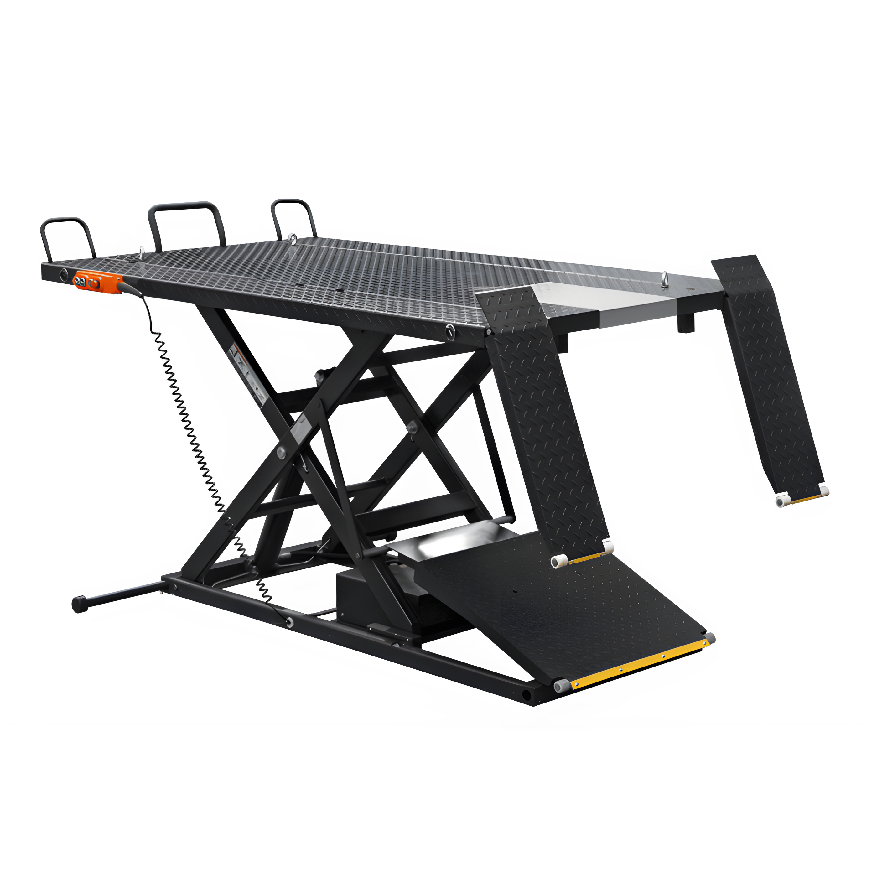A: A heavy-duty electric-hydraulic ATV lift with an integrated motor and retractable ramp for effortless lifting and servicing of ATVs, UTVs, and similar vehicles.