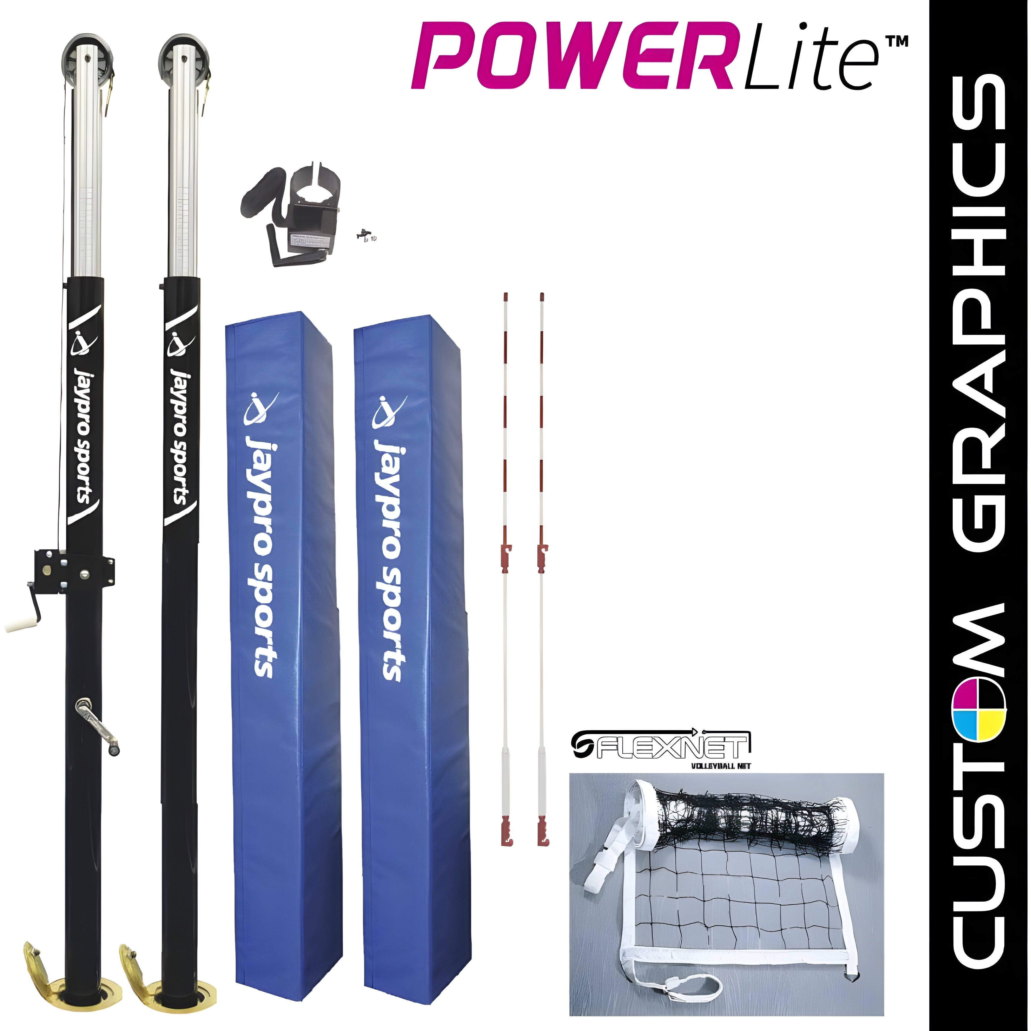 Q: What are the key features of the Jaypro PowerLite Volleyball System with Custom Graphics?