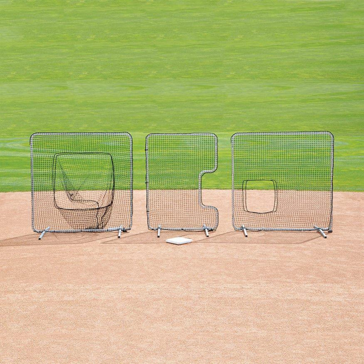 Galvanized steel square frames with heavy-duty pillow-case style netting. A C-shaped cut-out allows for the use of a pitching machine during batting practice. This provides protection for the operator while allowing the pitching machine ample room to work.