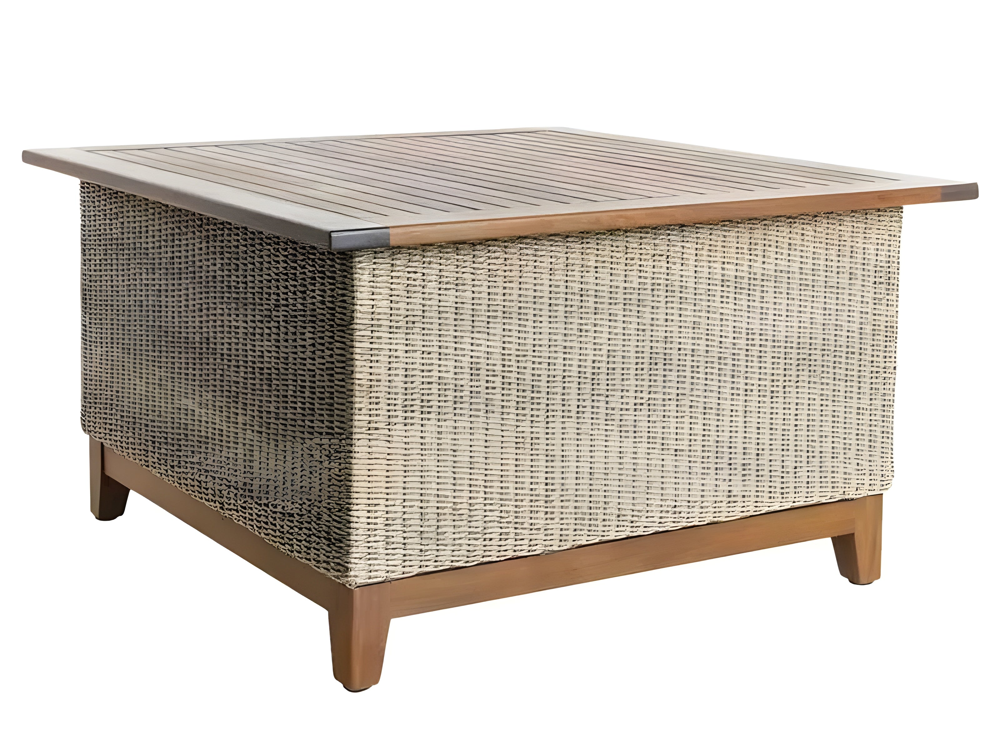 A: A stylish outdoor chat table with a square design, featuring a natural weave finish. It's perfect for casual outdoor gatherings and adds a touch of elegance to your patio or outdoor seating area.