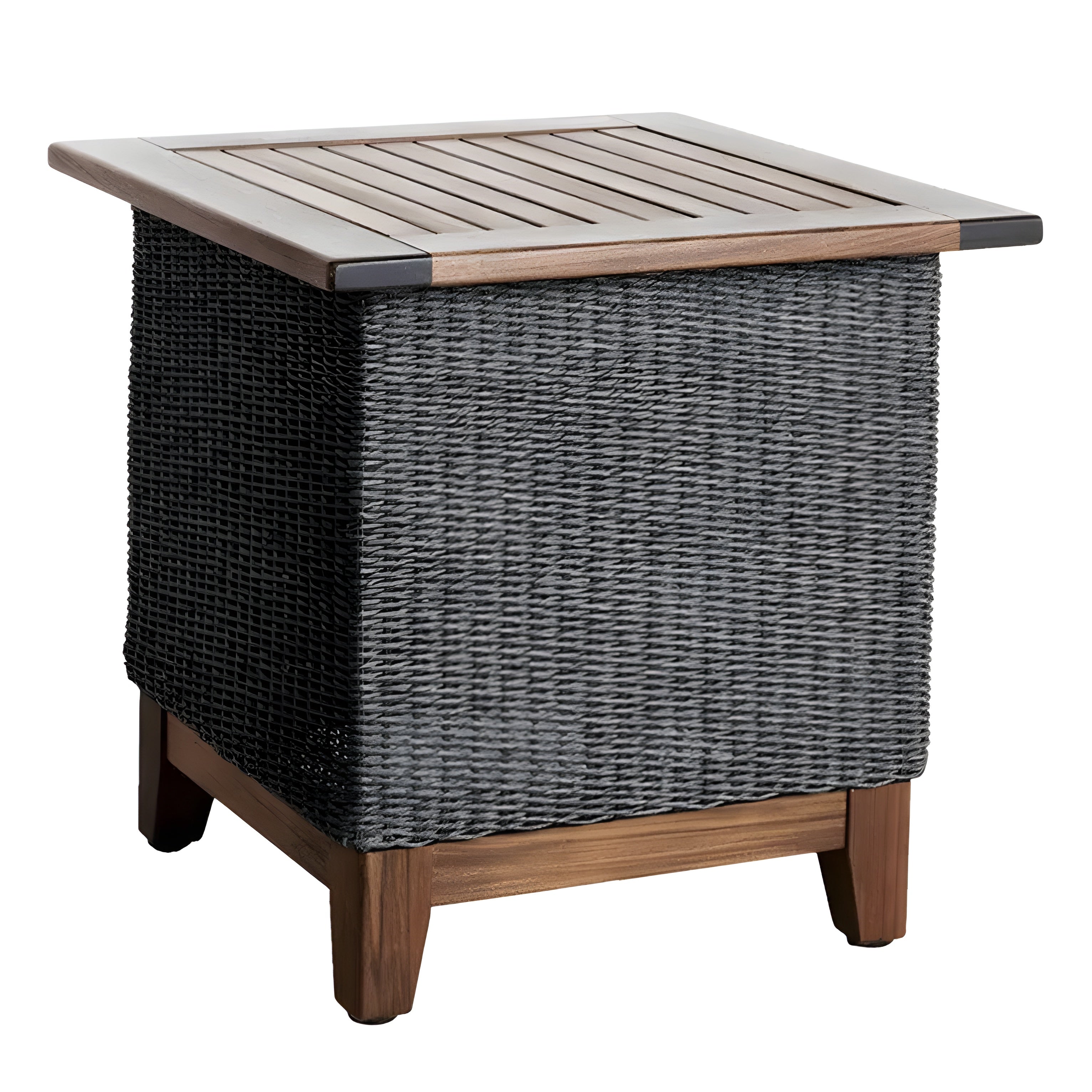 A: A compact and stylish outdoor side table featuring a square design with a gray weave frame, perfect for adding functionality and style to your outdoor space.