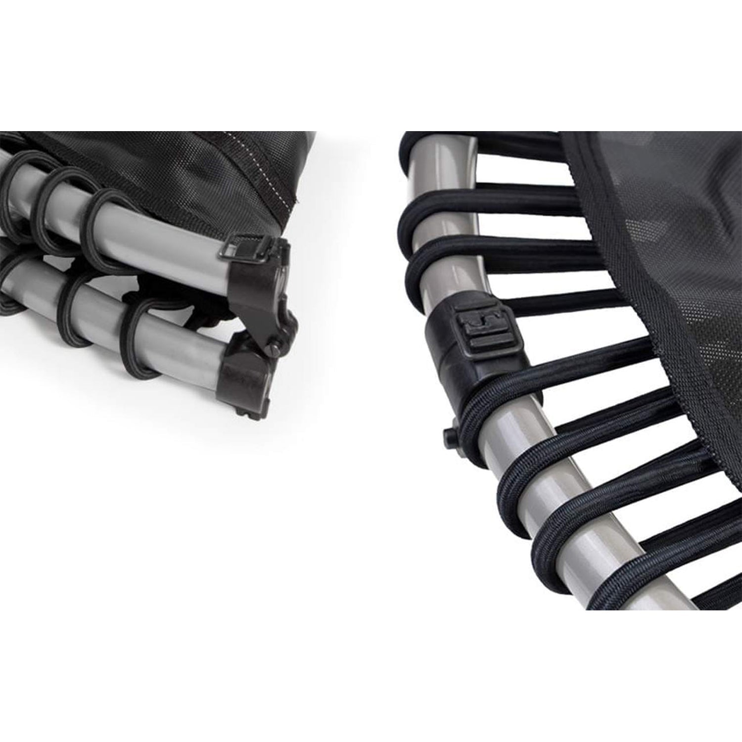 JumpSport Fitness Trampolines deliver the smoothest, deepest, and most supportive low-impact bounce on the market. Featuring EnduroLast Elastic Cords, uniquely formulated to stretch 2x resting length, compared to standard bungees that only stretch as little as 1.25x resting length. This half-fold frame design incorporates a unique locking hinge, providing a rock steady, no-wobble, platform when engaged. The 350f has a 32.5” jumping surface, arched legs, and 3 easy-to-adjust firmness settings. Most folding trampolines wiggle and shake or use heavy welded metal parts which add weight and undermine portability. The JumpSport hinge is light but creates a super stable, rigid frame rail for confident and secure jumping.