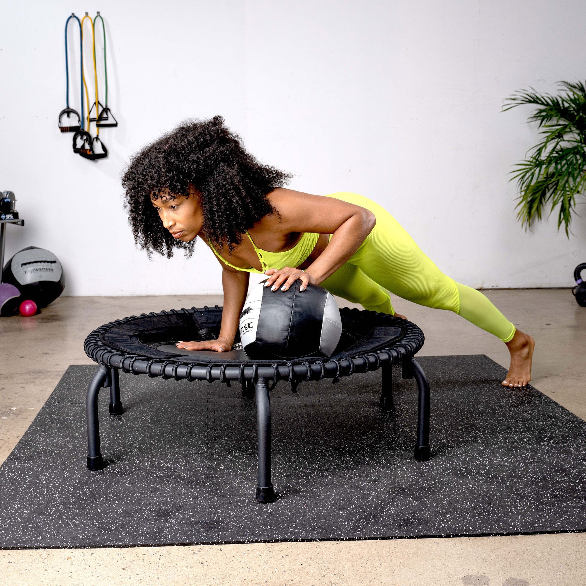 Workout without worry and step up with confidence to add versatility to your fitness routine. No-tip arched legs are safe, reliable, and allow you to stack multiple units in a commercial setting. The mat extension skirt and petal designs protect jumpers from stepping on the cords and provide more exercise space, while the trampoline legs and 12.5 inches high frame are stable enough for push-ups, dips, and more.