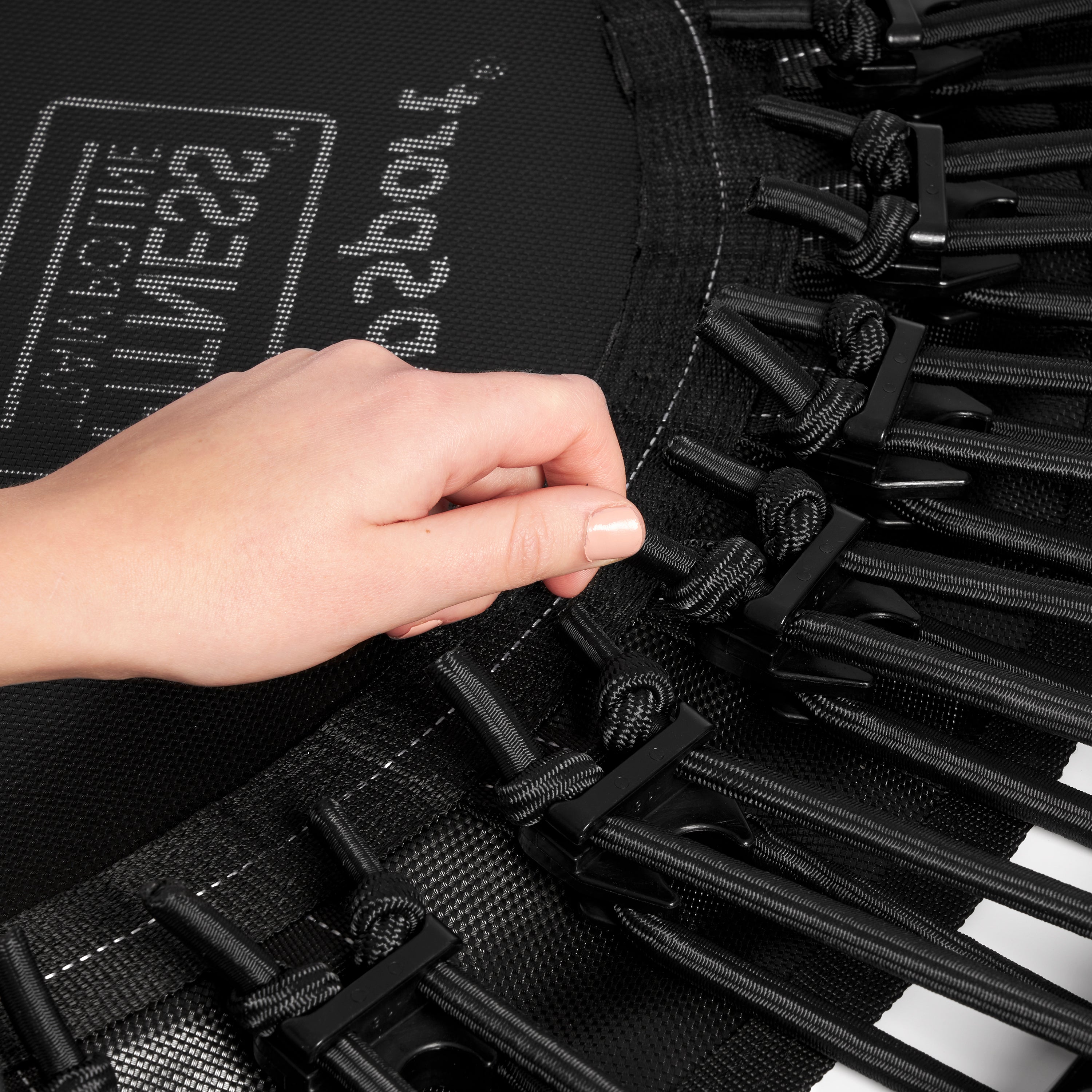This trampoline delivers the smoothest, deepest, and most supportive low-impact bounce on the market. Featuring EnduroLast Elastic Cords that are uniquely formulated to stretch 2 times the resistance length. The 370 PRO has a 35.5-inch jumping surface, arched legs, and 3 easy-to-adjust firmness settings. The JumpSport hinge is light but creates a super stable, rigid frame rail for confident and secure jumping.