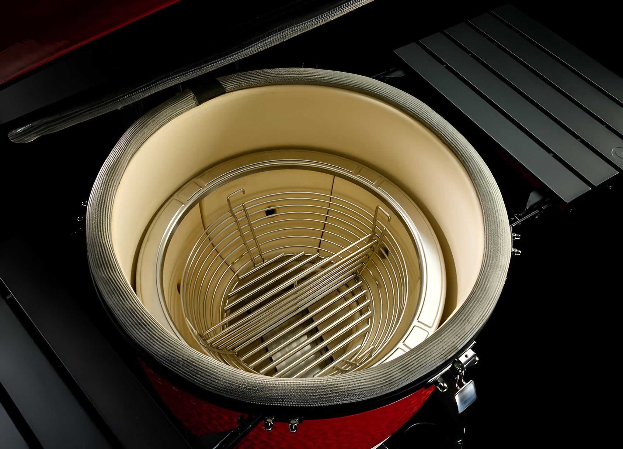 Picture the ease and durability – the heavy-duty powder-coated steel cart (available in the 'w/ Cart' option) brings sturdiness and portability to your grilling sessions. The Air Lift™ hinge effortlessly lifts the heavy ceramic lid, while the double-thick Wire Mesh Fiberglass Gasket ensures a superior, long-lasting air-tight seal.