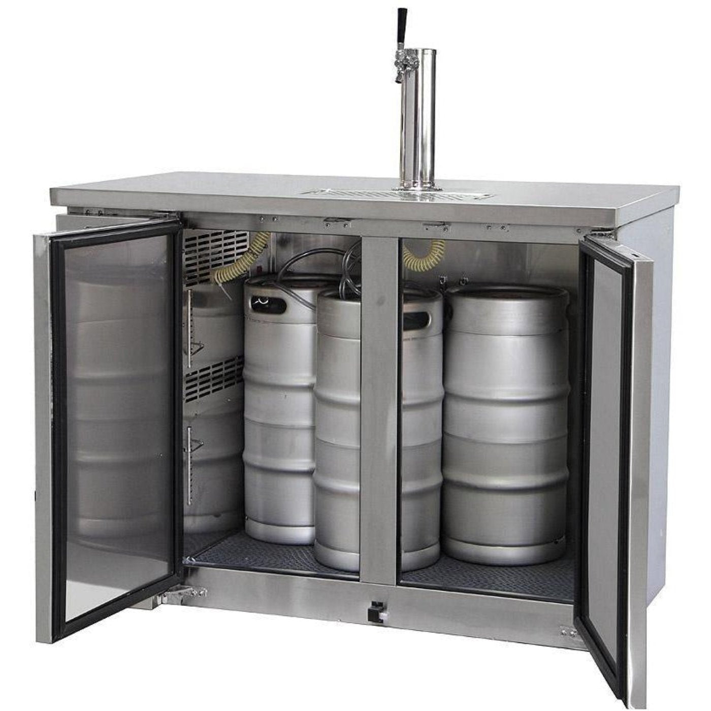 The Kegco XCK-2460B Commercial Kegerator is perfect for pubs, bars, restaurants and events. This beer dispenser has enough interior space to house three full-size kegs or a combination of smaller kegs. With the ability to mount two draft arms, the keg cooler can be outfitted to serve from 2 up to 8 kegs at once! Forced air refrigeration keeps the beer in the kegs ice cold and and hoses direct cold air into each beer tower to ensure the line is cooled all the way to the faucet. This beer dispenser includes two heavy duty adjustable shelves, providing the ultimate in versatility. You can store cans and bottles or keep mugs frosty on one side while dispensing multiple 5 gallon kegs from the other side! Built-in drip trays catch any drops after you fill a glass and route to an external drain, making daily maintenance a breeze.
