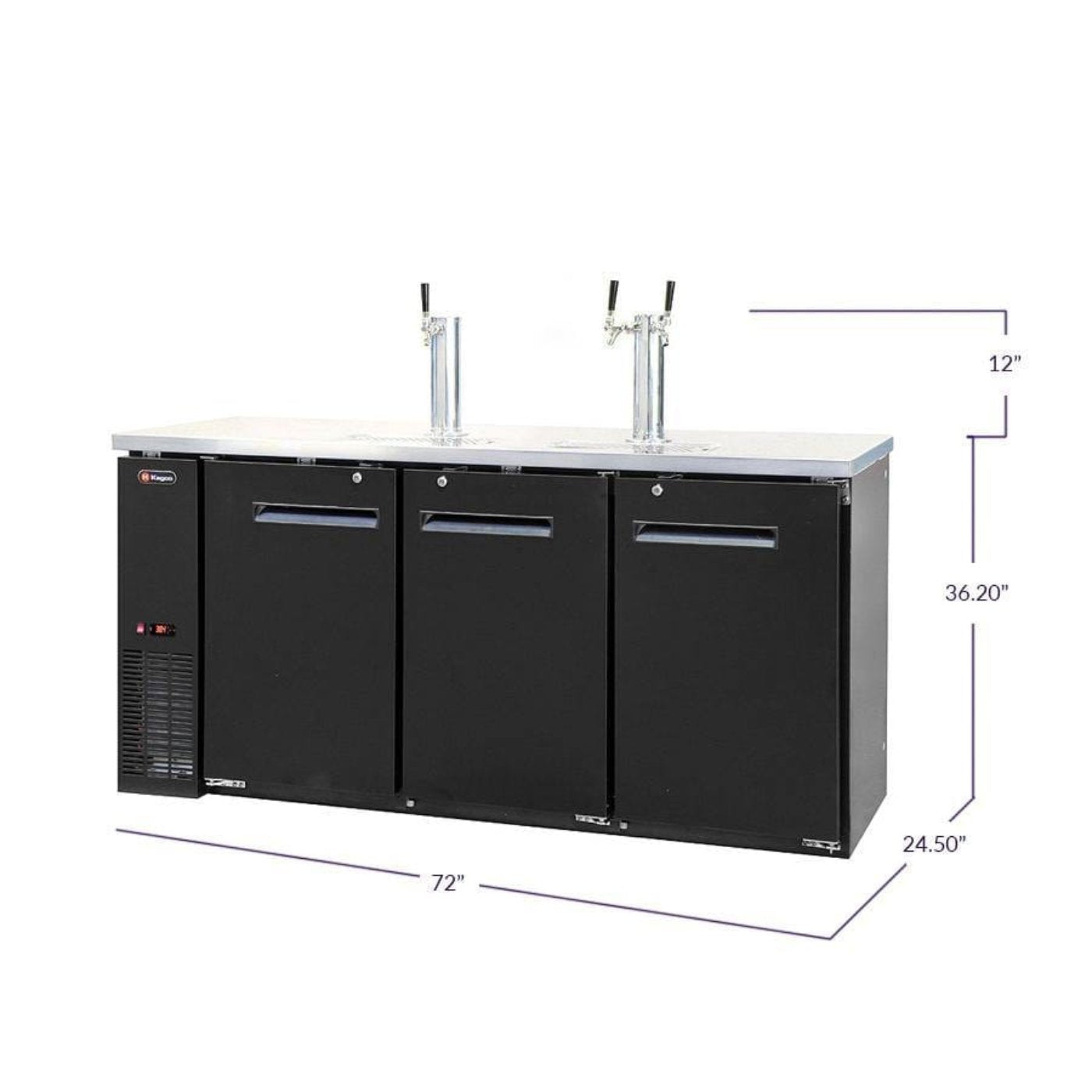 The Kegco XCK-2472B Commercial Kegerator is perfect for pubs, bars, restaurants and events. This beer dispenser has enough interior space to house three full-size kegs or a combination of smaller kegs. With the ability to mount two draft arms, the keg cooler can be outfitted to serve from 2 up to 8 kegs at once! Forced air refrigeration keeps the beer in the kegs ice cold and and hoses direct cold air into each beer tower to ensure the line is cooled all the way to the faucet. This beer dispenser includes two heavy duty adjustable shelves, providing the ultimate in versatility. You can store cans and bottles or keep mugs frosty on one side while dispensing multiple 5 gallon kegs from the other side! Built-in drip trays catch any drops after you fill a glass and route to an external drain, making daily maintenance a breeze.