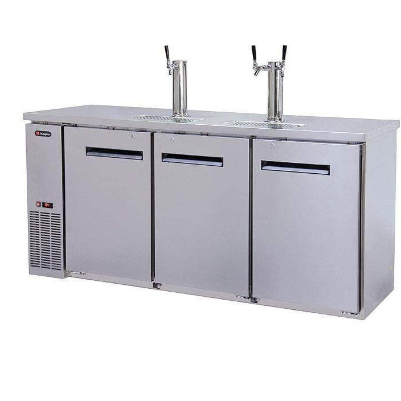 The Kegco XCK-2472S Commercial Kegerator is perfect for pubs, bars, restaurants and events. This beer dispenser has enough interior space to house three full-size kegs or a combination of smaller kegs. With the ability to mount two draft arms, the keg cooler can be outfitted to serve from 2 up to 8 kegs at once! Forced air refrigeration keeps the beer in the kegs ice cold and and hoses direct cold air into each beer tower to ensure the line is cooled all the way to the faucet. This beer dispenser includes two heavy duty adjustable shelves, providing the ultimate in versatility. You can store cans and bottles or keep mugs frosty on one side while dispensing multiple 5 gallon kegs from the other side! Built-in drip trays catch any drops after you fill a glass and route to an external drain, making daily maintenance a breeze.