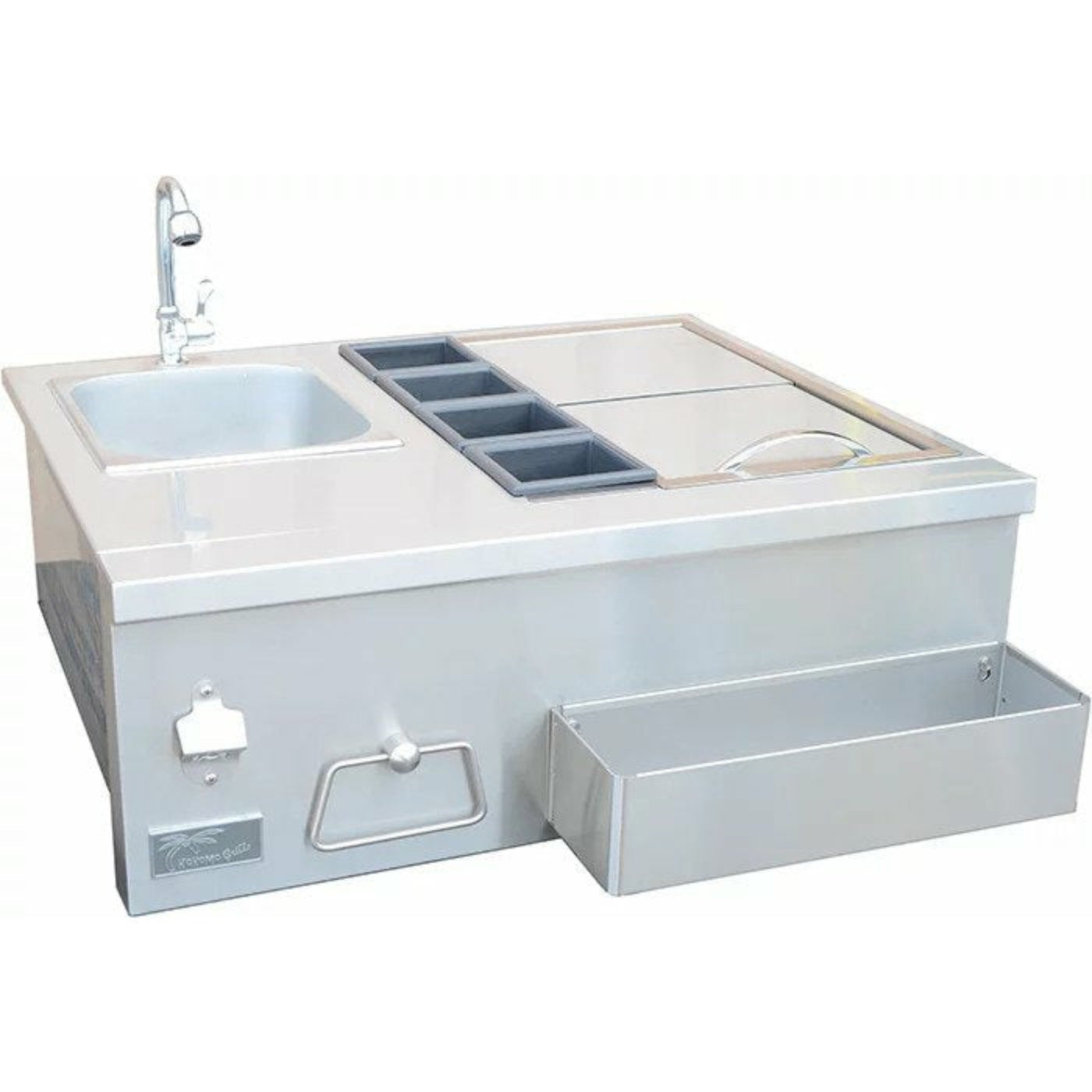 A: This station includes a convenient sink for easy cleanup, a built-in bottle opener for quick access, and an ice chest to keep beverages chilled, providing everything you need to entertain outdoors.