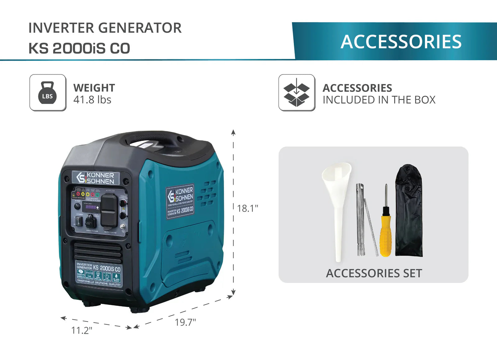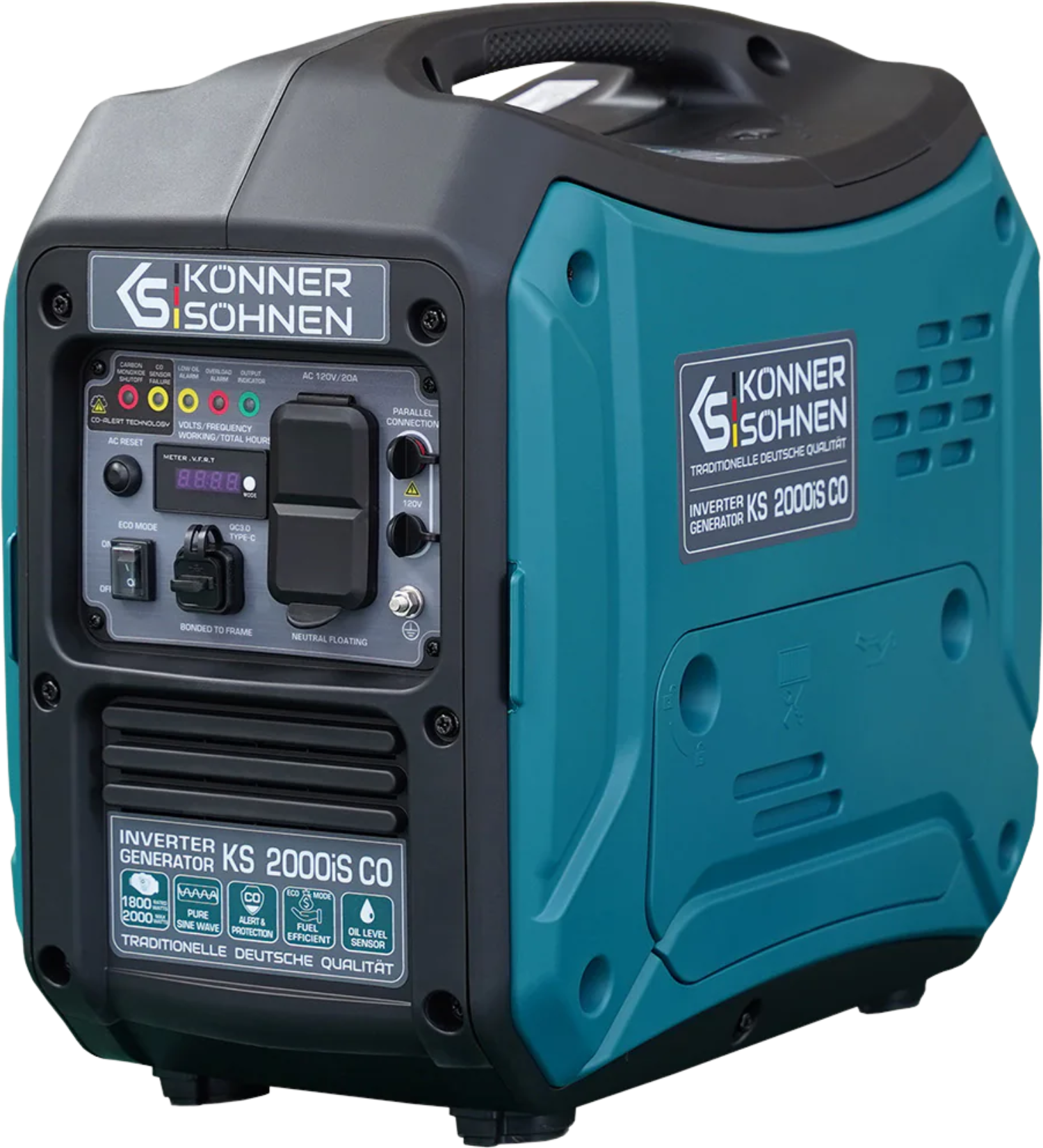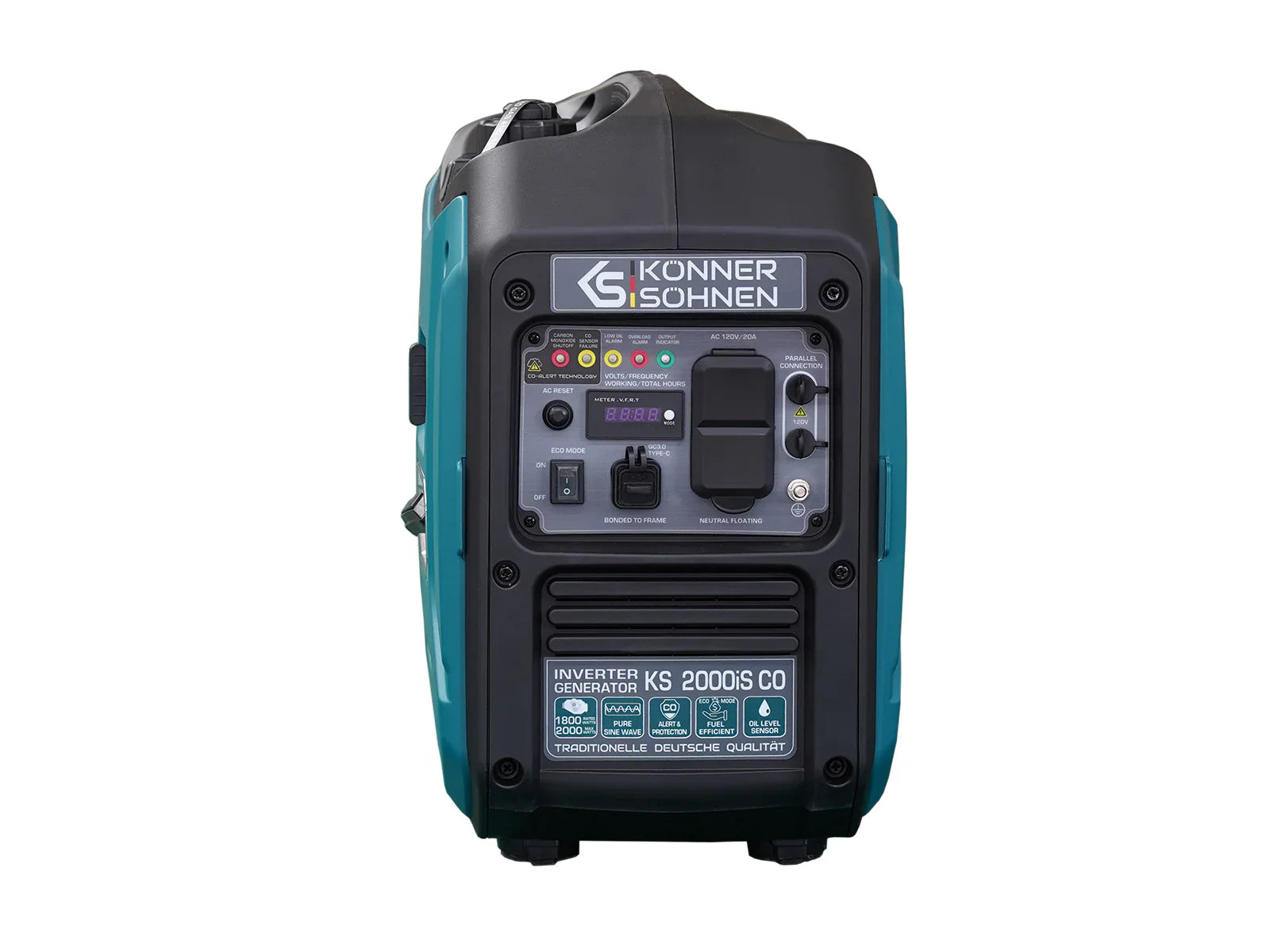 The KS 2000iS CO portable gasoline inverter generator is a convenient, compact, and super quiet source of electric power. It produces electric current with pure sine wave, providing a stable output voltage of 120V 60Hz sinusoidal form, which is suitable for sensitive electronics. The ergonomic control panel is equipped with a LED display, two 120V 20A outlets, and QC3.0 Type-C outlet. Equipped with multiple safety features including low oil sensor, CO sensor and shutoff, and overload monitoring.