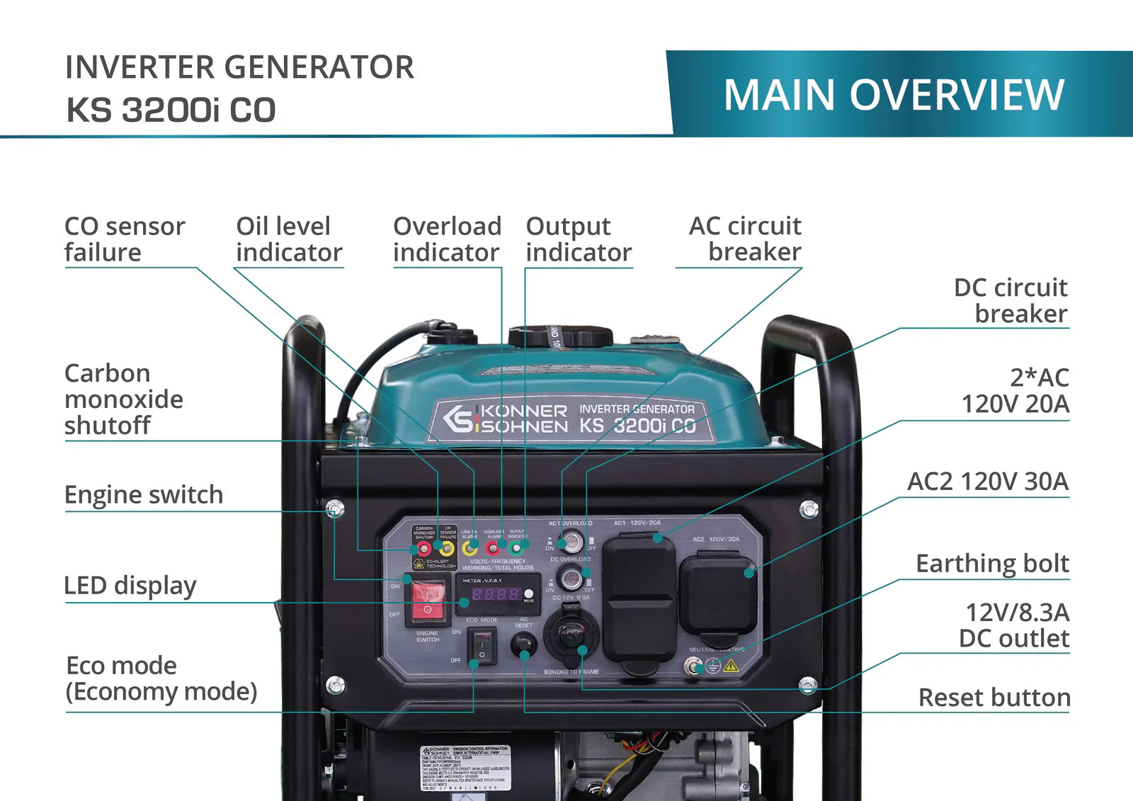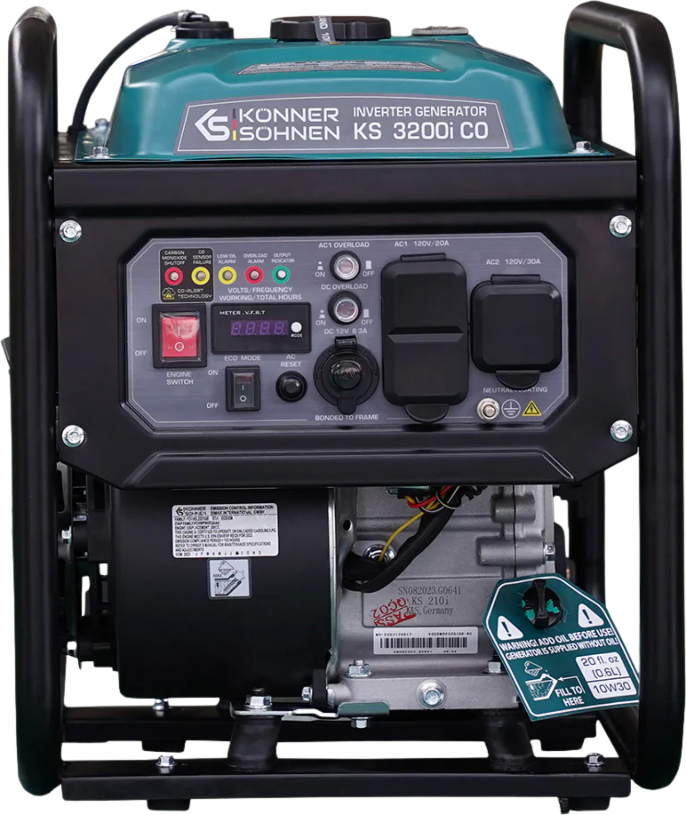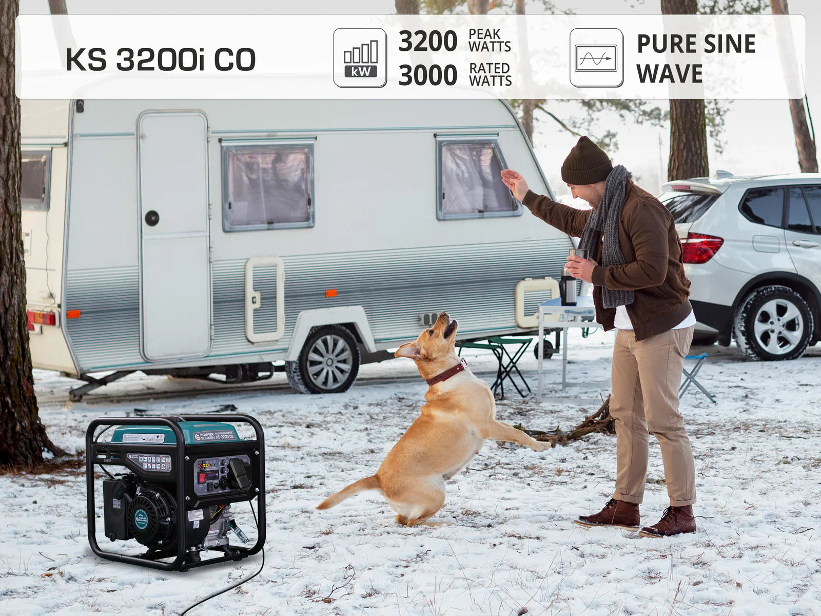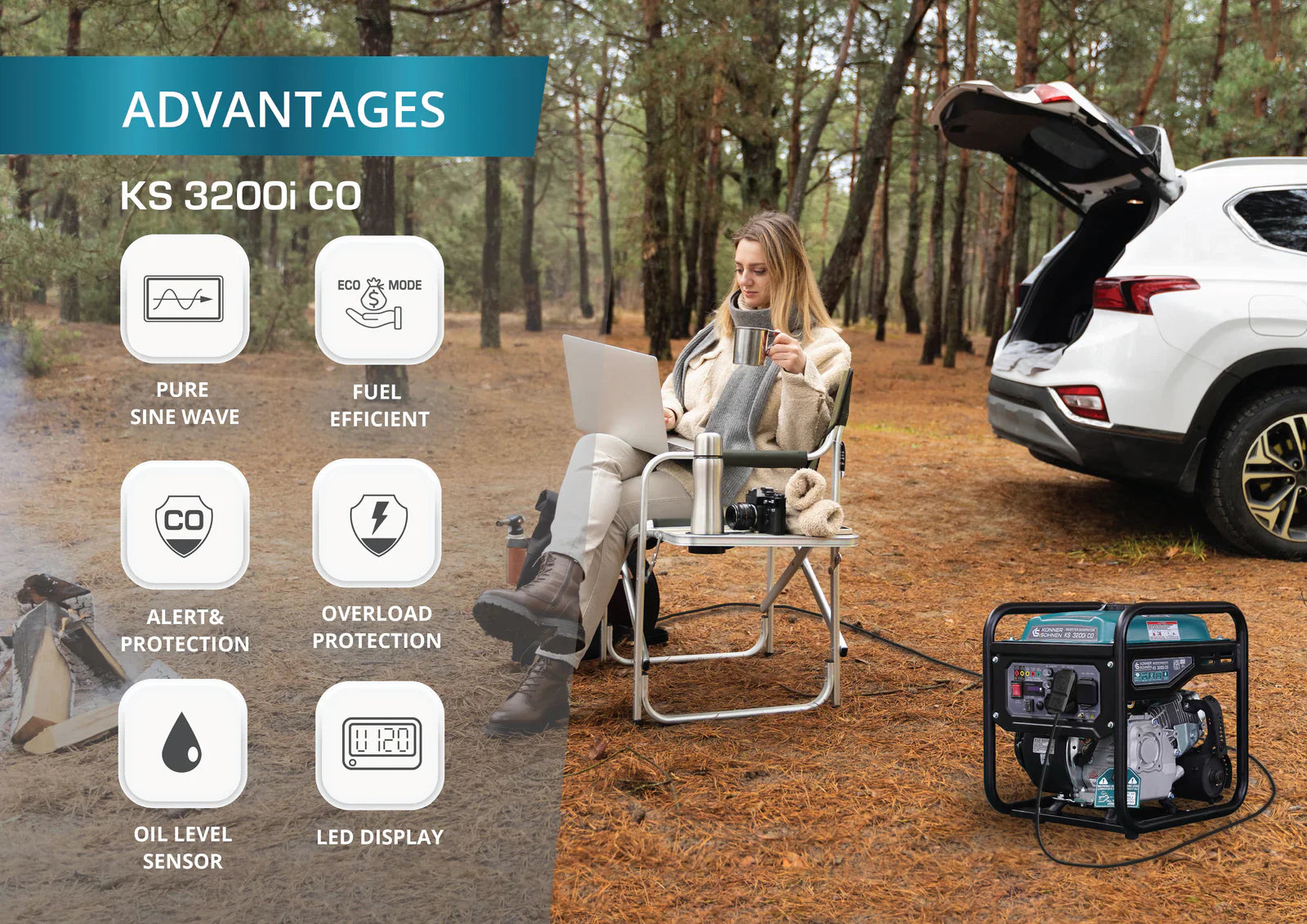 The KS 3200i CO portable inverter generator is a convenient and portable source of electric power. This generator provides a stable output of 120V 60Hz pure sine wave, suitable for the reliable operation of sensitive electronics. It is equipped with various outlets including (2) 20A sockets, 30A socket, and a 12V car outlet. A built-in CO sensor monitors for the accumulation of poisonous carbon monoxide when the engine is running, and automatically shuts down when increased CO levels are detected.