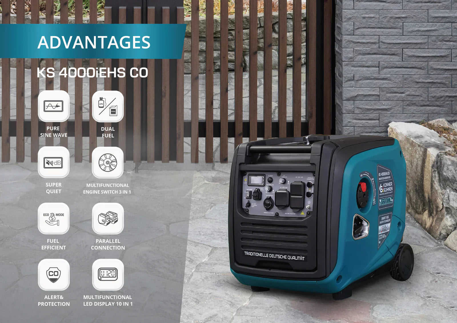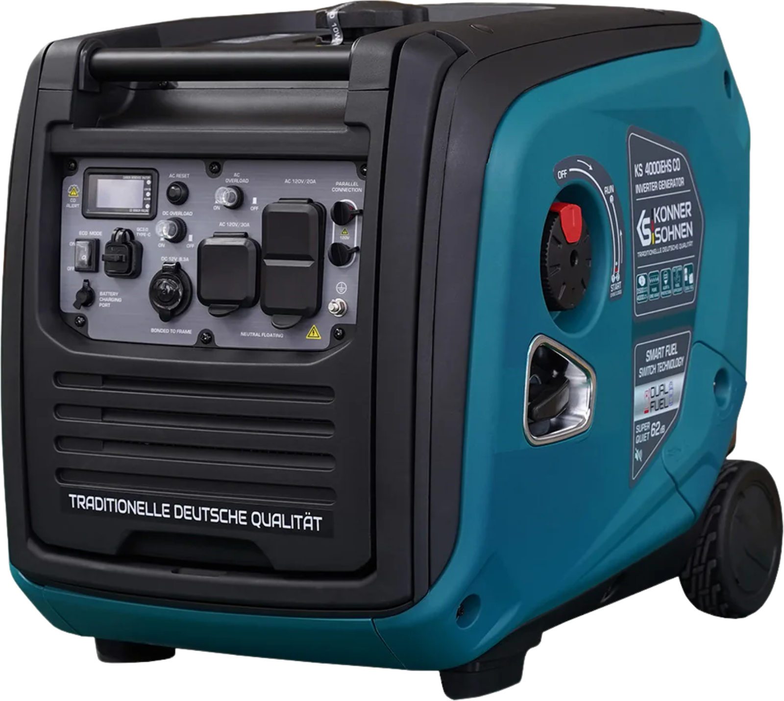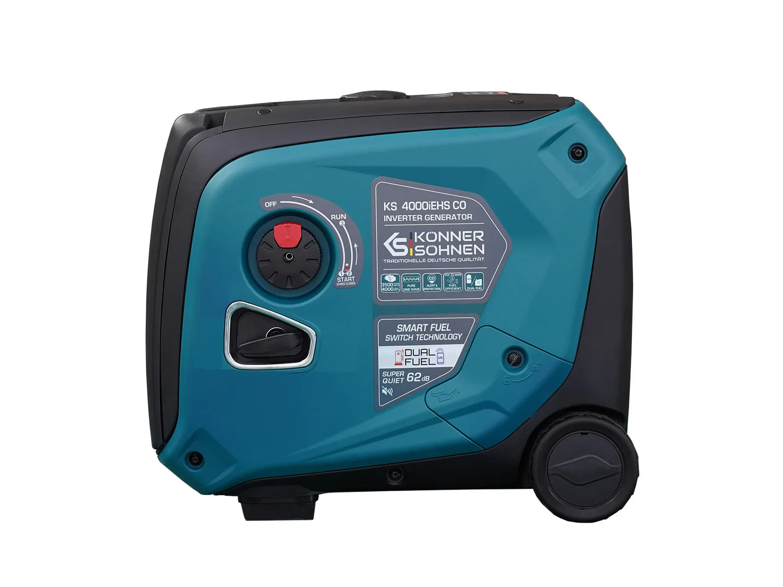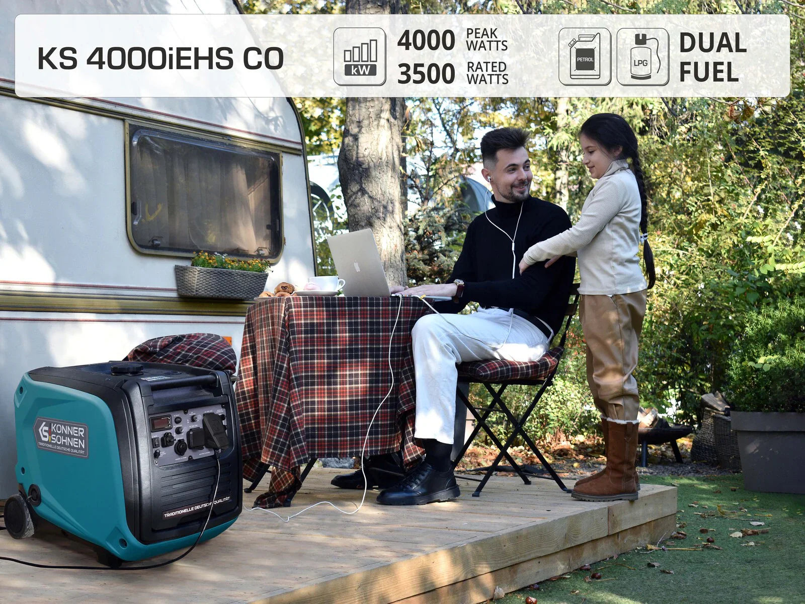 A: The Konner Sohnen KS 4000iEHS CO is a dual-fuel 3500W/4000W inverter generator, designed to run on either LPG or gasoline. It features a CO sensor and provides pure sine wave output for safe and efficient power.