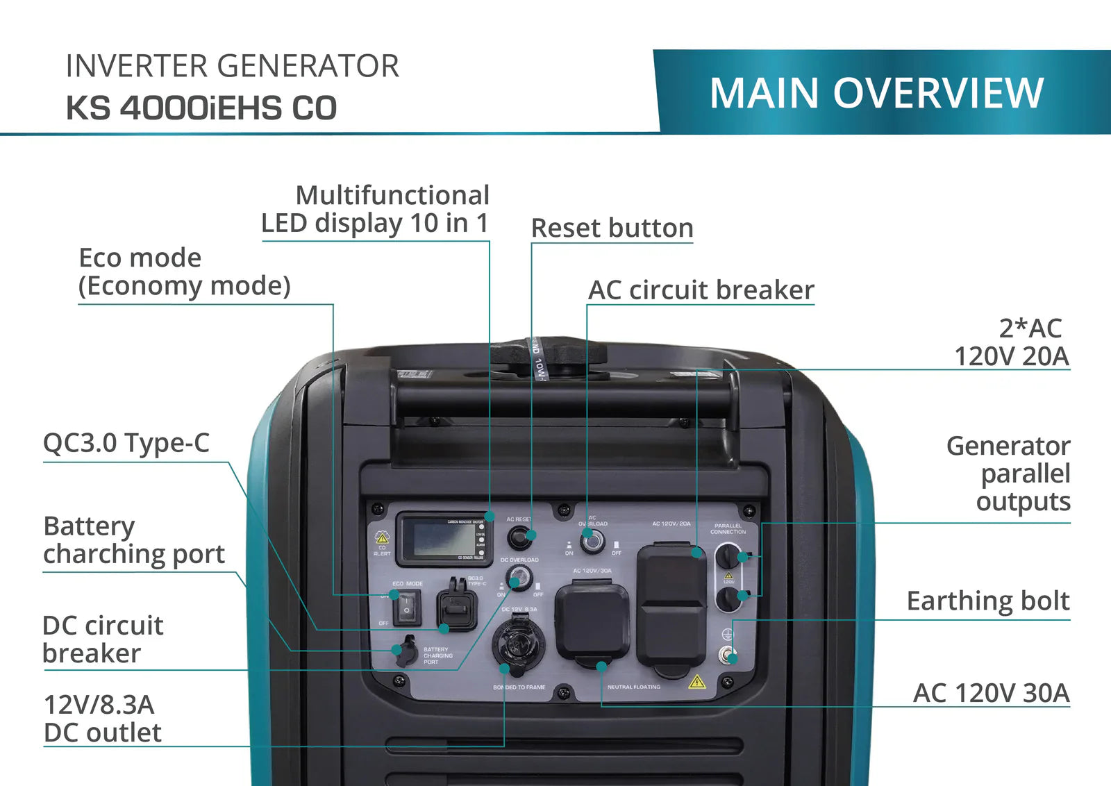 The KS 4000iEHS CO portable inverter generator is a convenient source of electric power with a low noise level. The generator runs on both gasoline and liquified gas (propane) and includes a gas hose with a reducer for connection to a gas cylinder. With inverter technology, it delivers pure sine wave output, ensuring the safe operation of sensitive electronics such as smartphones, laptops, and other devices. Equipped with a DC 12V car socket, (2) 120V 20A outlets, one 30A outlet, and USB quick-charge 3.0 Type-C outlet.