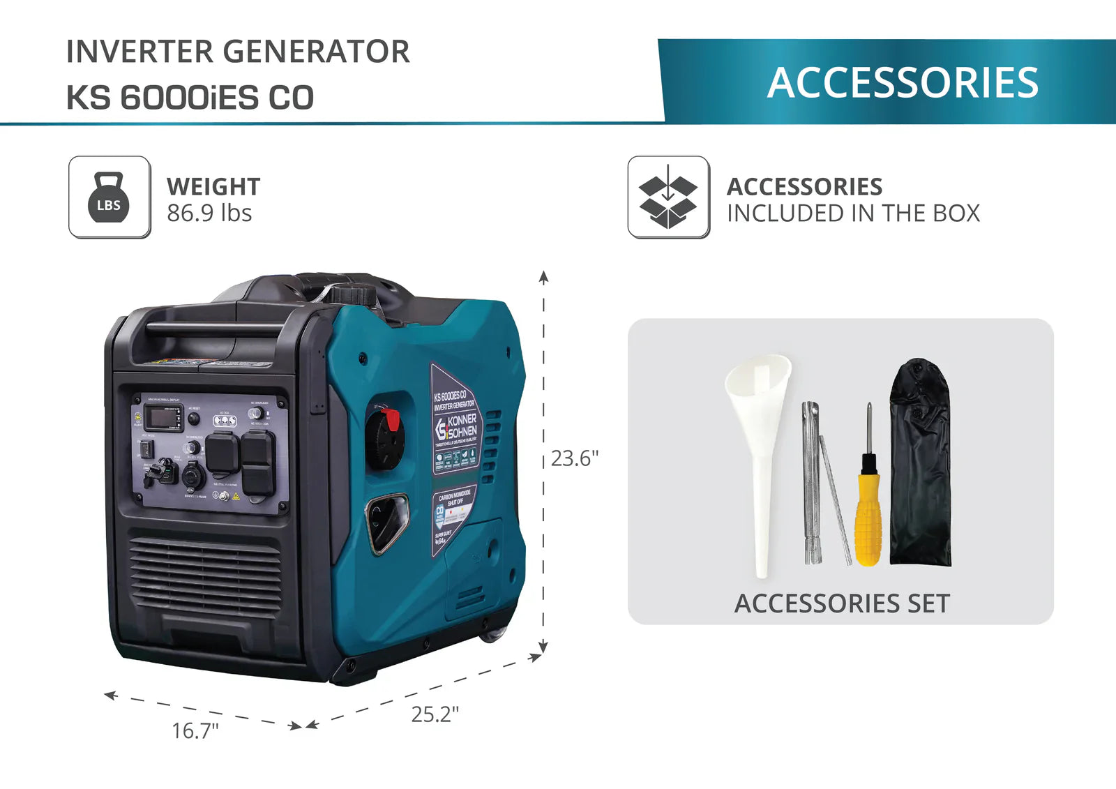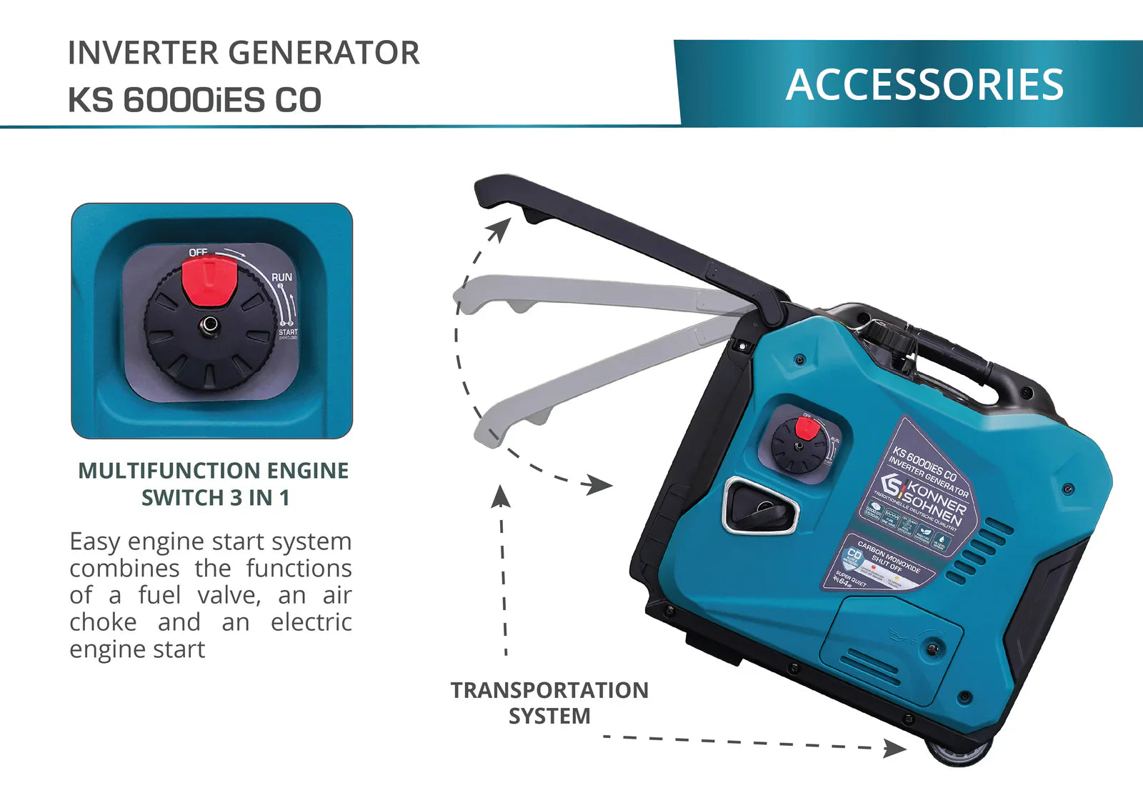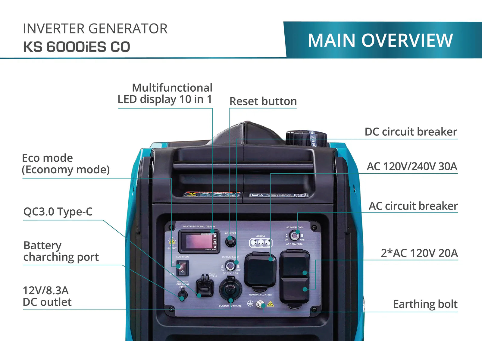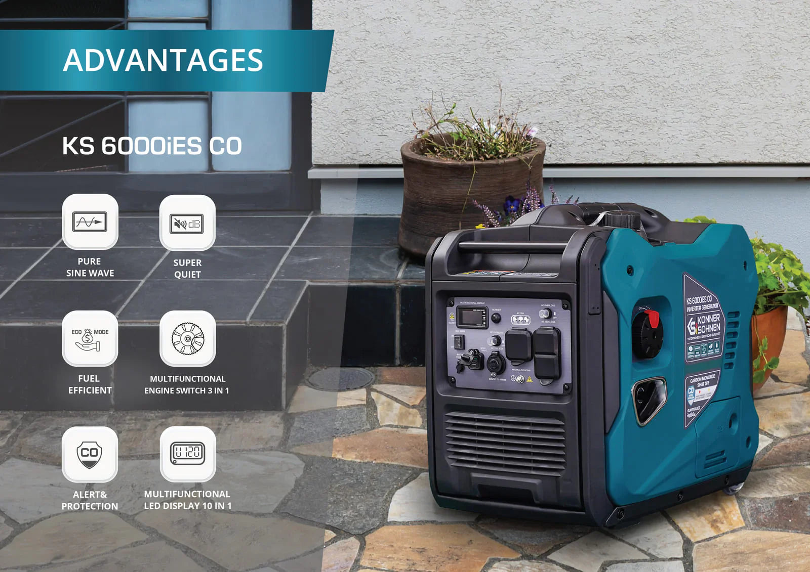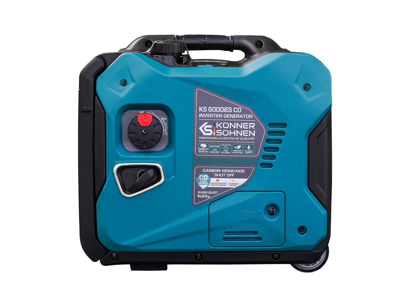 The KS 6000iES CO portable inverter generator is a convenient, compact, and super quiet source of electric power. This generator provides a maximum output of 5500W, with a stable output voltage of 120V 60Hz pure sine wave. It also features a built-in CO sensor, automatically shutting off the unit when unsafe carbon monoxide levels are detected. The 3-in-1 multifunction engine switch combines the functions of a fuel valve, air choke, and electric engine start. Two wheels and a handle that lifts when the generator is moved ensure comfortable transportation and mobility.