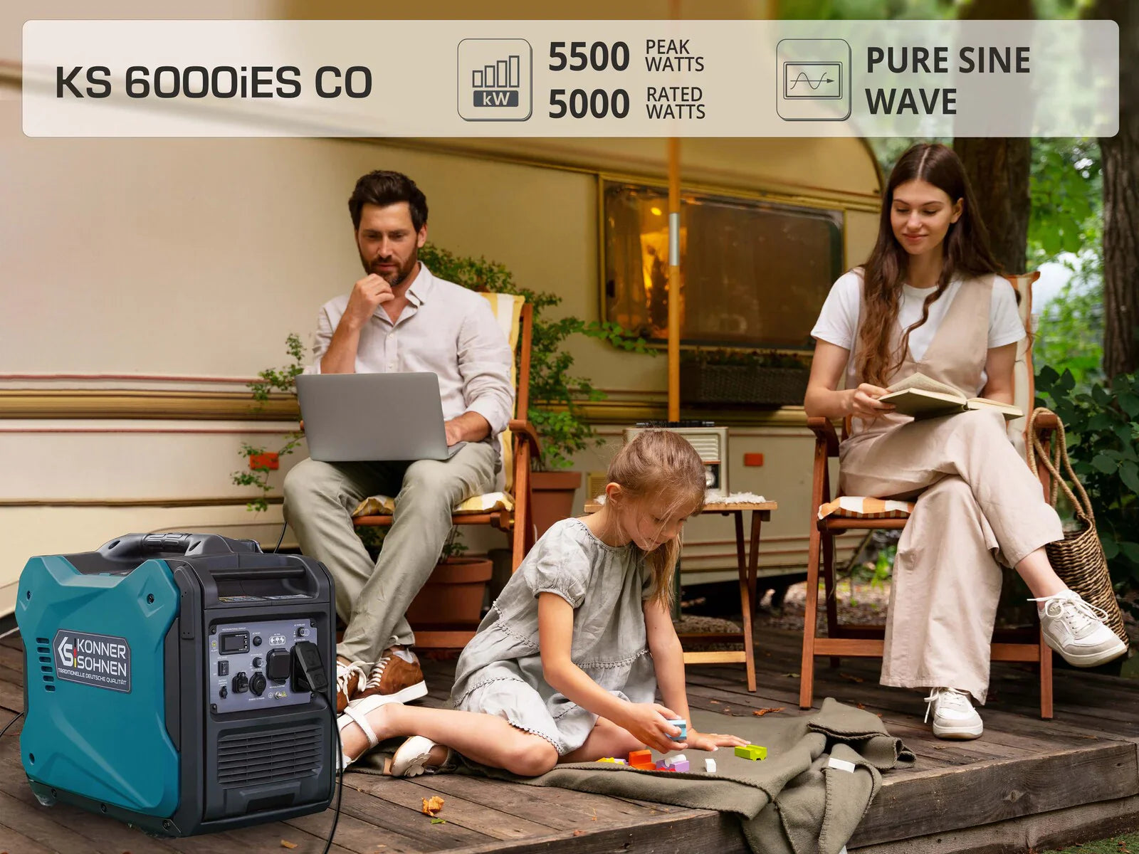 A: The Konner Sohnen KS 6000iES CO is a gas-powered 5000W/5500W inverter generator, featuring a CO sensor and pure sine wave technology, providing safe and reliable power for sensitive electronics.