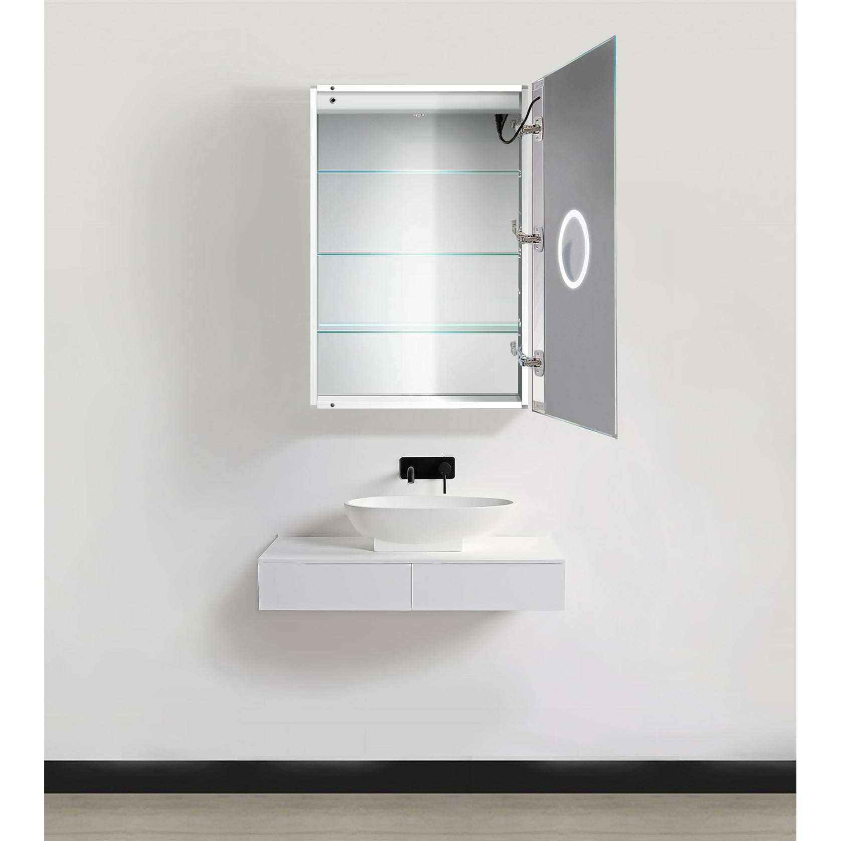 Our LED Medicine Cabinet is a symphony of design elements. We combined our most powerful lighting advancements to create a beautiful storage solution an expression of luxury and function for your bath. From a distance, the LED border produces a striking, modern glow. Up close, enjoy unparalleled light dispersion on the face and body. Effortless to use, a revolutionary touch icon is integrated into the mirror face for seamless on/off toggling and dimming with memory functionality Open the lighted section cabinet to reveal the full suite of amenities. In the mirrored door, a 3x magnified, LED-lit mirror is perfect for detailed makeup application.