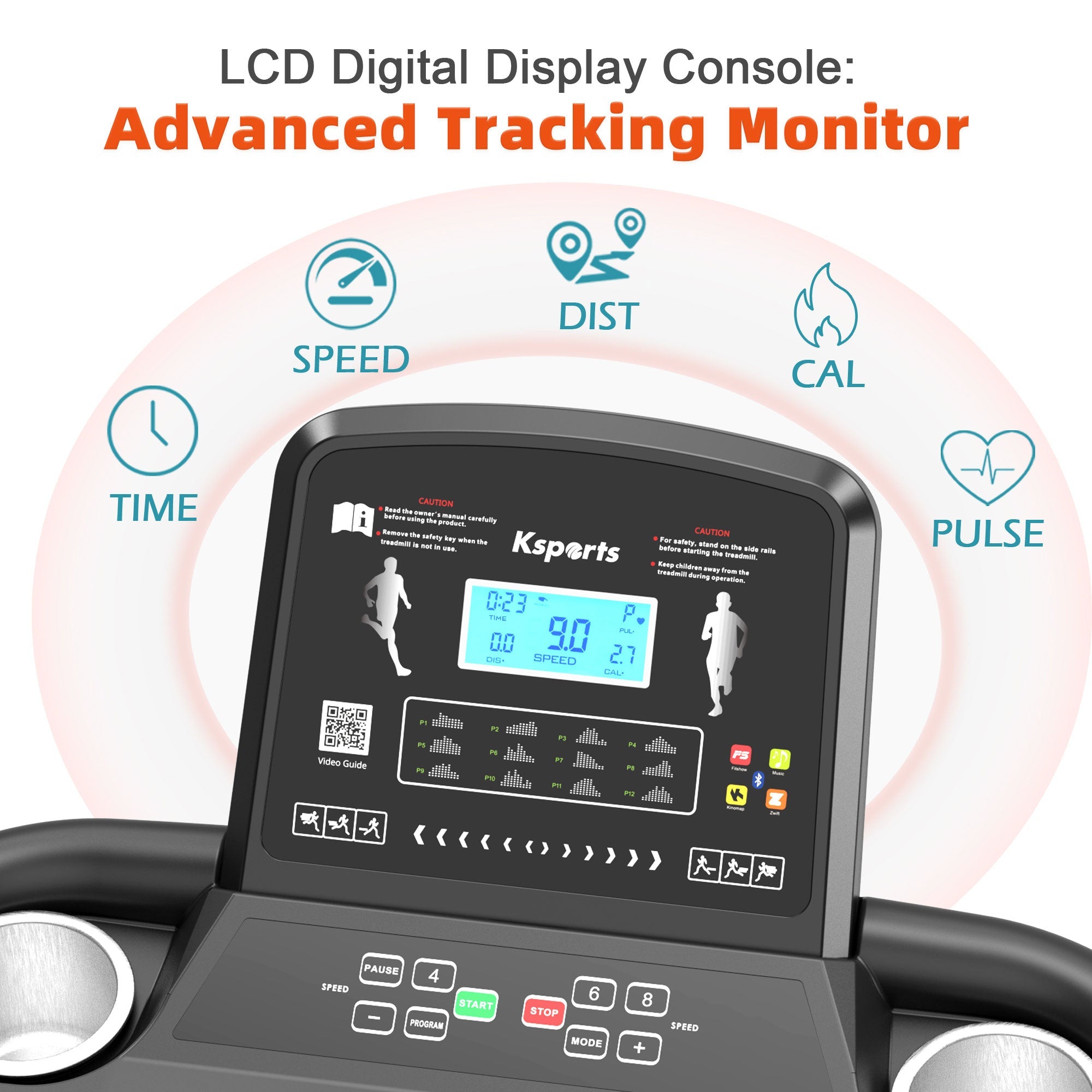 Looking to get back into shape without having to worry about a gym membership or having to worry about the weather? Start your fitness journey with a bang and walk, jog, or run on this Ksports Portable Foldable Home Treadmill with Bluetooth and Fitness Tracking App.This treadmill is great for small spaces, making it the ultimate at-home workout. Designed with the user in mind, the 16-inch ultra-wide running platform lets you wander with the room, and the 2.00-horsepower motor provides a quiet workout environment. This foldable treadmill with built-in wheels makes storing anywhere a breeze, and only simple assembly is required. The treadmill employs advanced technology and comfort and cushioning support, decreasing the impact on your knees and joints while minimizing the strain on your lower body. Pair your smart device with the Bluetooth connectivity option, and when you download the Kinomap, Zwift or FitShow app, you can track and monitor your fitness journey. This cardio machine has a built-in LCD display panel with a Bluetooth speaker to listen to your favorite music while working out. The treadmill features controllable speeds from 0.60 to 8 Mph, over 4 levels of manual inclines, and 12 preset personalized workout programs.Kick your at-home fitness journey off right with the Ksports Portable Foldable Home Treadmill.