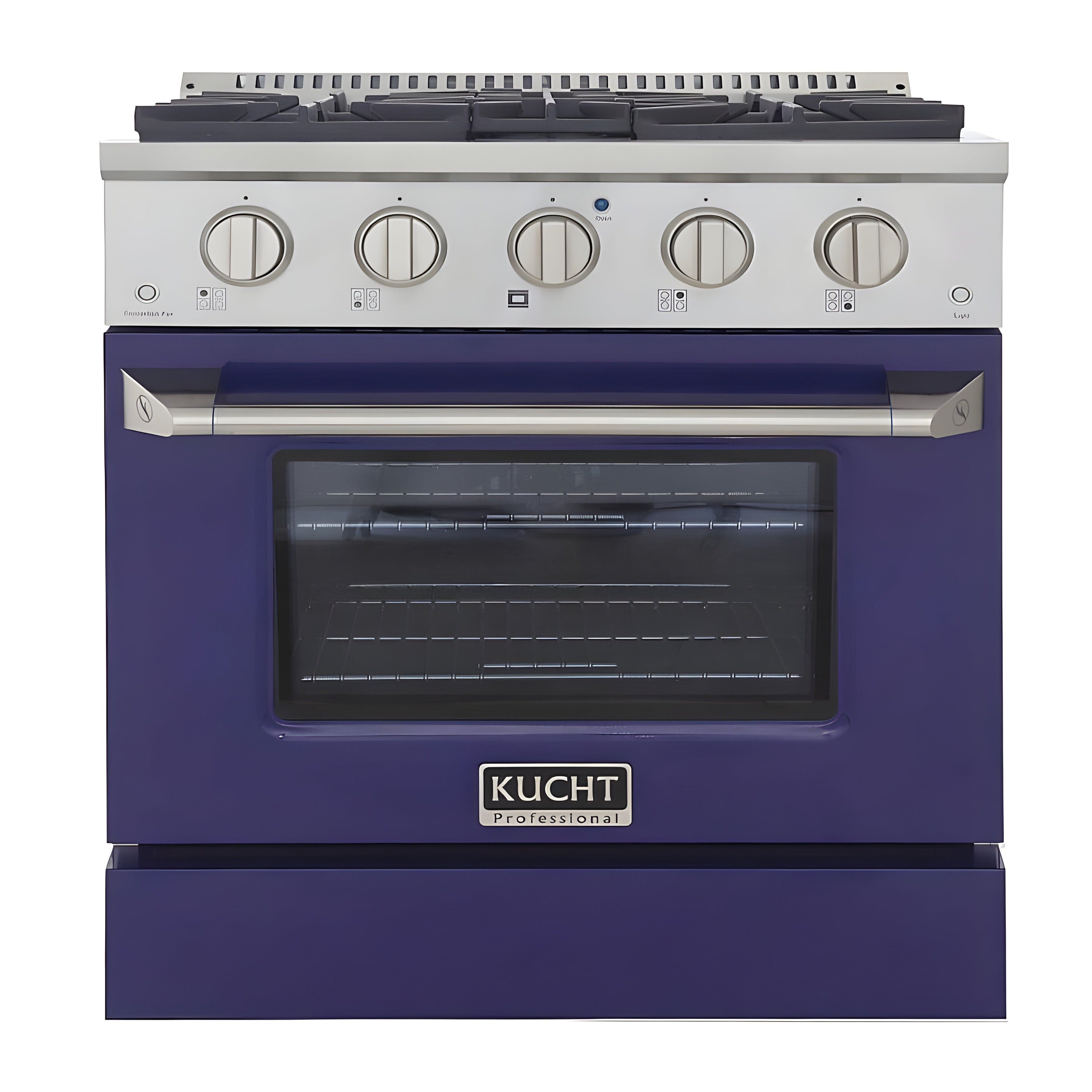 A: This 30” dual fuel range features a 4-burner natural gas cooktop, a 5.2 cu. ft. electric convection oven, and a bold blue finish, combining professional-grade cooking power with style.