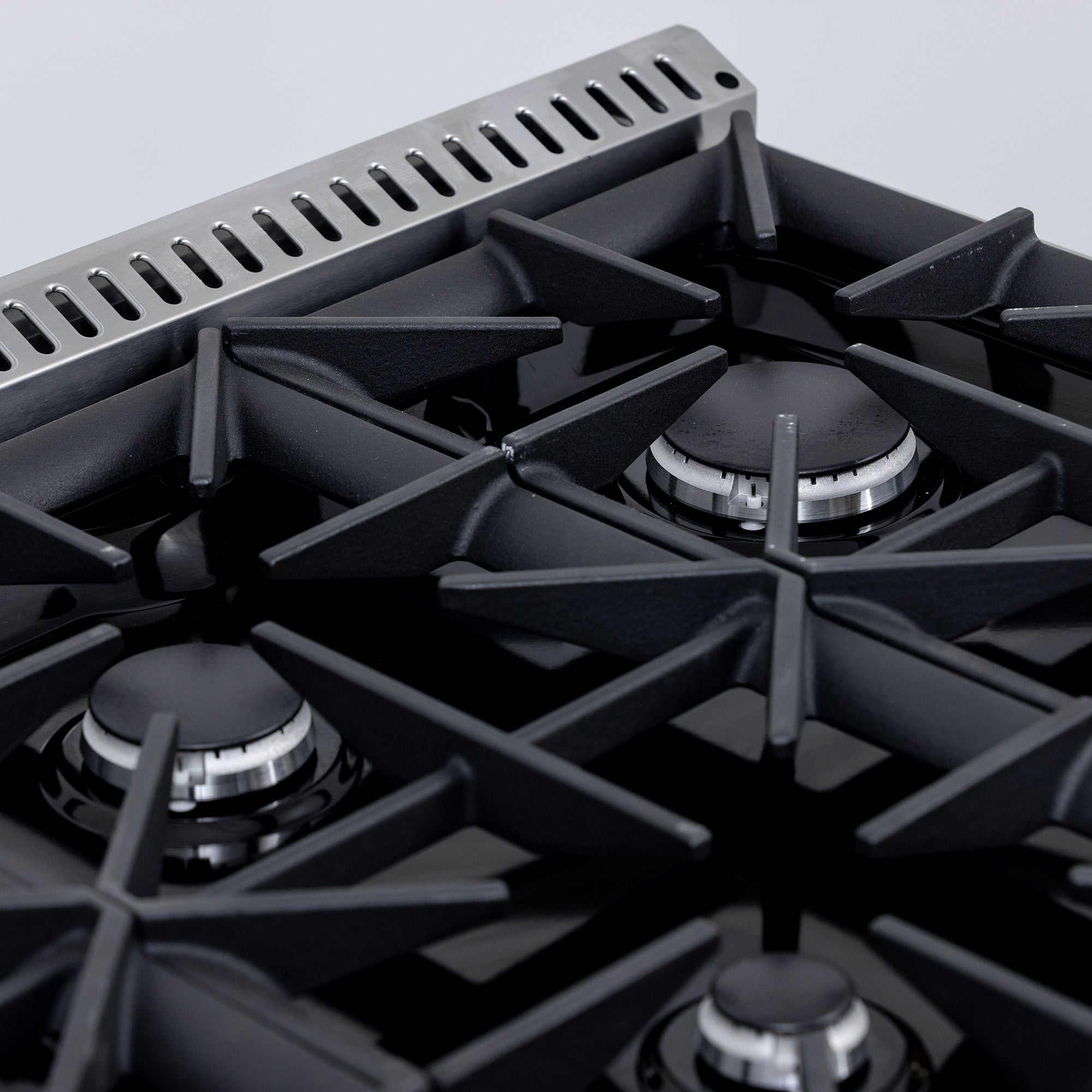 A: It includes six powerful gas burners, a 5.2 cu. ft. oven, a digital thermostat for precise temperature control, convection cooking, and a sleek stainless steel finish.
