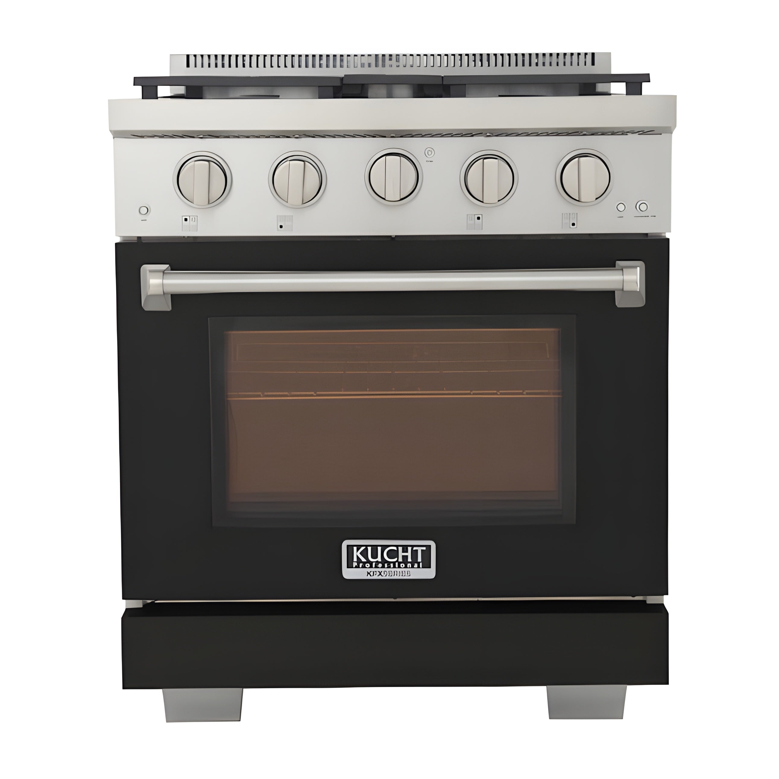 A: The Kucht KFX300/LP-BK is a 30-inch professional propane gas range with a 4.2 cu. ft. oven. It features a sleek black exterior with silver accents, offering both high performance and stylish design for your kitchen.