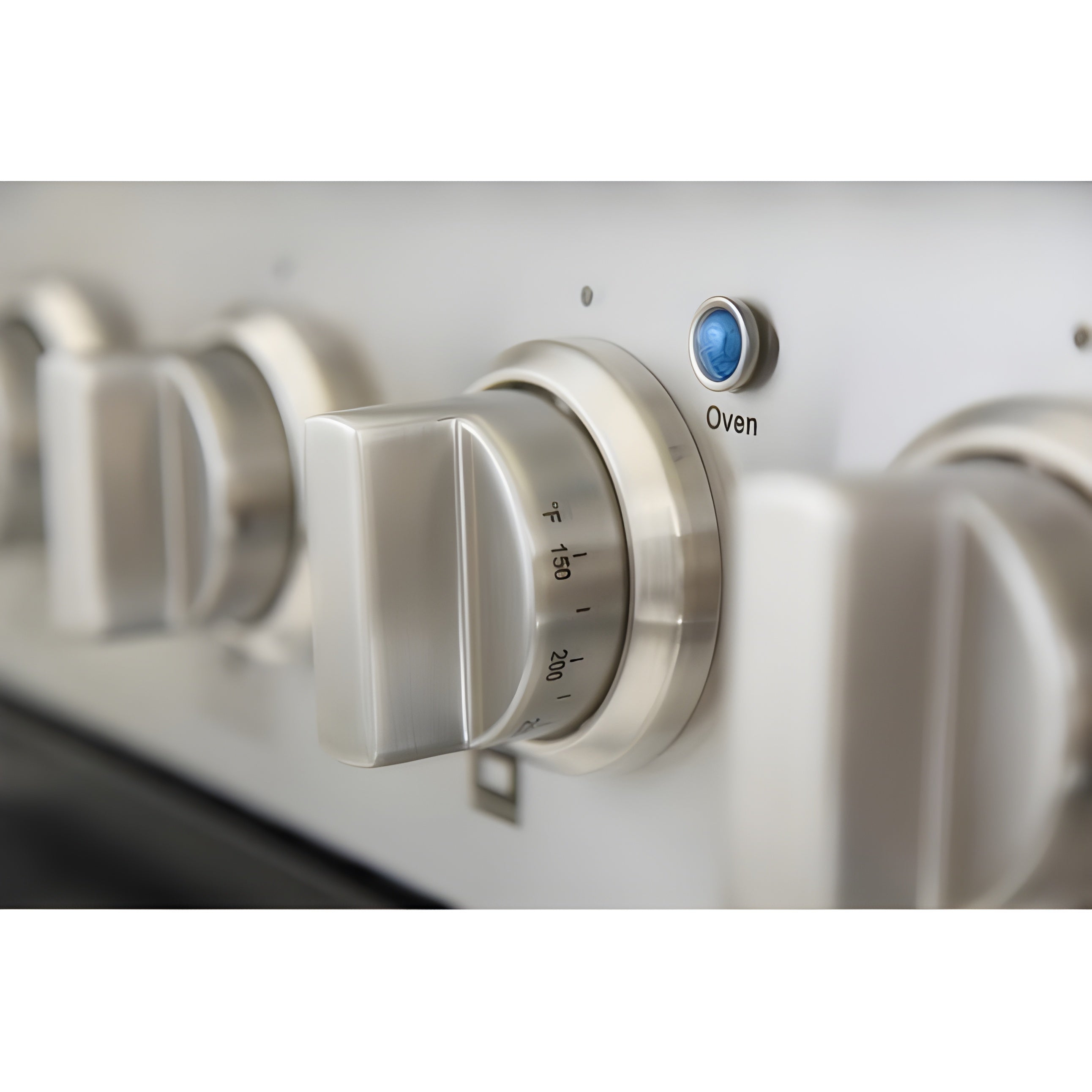 A: The Kucht KNG361-W features a stylish white oven door with silver knobs, adding a clean, modern look to your kitchen.