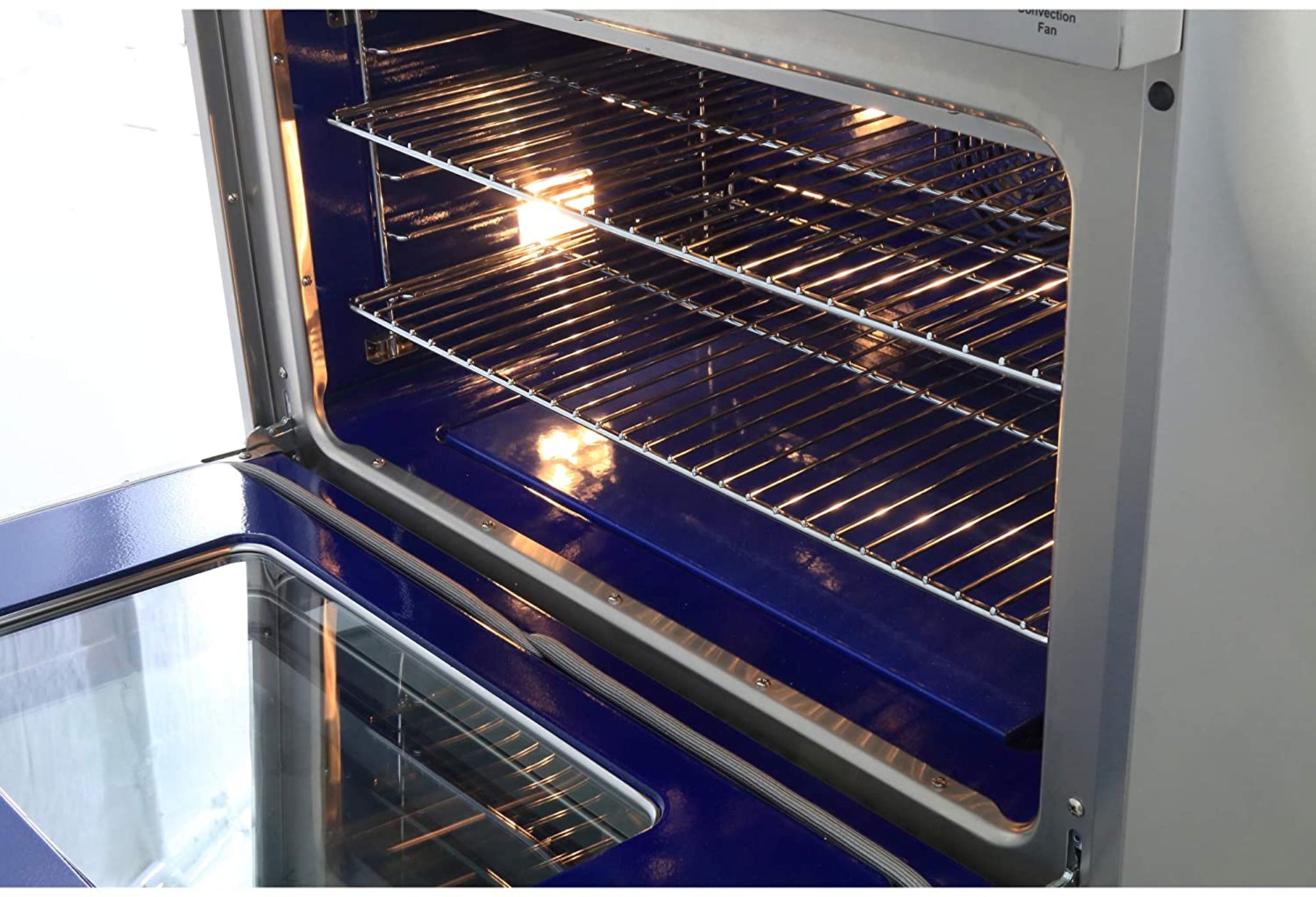 The 36" professional-class range features increased burner power ranging from 12000 BTU to 18000 BTU. The 22000 BTU convection oven features 5.2 cu. ft. capacity and blue porcelain interior as well as a broil pan, 2 racks and 2 halogen lights. The extra large 2 layers glass window makes the cooking dish visible and adds up to the sleek design of the range.