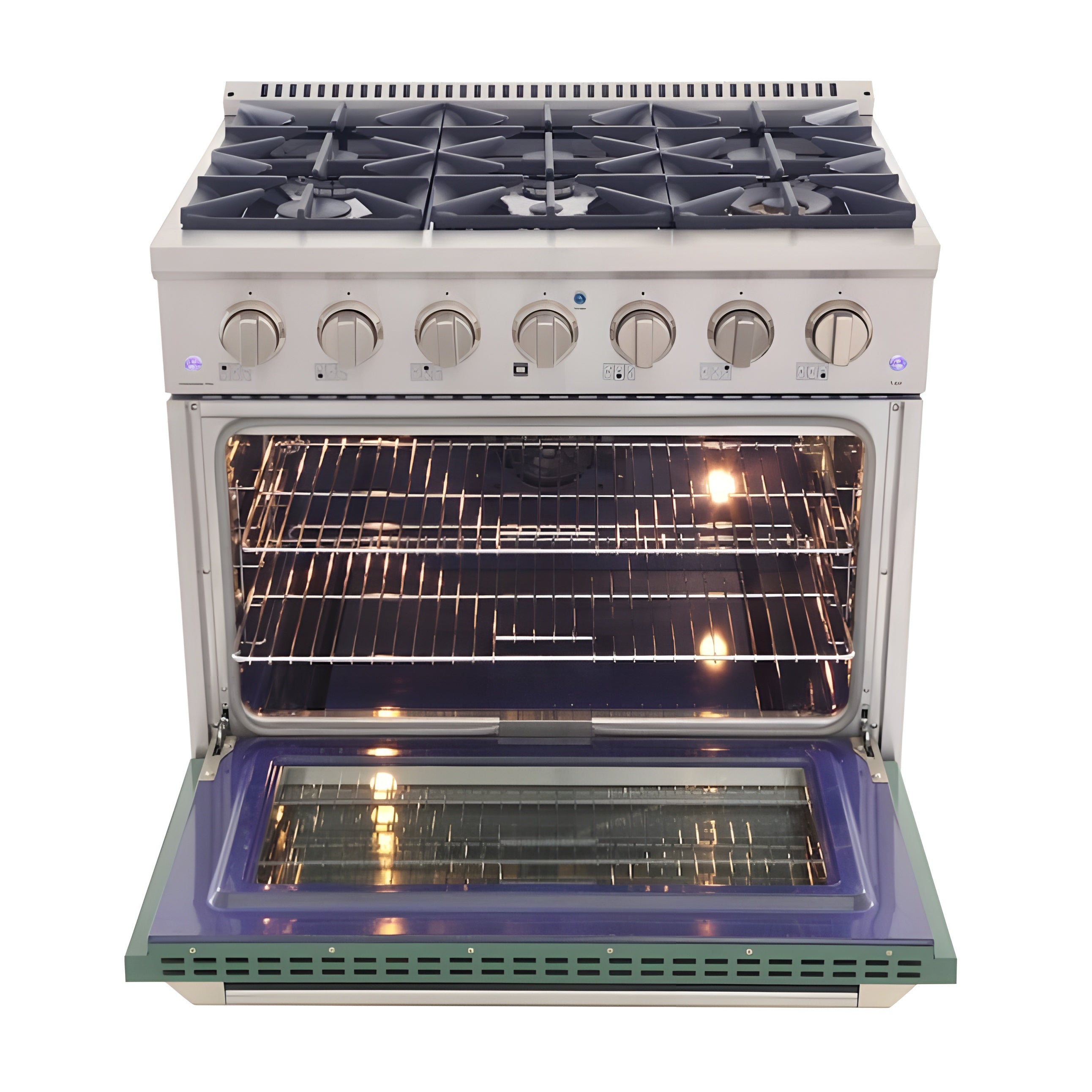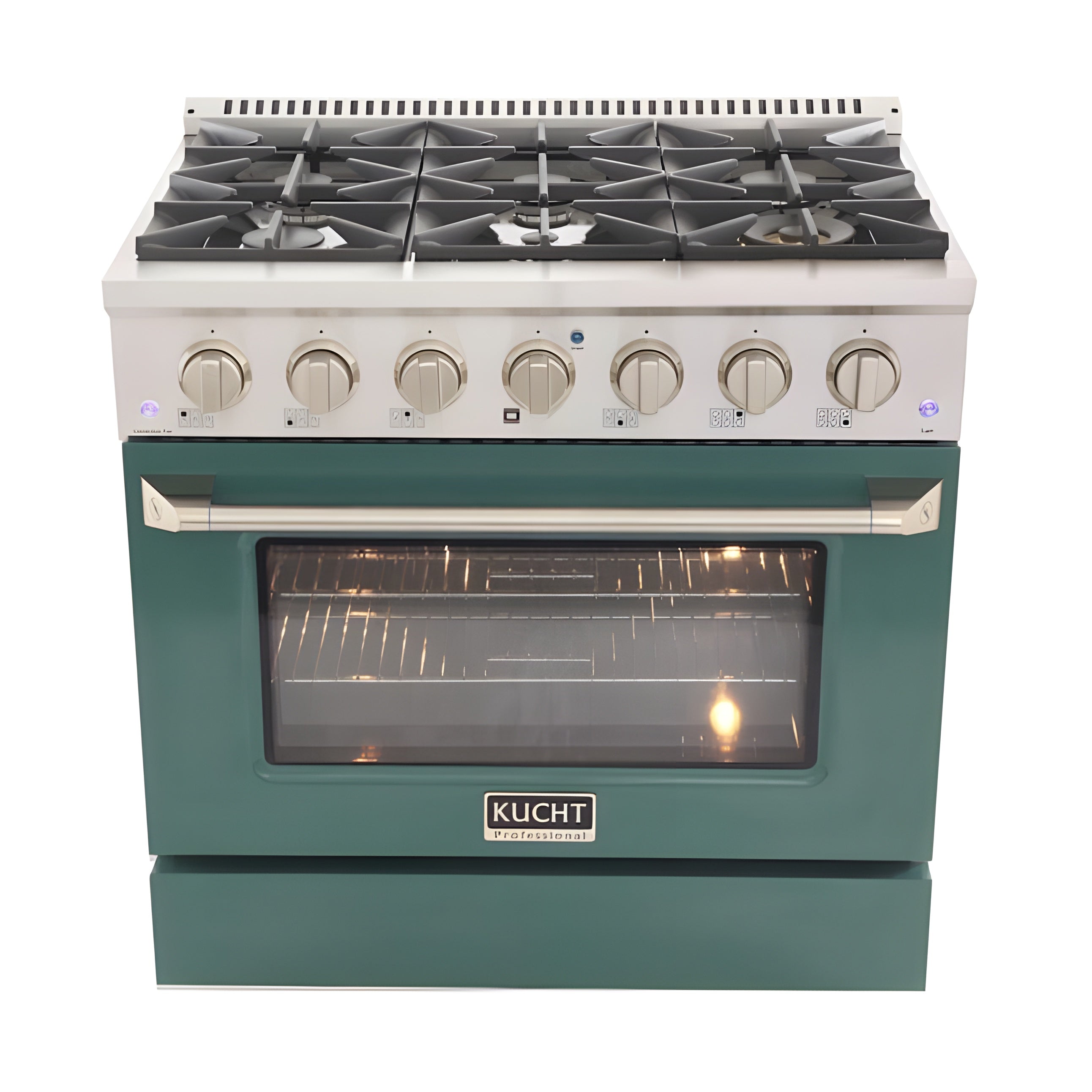 The Kucht Professional 36 in. 5.2 cu ft. Propane Gas Range with Green Door and Silver Knobs (KNG361/LP-G) offers outstanding cooking power with a unique, eye-catching design. Here's why it's a standout choice for your kitchen: