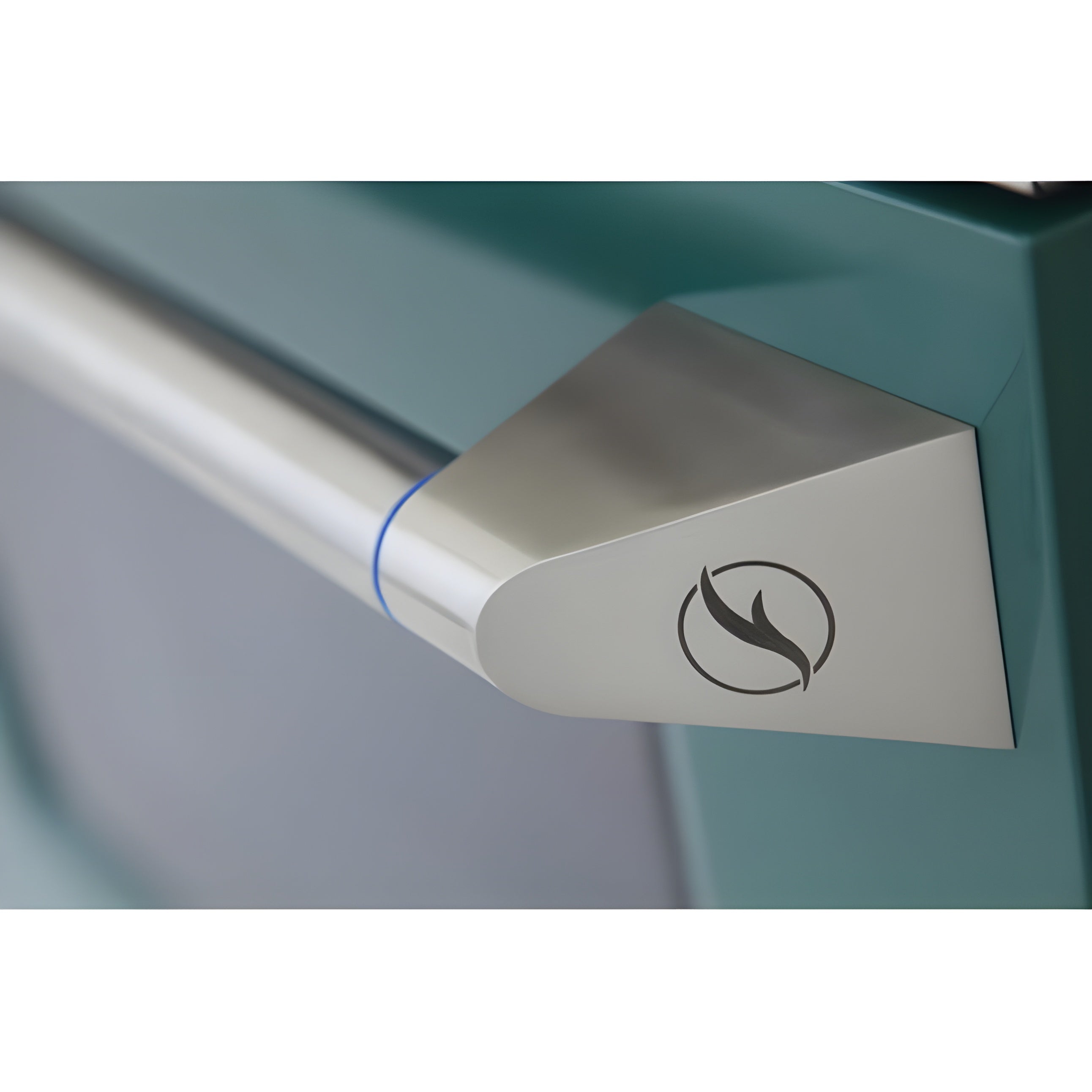 Green Door with Silver Knobs: The unique green door paired with sleek silver knobs creates a bold and modern look, making this range a striking focal point in any kitchen.