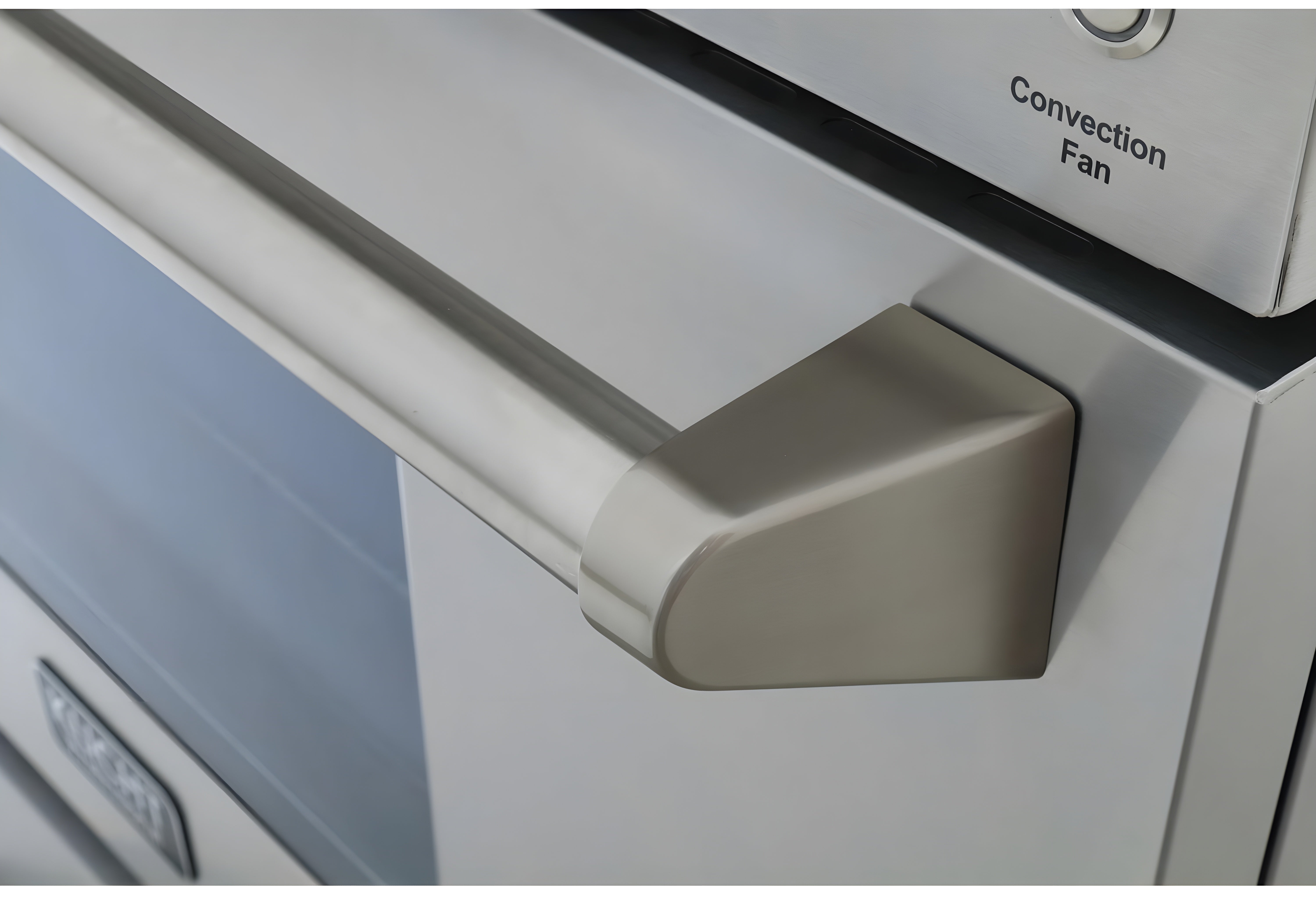 A: The range has a sleek stainless steel finish with stylish silver knobs, adding a modern, professional look to your kitchen.