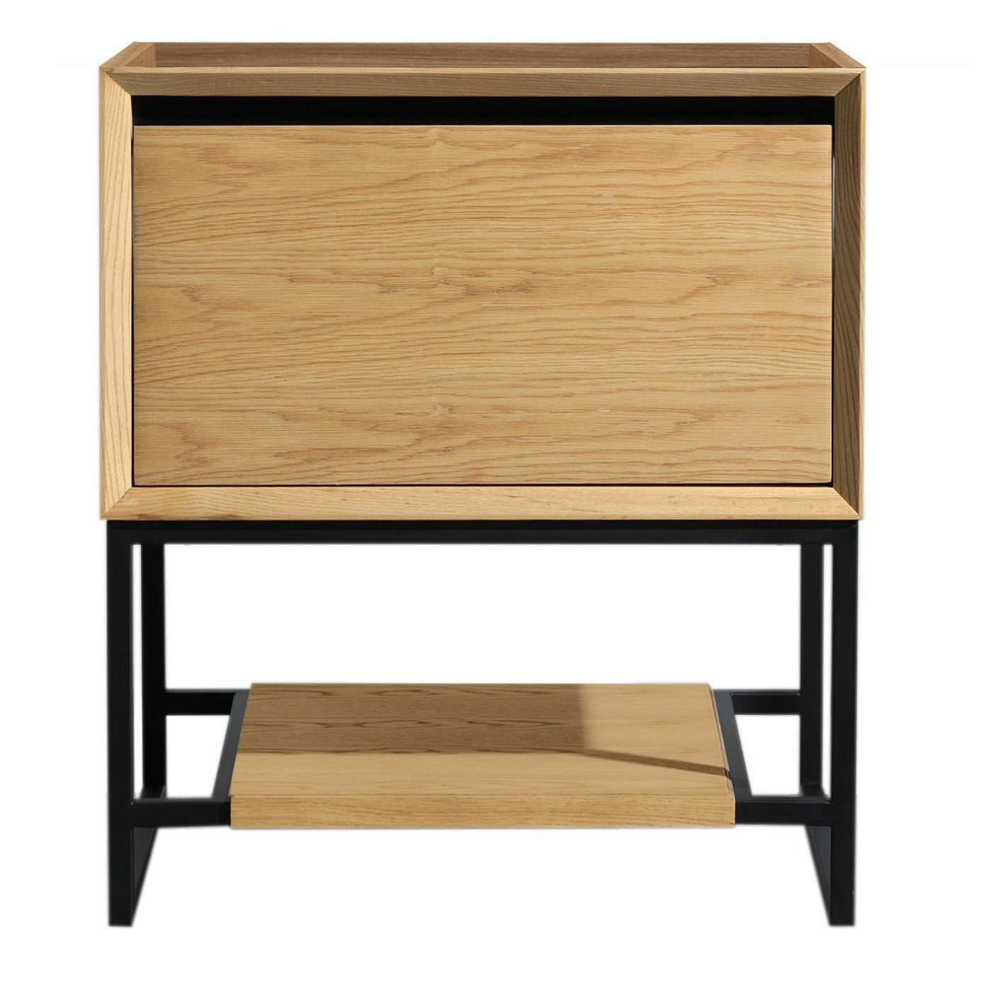 Elevate your space with the Alto Collection! This vanity will bring the New York penthouse vibe to your house. Its straight, simplistic lines and open bottom concept the Alto collection offers elegance with a modernistic approach. The optional open bottom shelf can be removed so the vanity can be both wall mounted or with legs to fit any bathroom design. The matte black, powder coated steel legs and black paint above the drawer offers contrast and sheik style. Additionally, the handless drawer design is embedded within an inner beveled frame. All this is accompanied with soft closing rails, dovetail construction drawers, and solid oak wood frame. Make the Alto collection the statement piece in your bathroom!