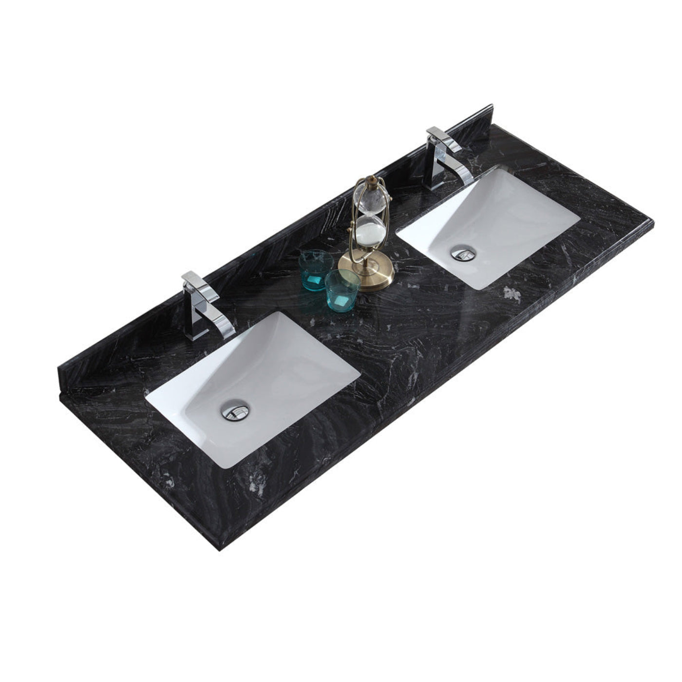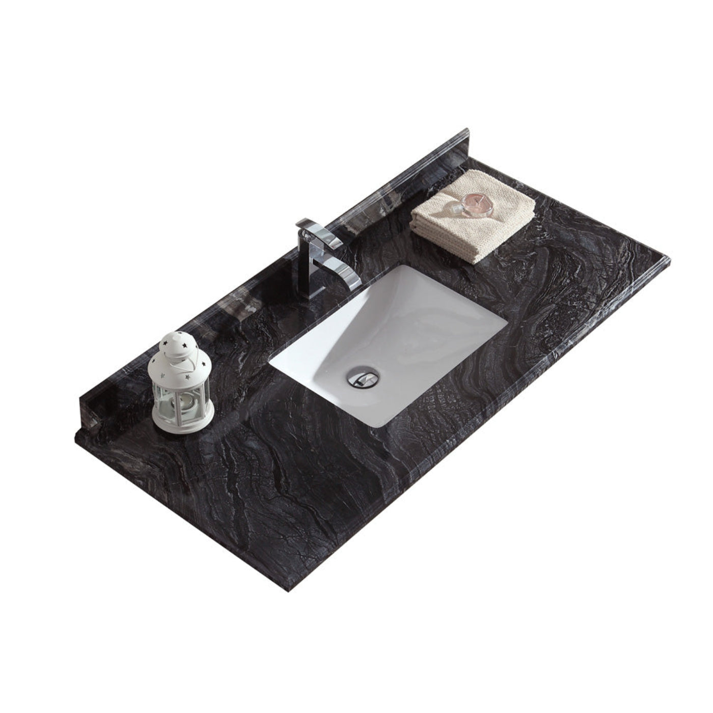 A: The countertop is crafted from premium materials, honed and polished by hand to create a smooth, durable surface with a luxurious black wood appearance.