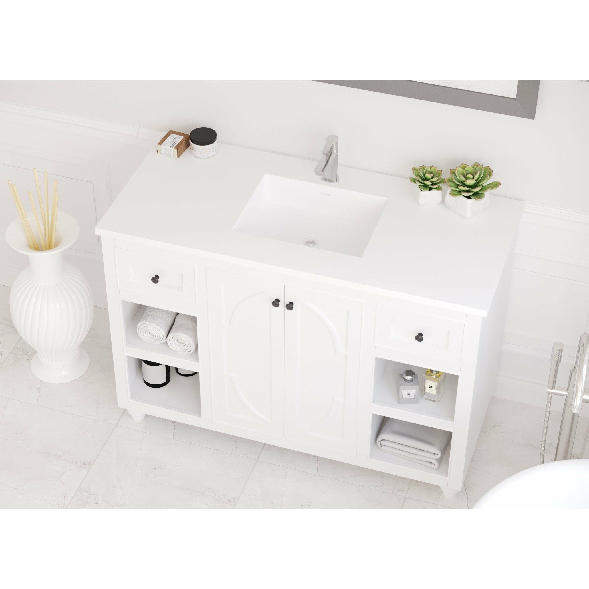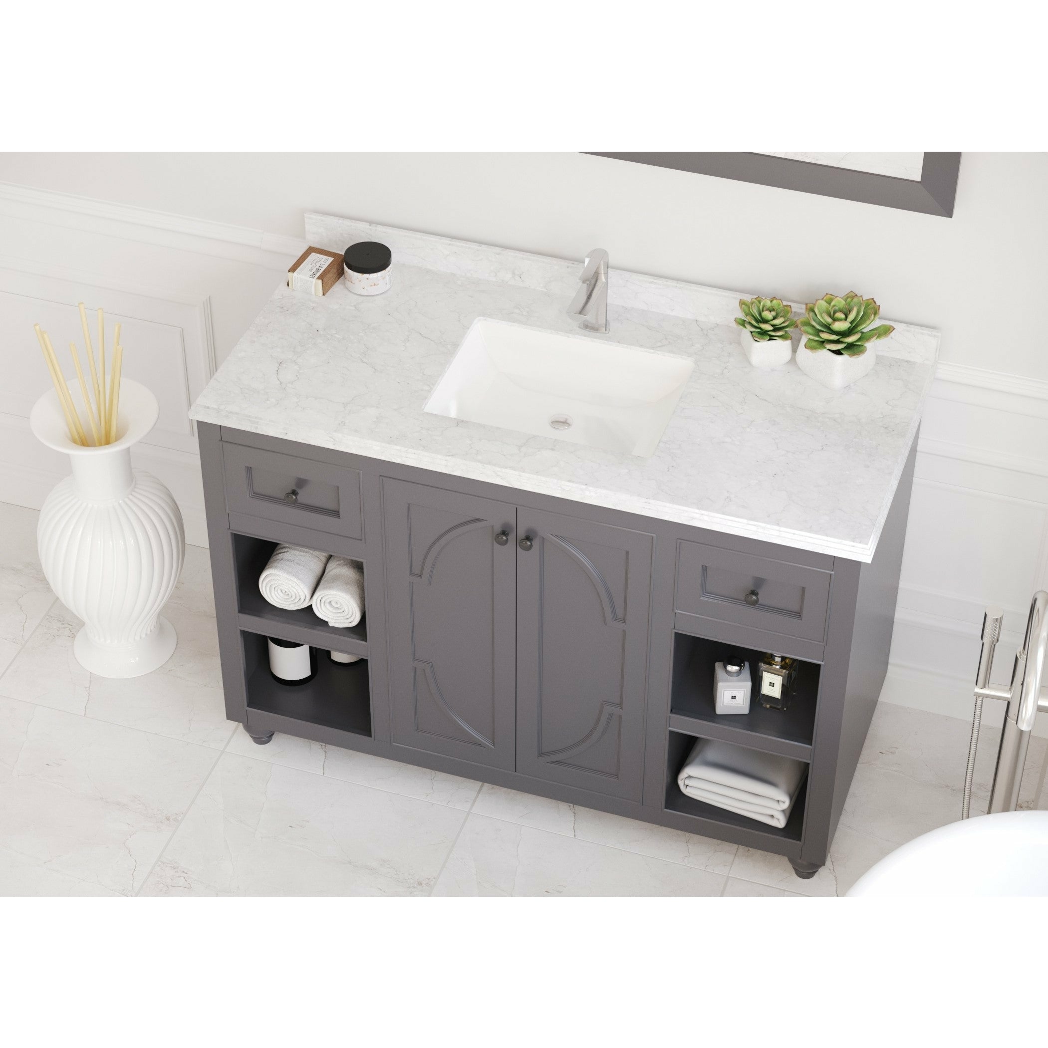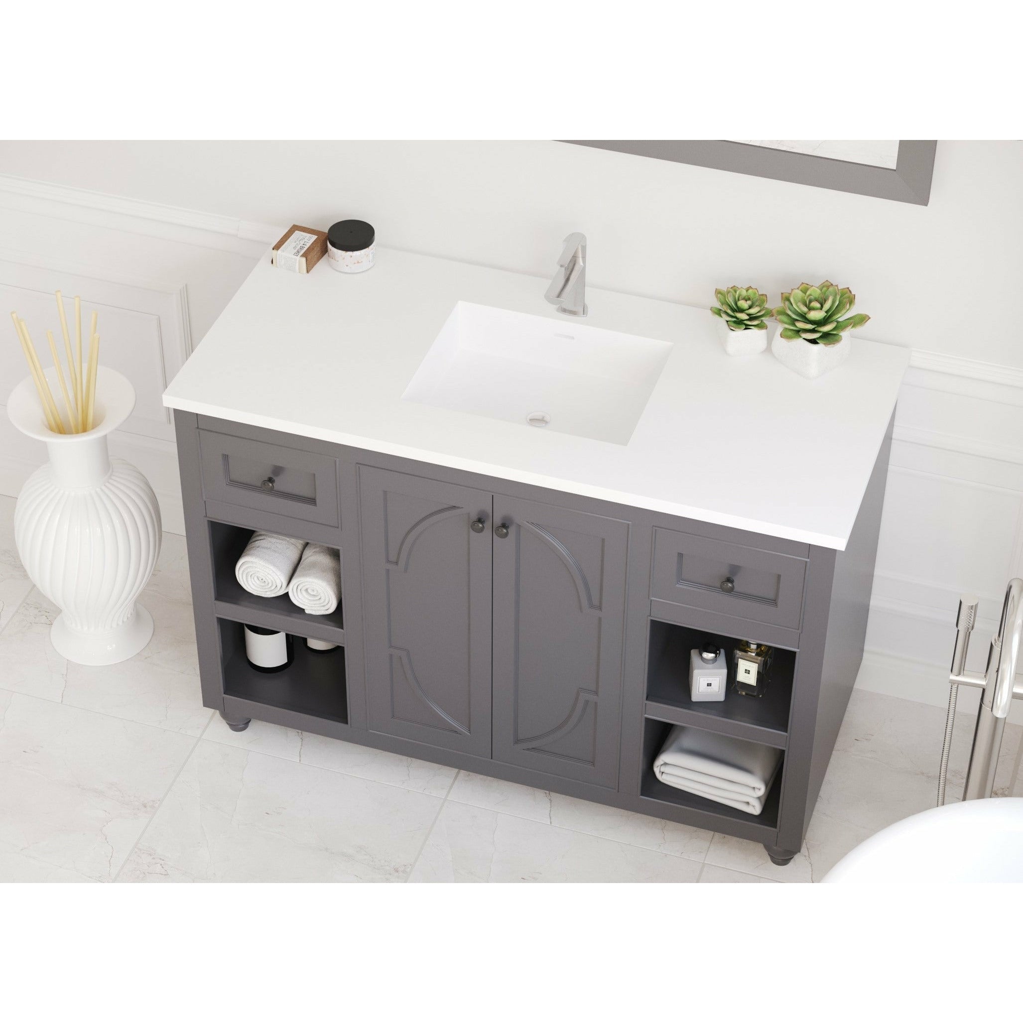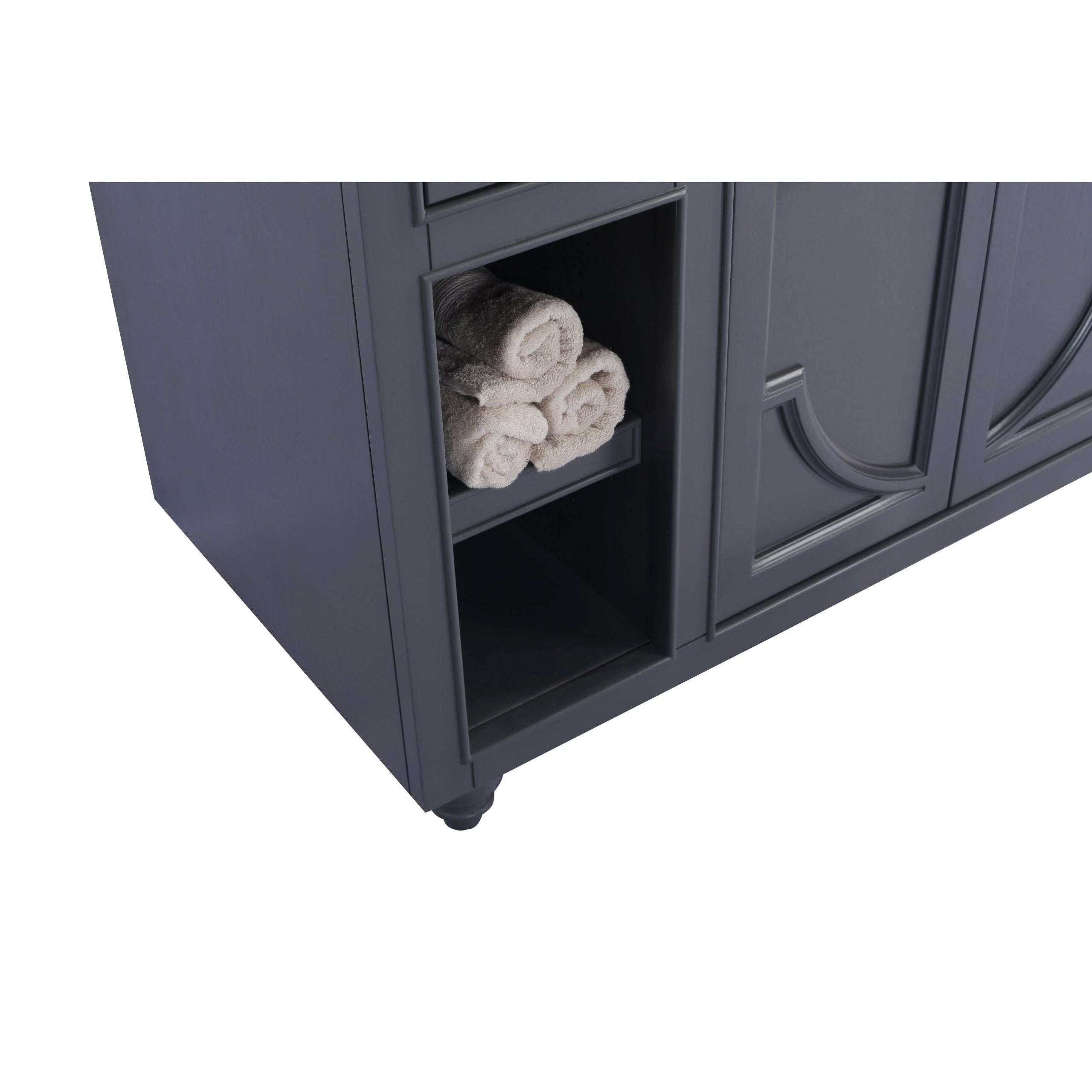 Odyssey collection is a “work of art” fashioned into a vanity of worth, function, and style. From the top of the countertop, finished so eloquently by the double OGEE edge, to the grain within the finish, lavishly covering the cabinet in 2 colors: Classic White and Maple Grey. The brilliance of the well-thought out concept continues with open shelves and top drawer (on the 36” or larger). This vanity also comes with an optional Toe-Kick assembly to cover the freestanding legs for a “built-in” approach. Available in single sink options in 24”, 30”, 36”, 48”, and double sink option in 60”.