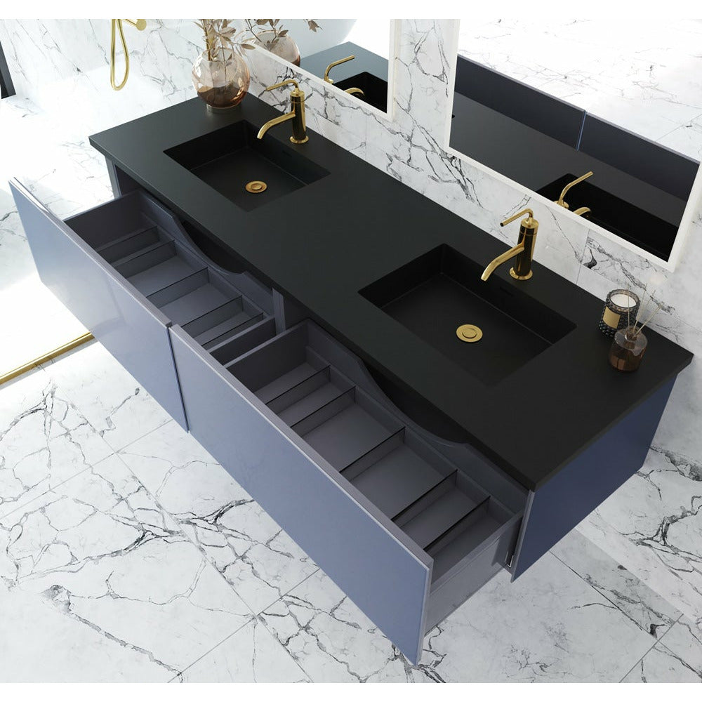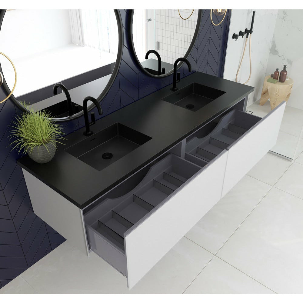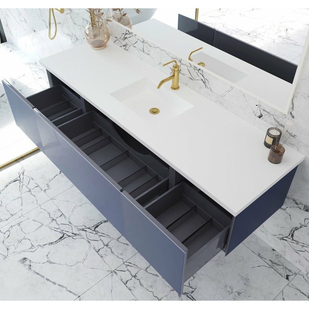 A: Handcrafted in Italy, the Vitri vanity features frosted Nano Glass panels that are resistant to smudges and fingerprints, along with push-to-open Blum hardware for effortless access.