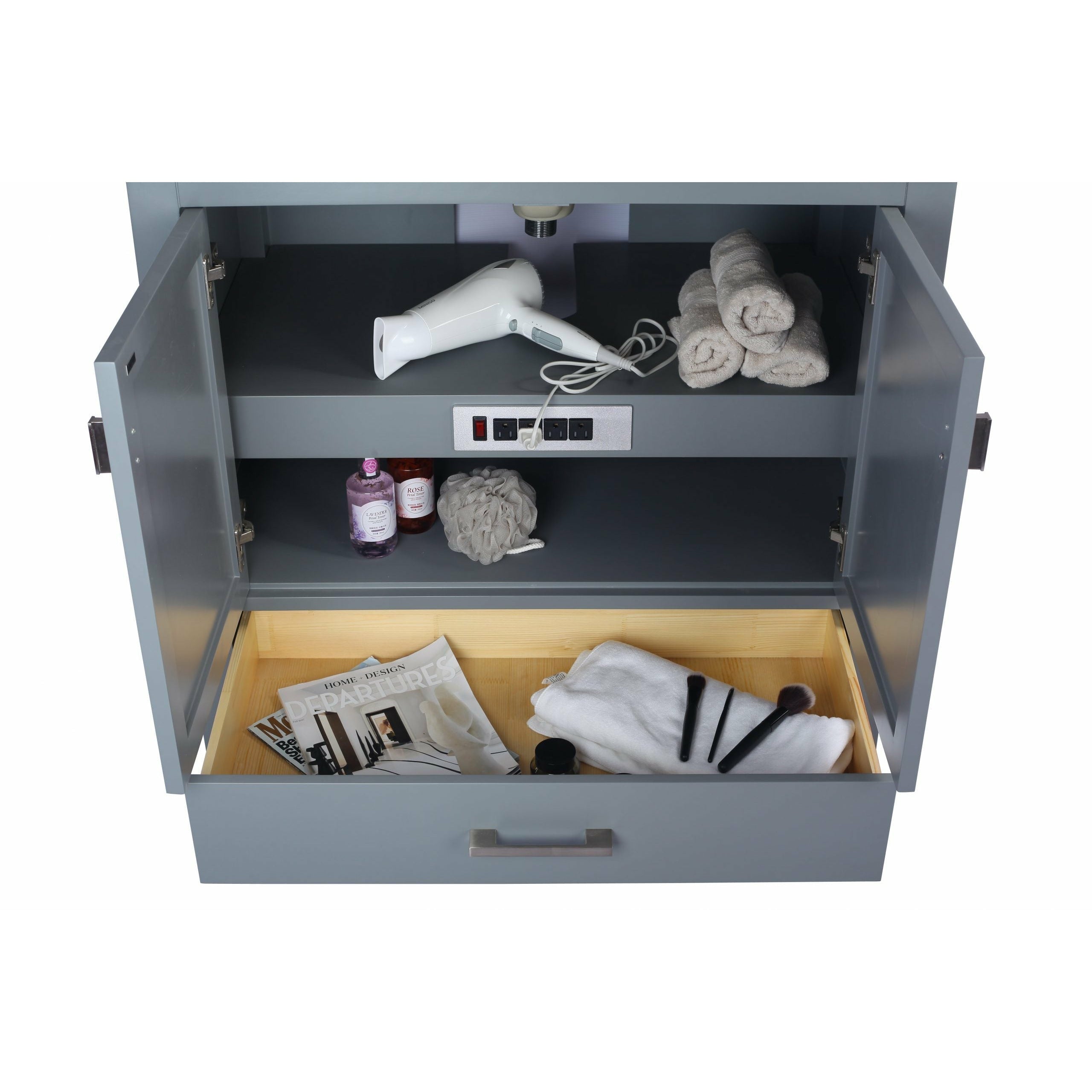 A: The vanity features soft-closing rails and hinges, dovetail construction drawers, and a 4-outlet plug for easy access to power your electronics.