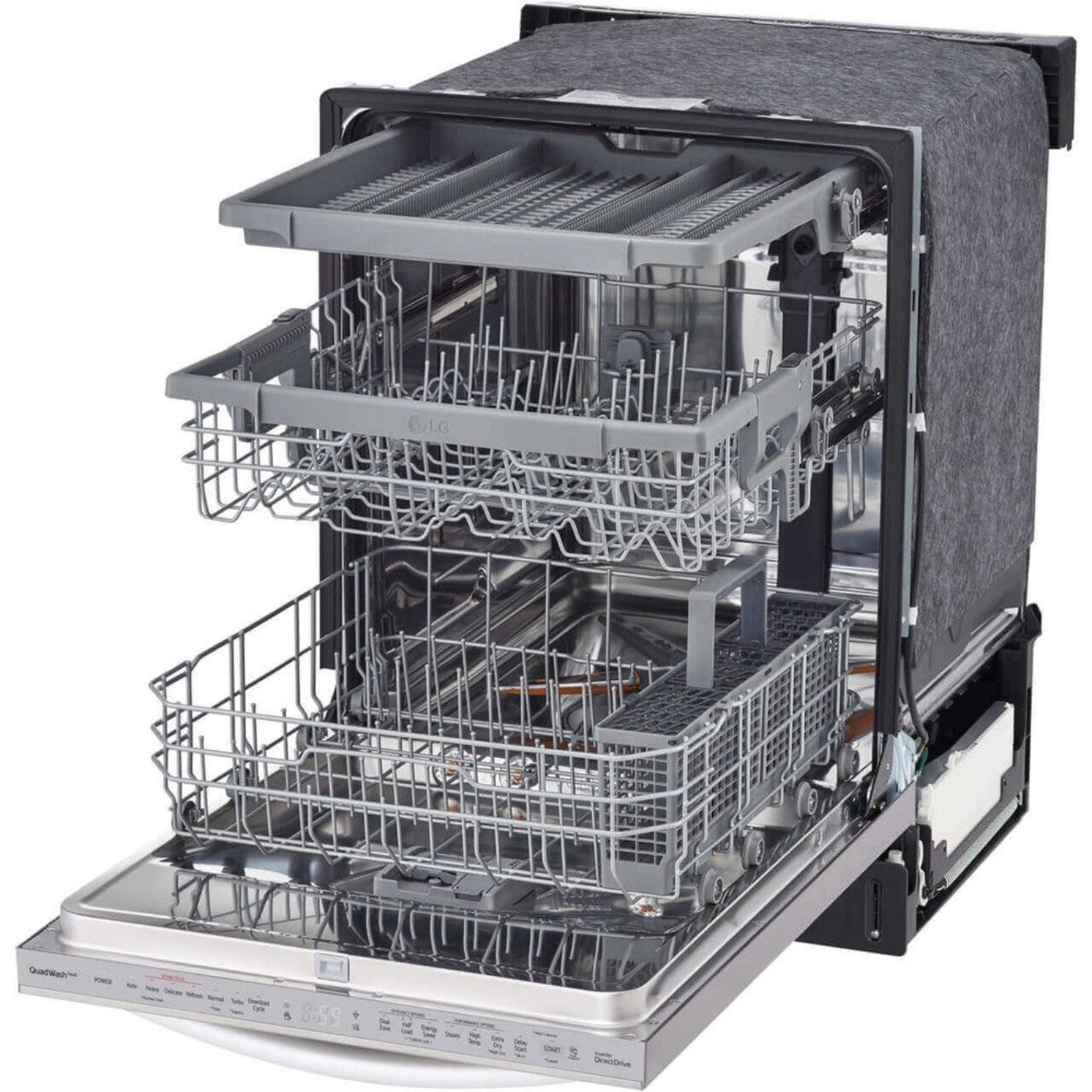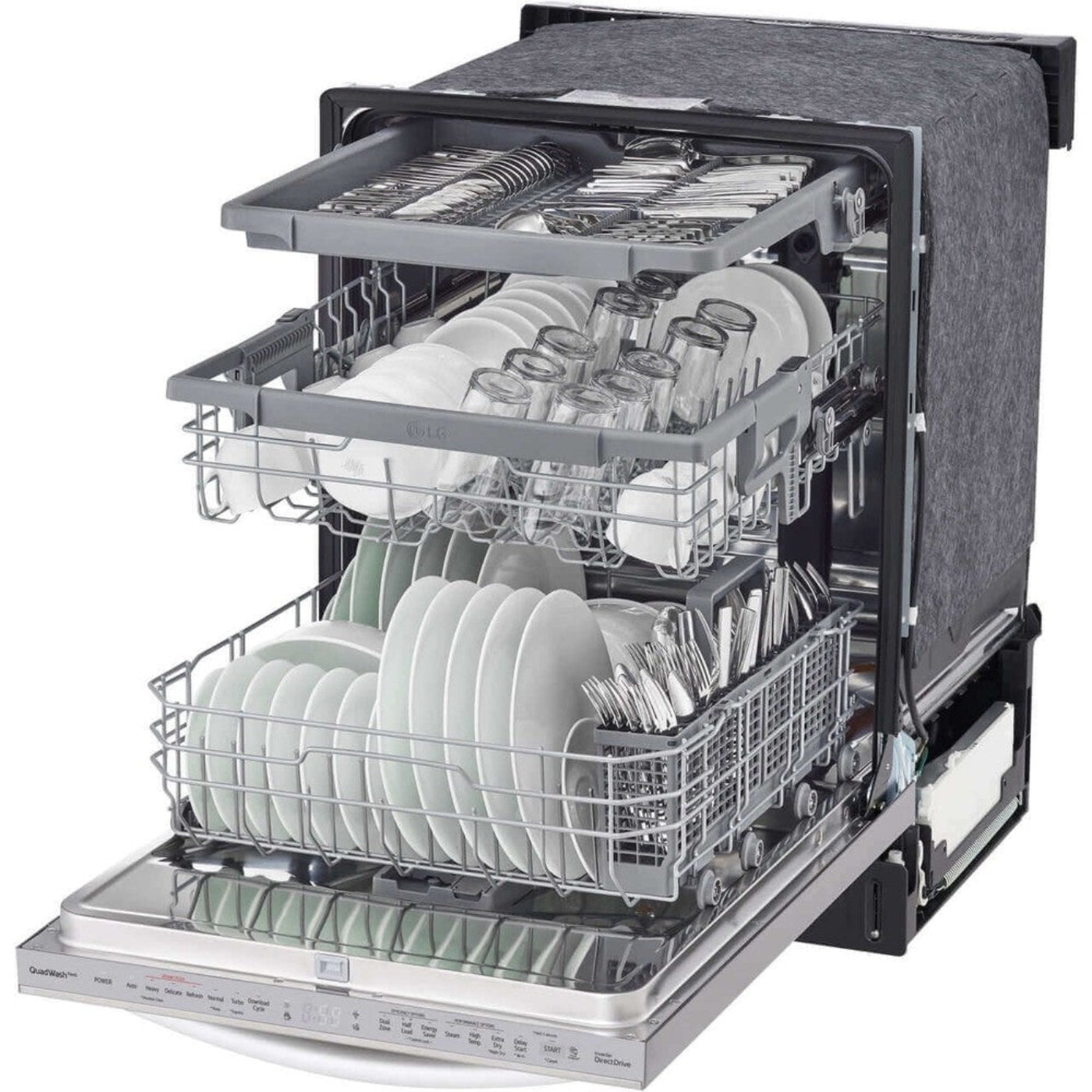 Set the table with sparkling clean dishes with LG's Top Control Wi-Fi Enabled Dishwasher. QuadWash technology power cleans with 4 multi-motion spray arms so dishes get clean the first time. LG TrueSteam uses the power of steam to penetrate food residue and reduce water spots. Dynamic Dry enhanced with TrueSteam thoroughly dries dishware and removes water spots so you can confidently set the table right from your dishwasher. The 3rd rack gives you more space to fit everything from long flatware to oversized cooking utensils. PrintProof finish resists fingerprints and smudges to keep your kitchen looking its best.
