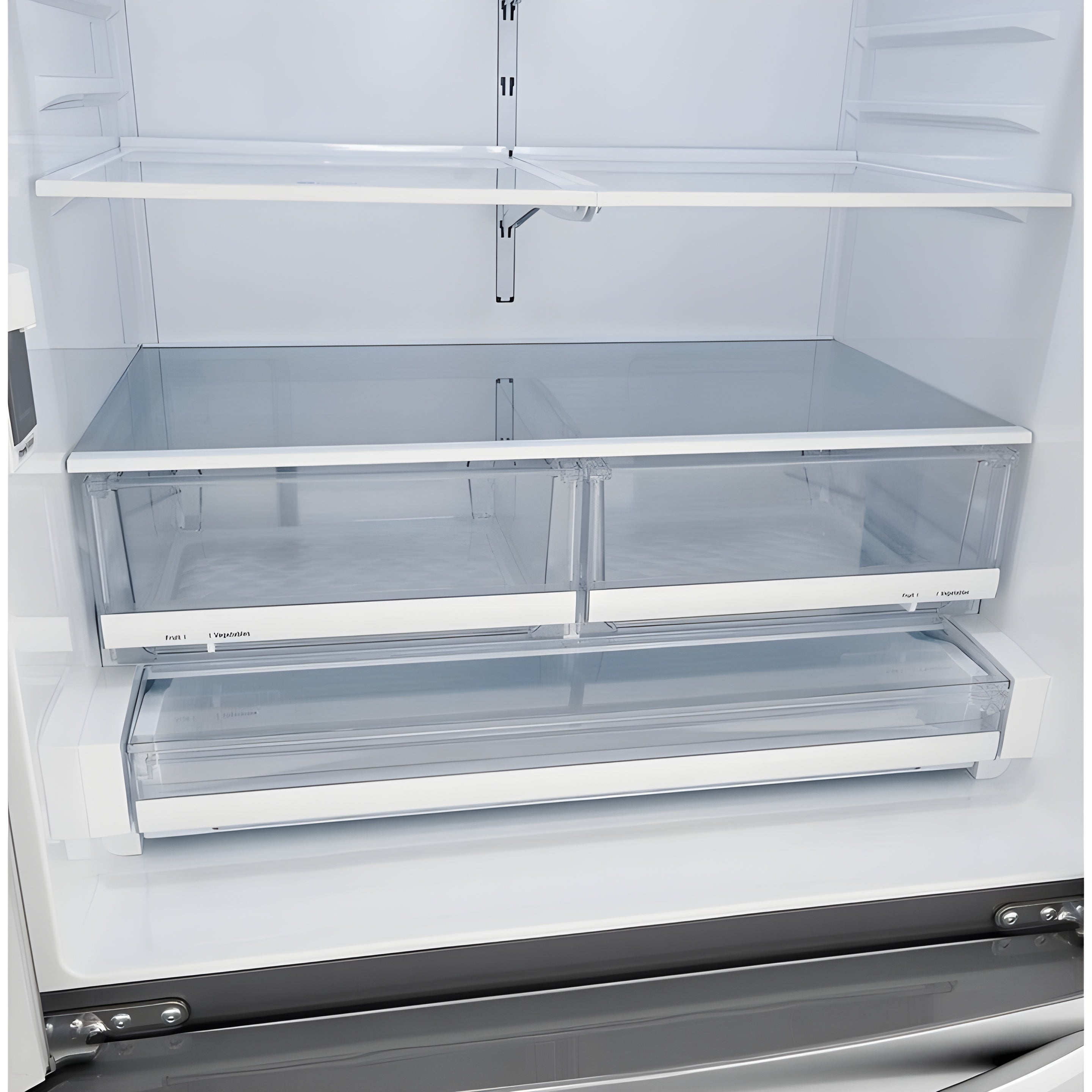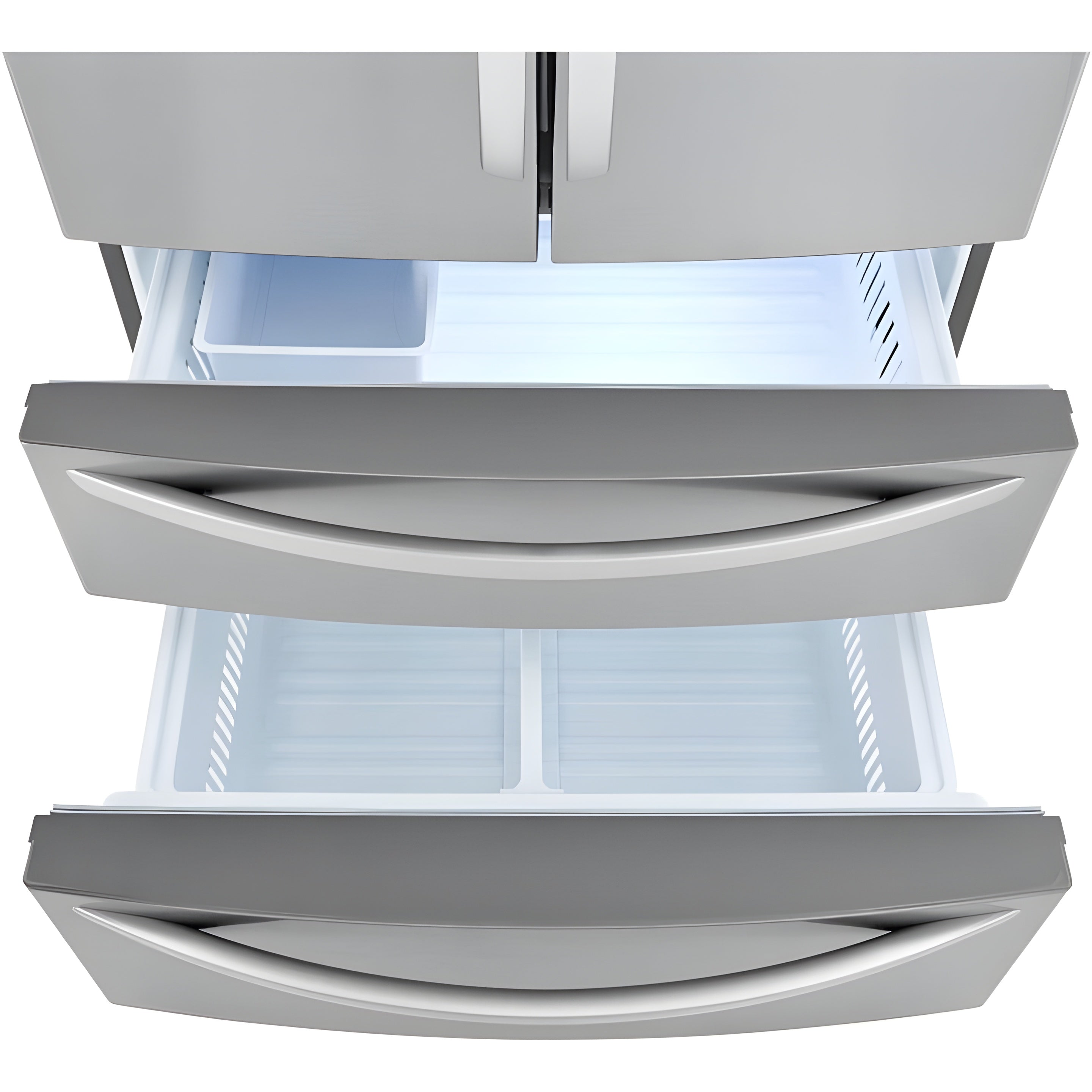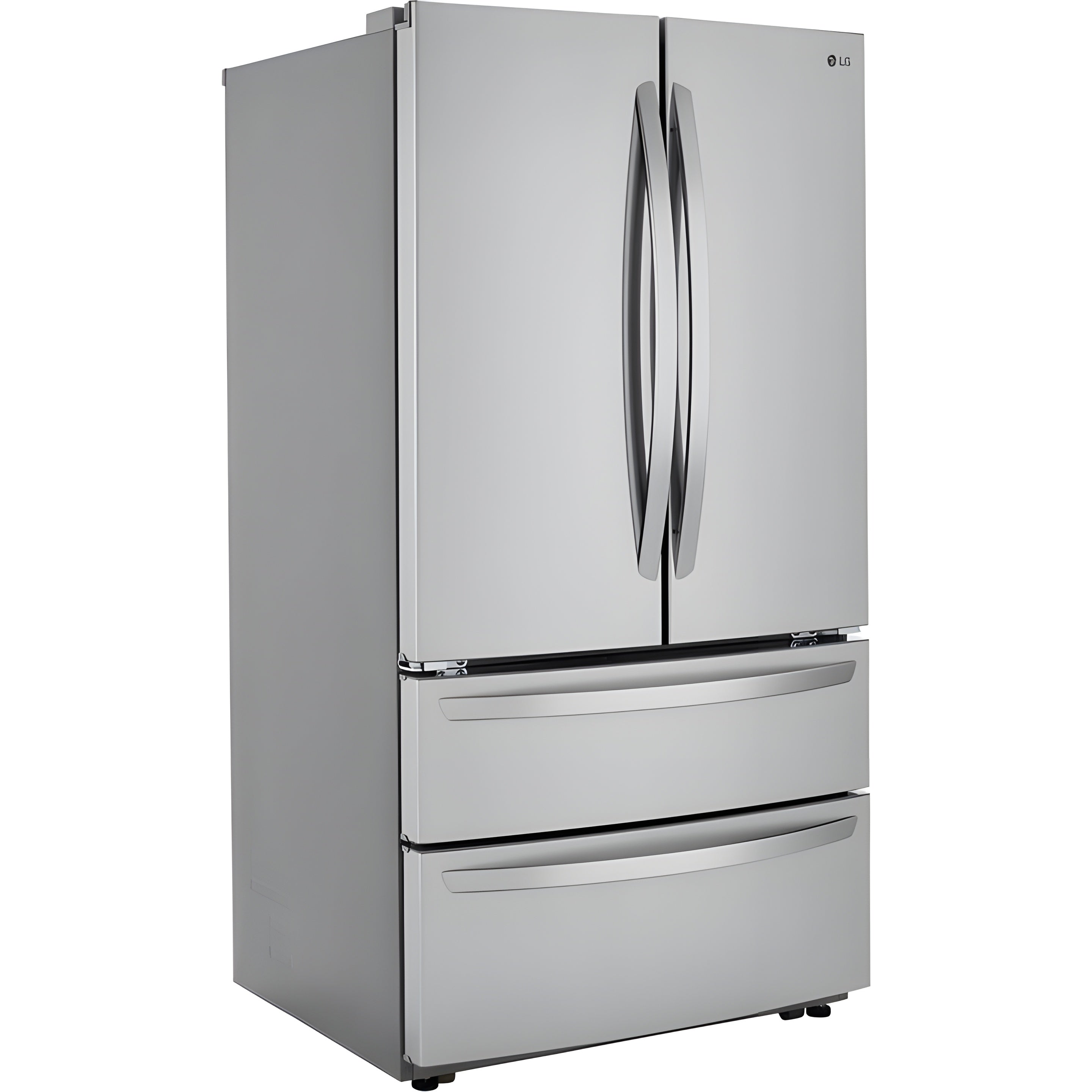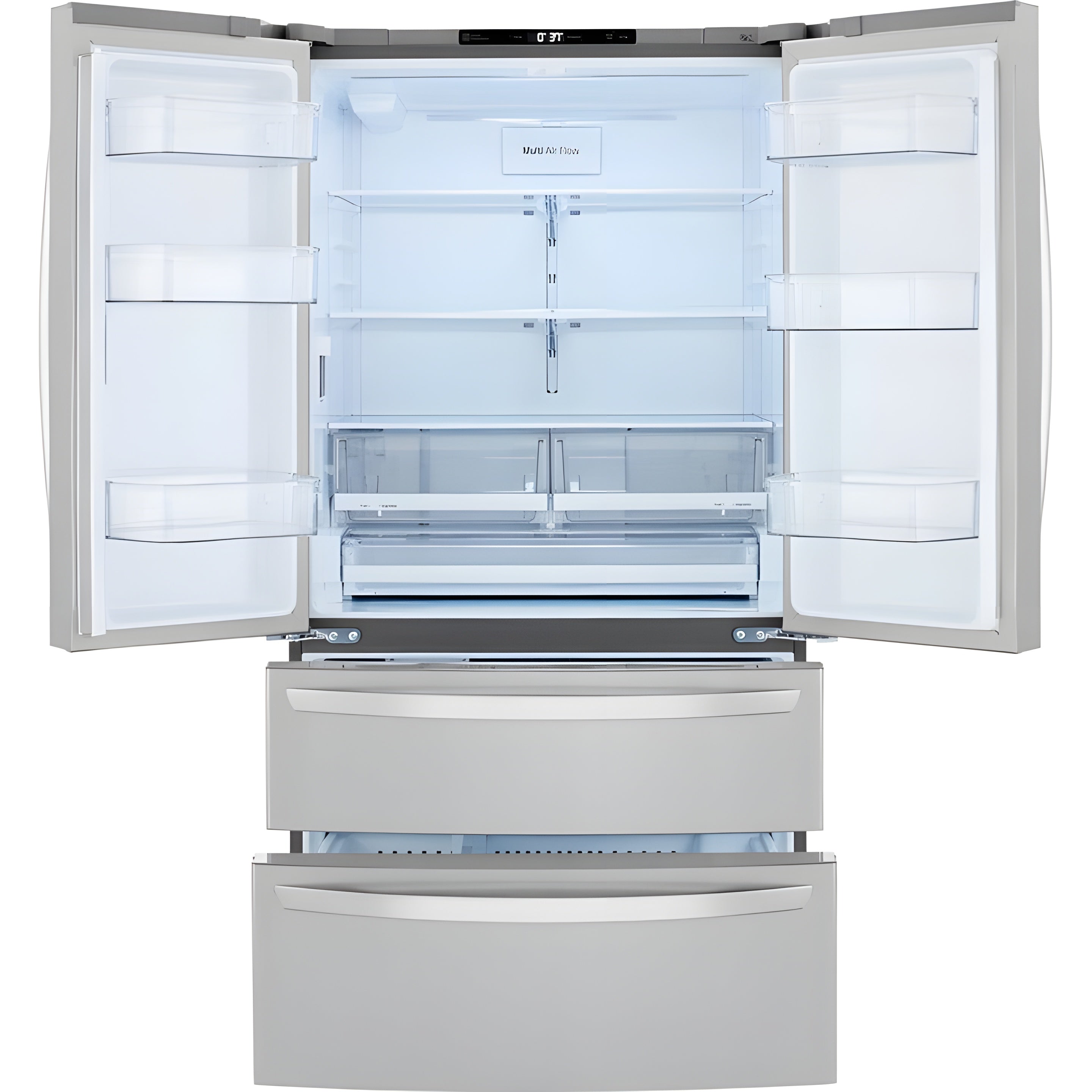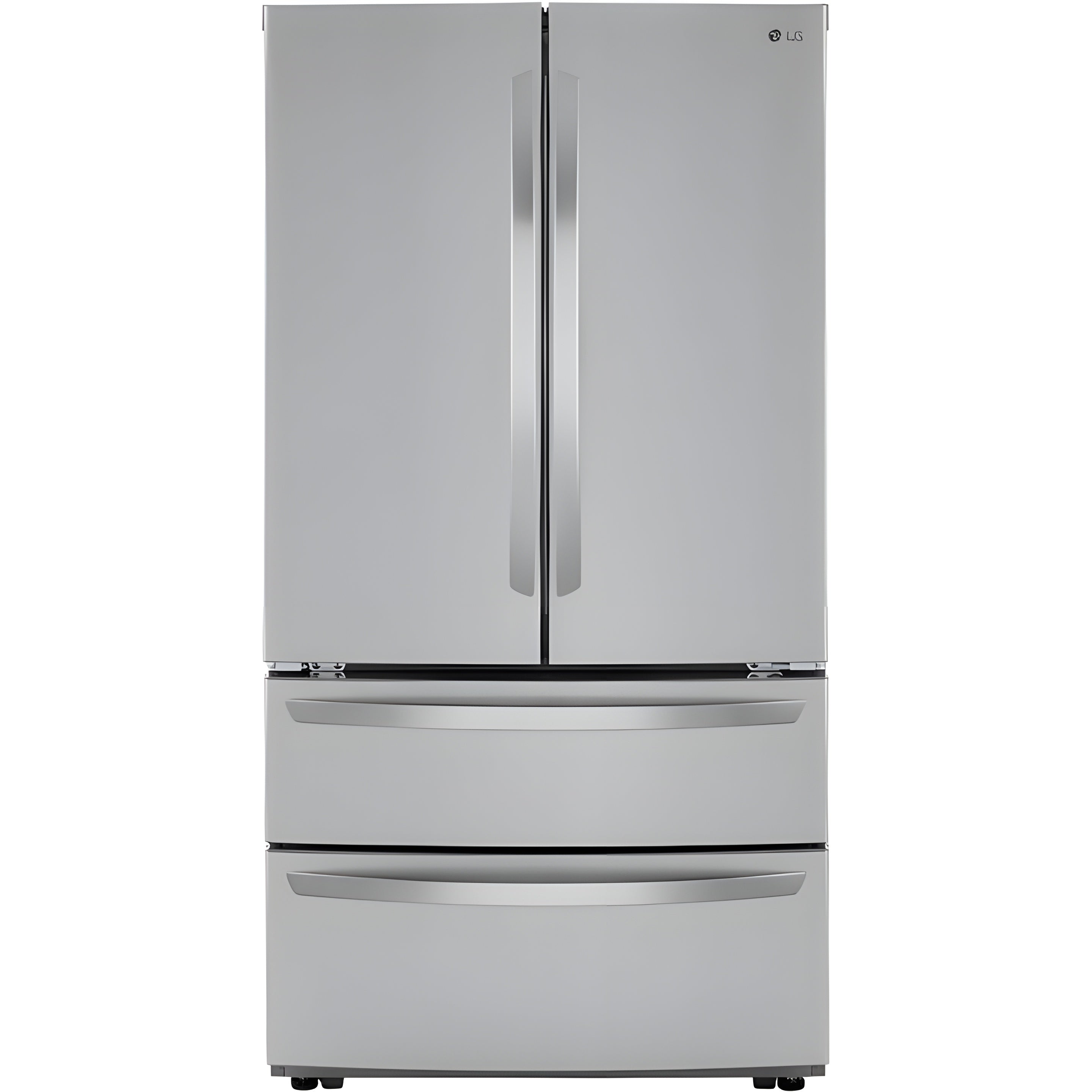 The LG 4-door French door refrigerator features a large 23-cu. ft. interior capacity. Enjoy a spacious double pull-drawer style bottom freezer with 2-tiers for simple organization.