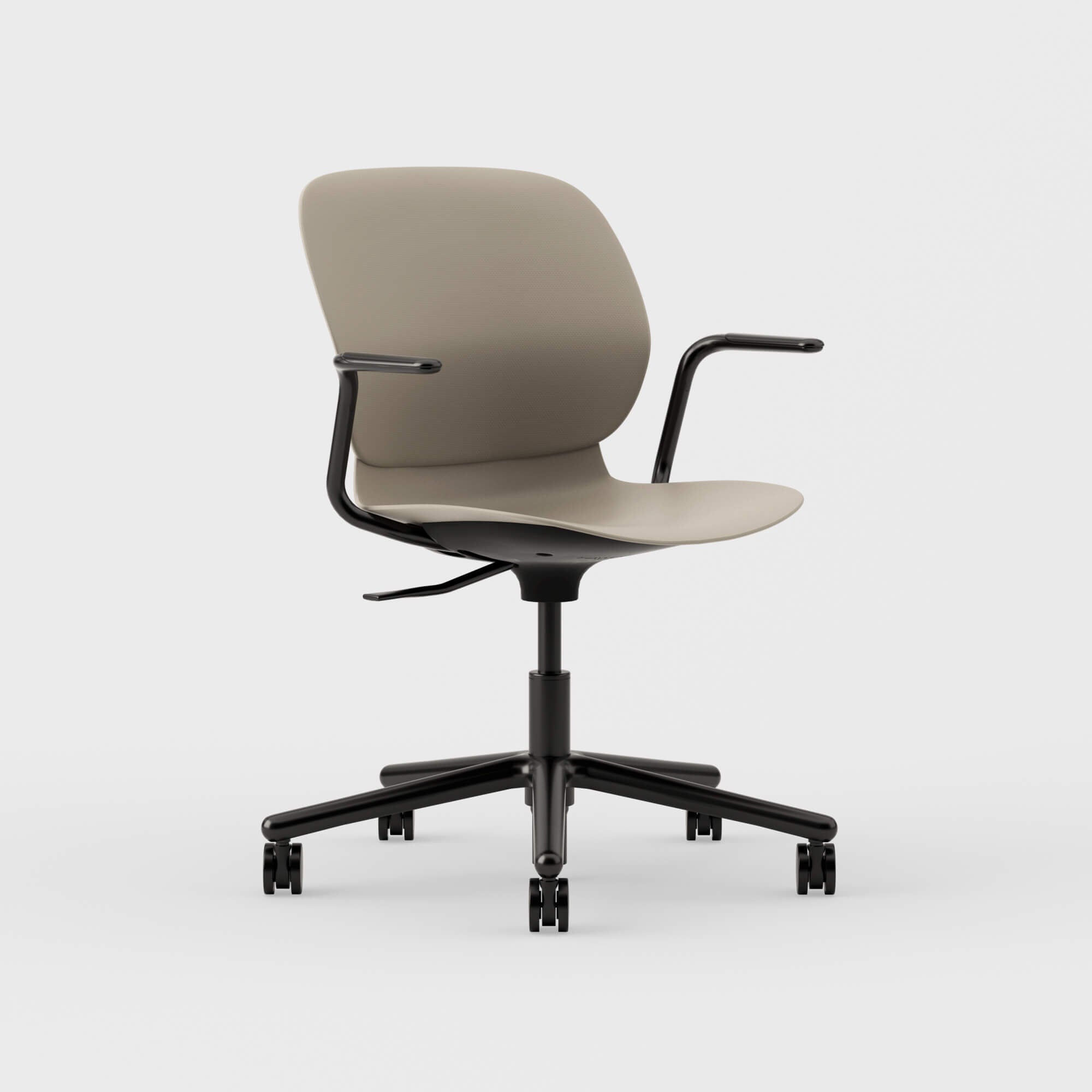 A: The chair comes in a sleek, modern design, available in neutral tones to fit various office setups.