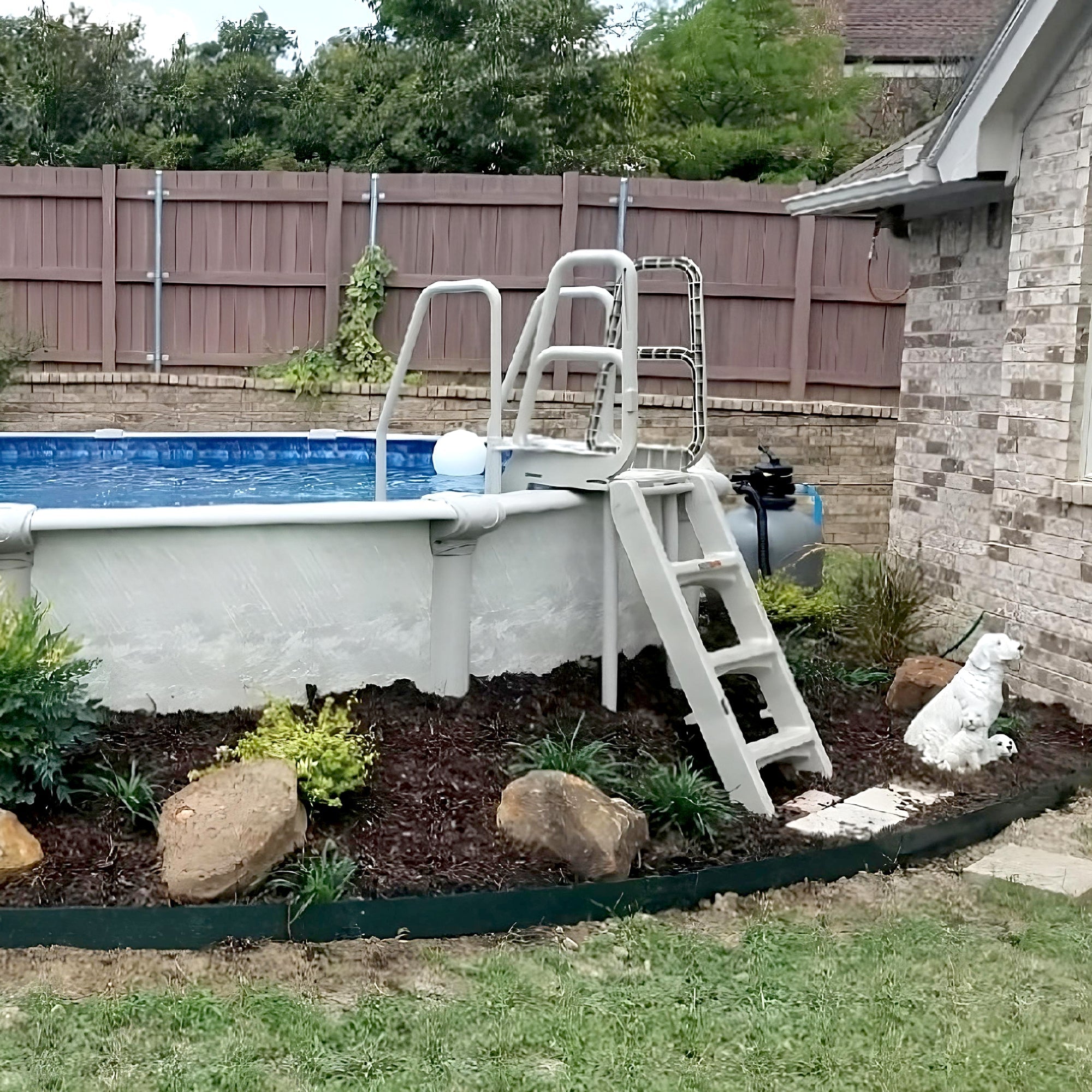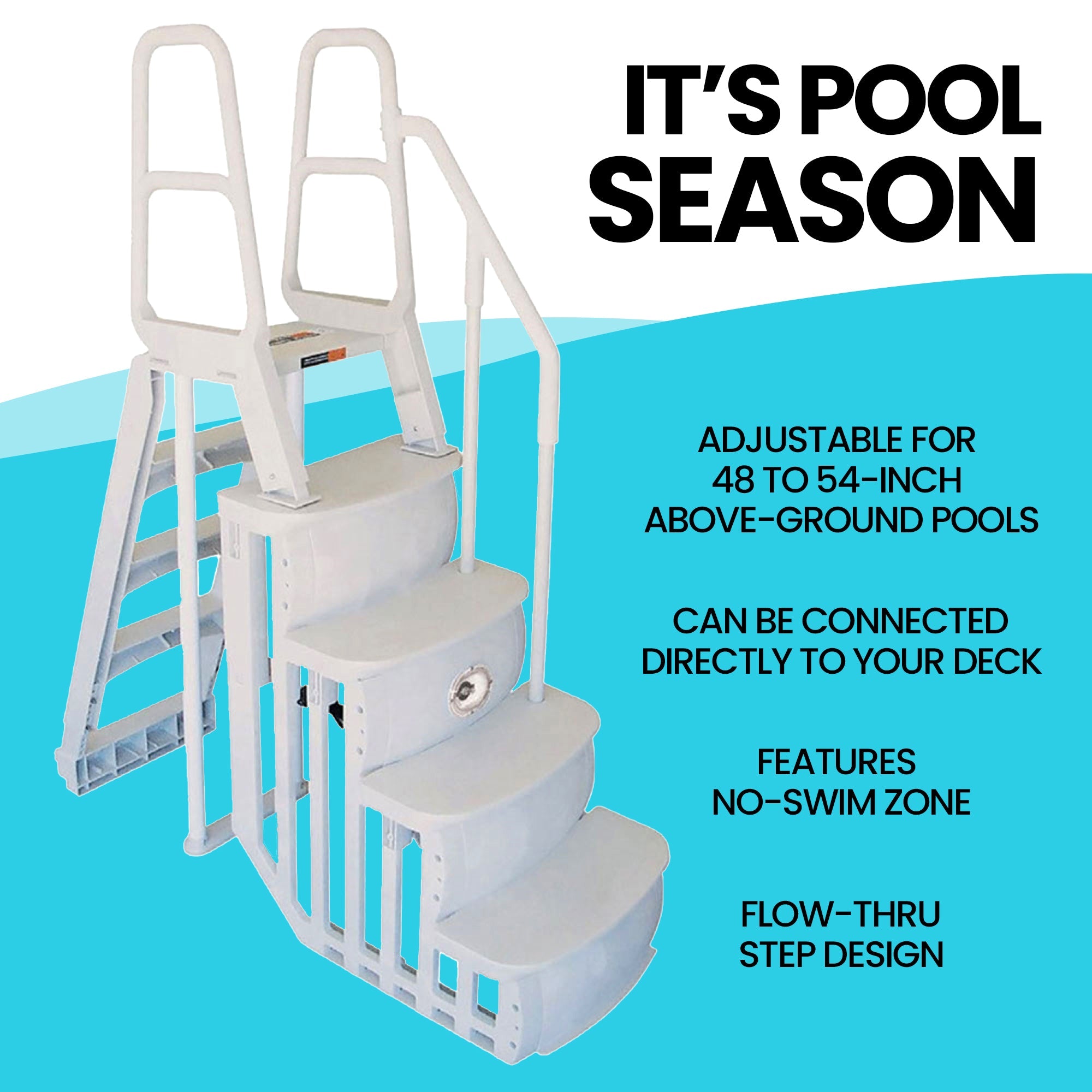 The 4-step ladder measures 24 inches wide and is specifically designed for smaller pools ranging between 48 to 54 inches tall. By sitting outside the pool, this ladder gives you a solid footing in the water. With a swing-up and lift-and-lock safety feature, you can enjoy the cool waters of your pool, knowing that everyone who enters or exits will remain intact.