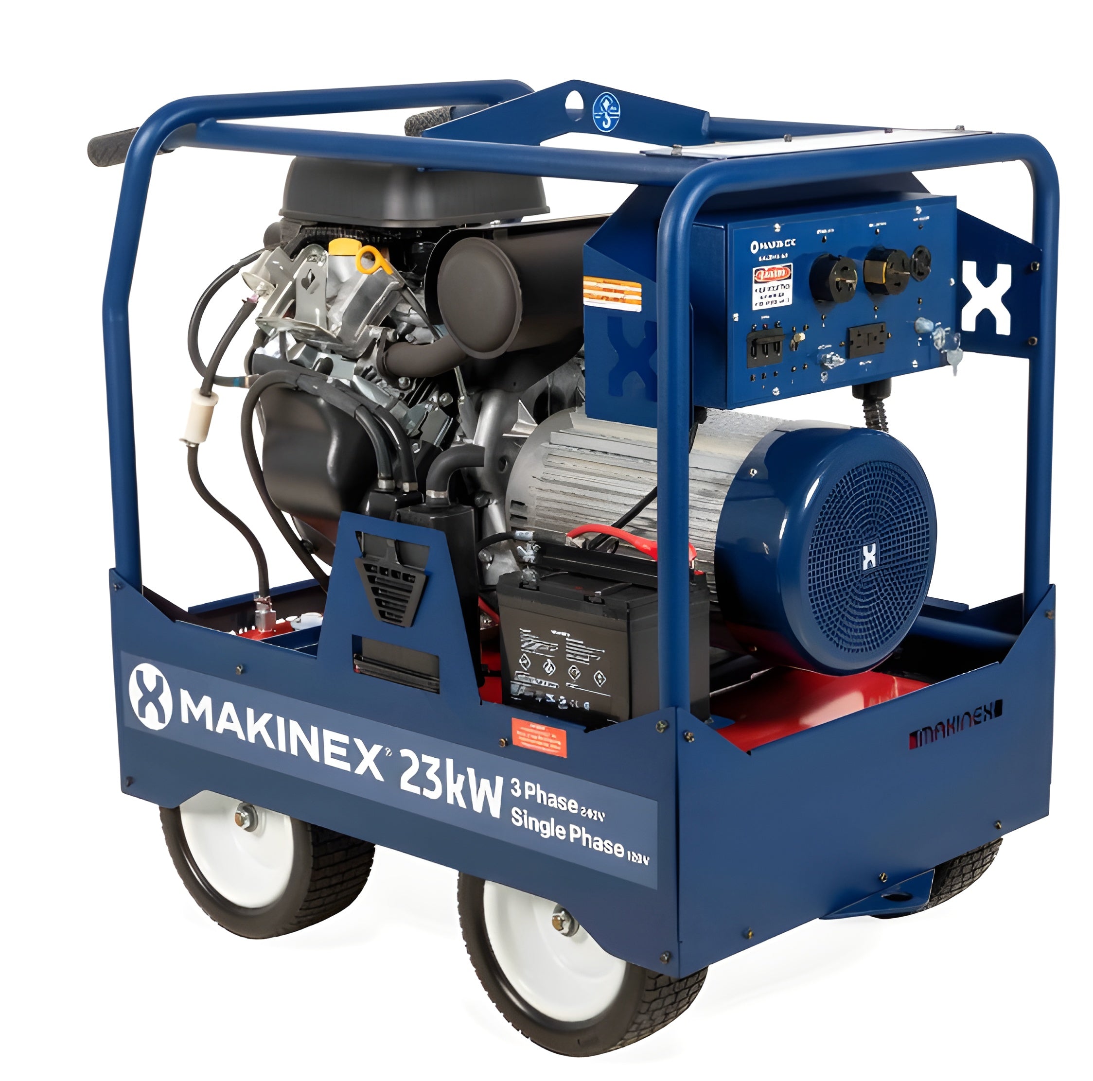 A: The Makinex 23kW / 240V Generator (GEN-23P-MS-240) is a high-performance, portable power solution designed for industrial, construction, and commercial applications. It delivers 23kW of reliable power at 240V, making it ideal for running heavy-duty equipment.