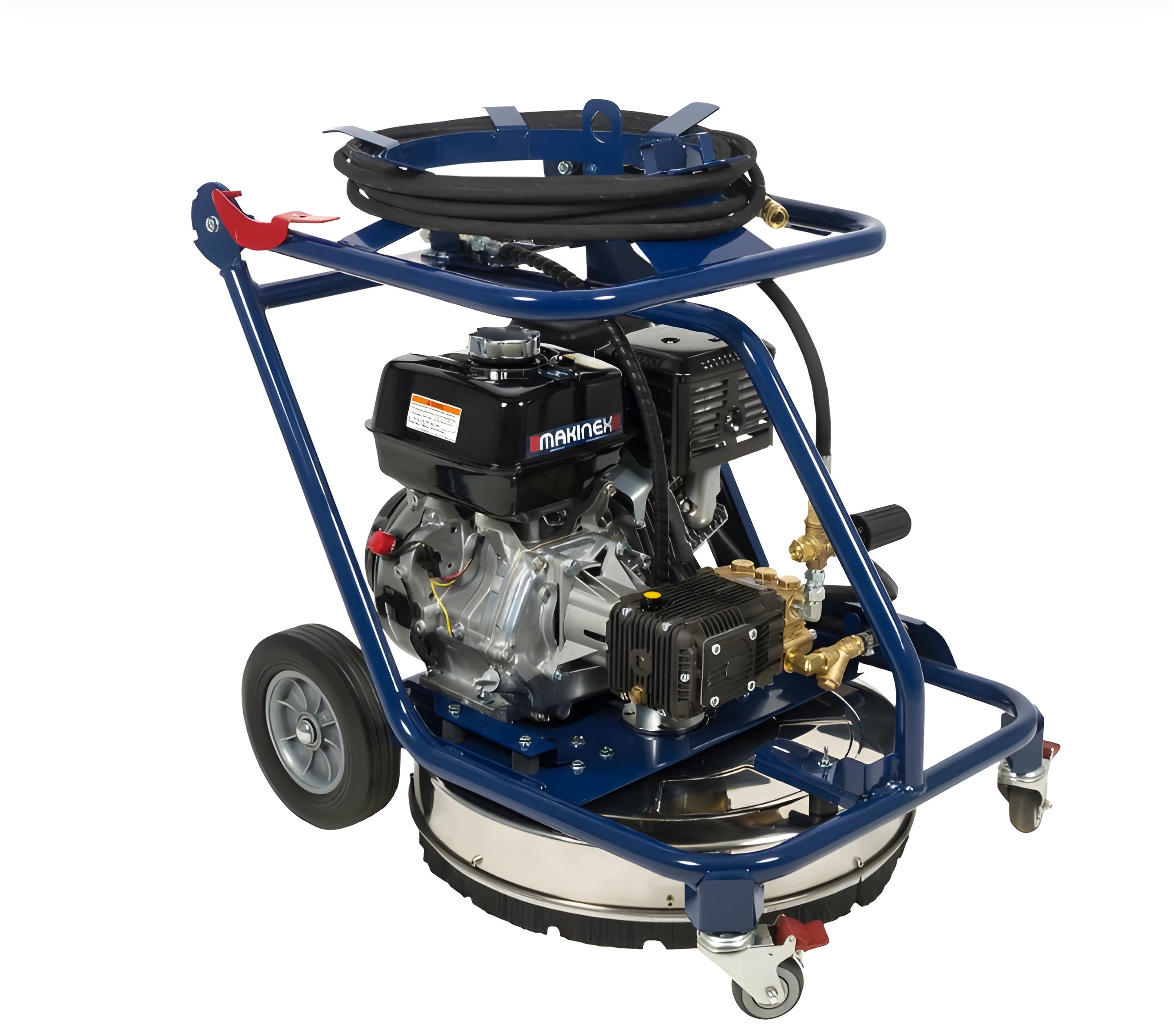 The Makinex Dual Pressure Washer features a Honda engine and a 30ft hose to access hard-to-reach places. Other features include rubber mounts to reduce vibration from the engine, brake castors for locking in place, and a heavy-duty geared pump with a thermal release valve. There is also a convenient lifting eye and a foldable handle to assist with transportation and storage.