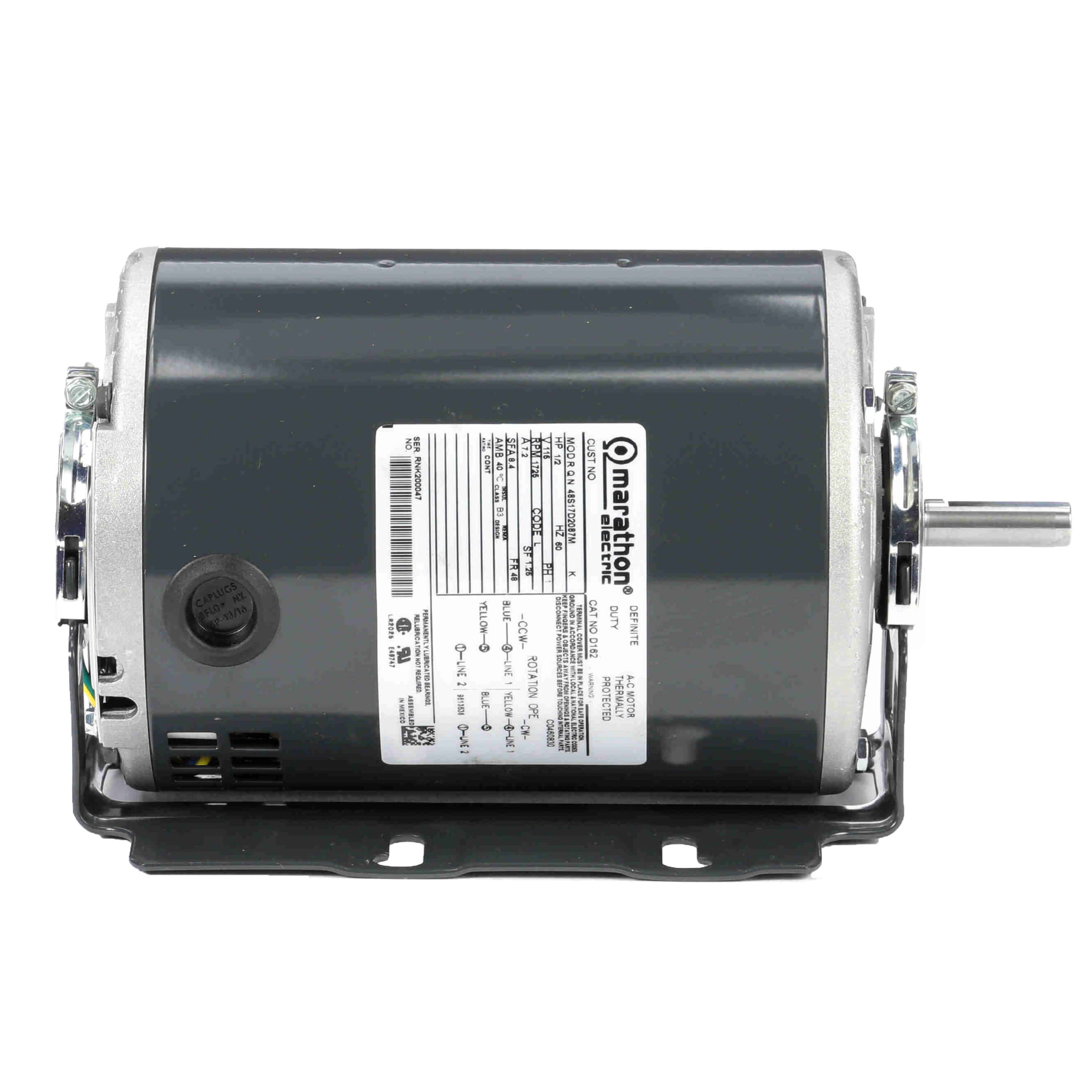 The Marathon Motors D162 is a durable 1/2 horsepower, 115 volt motor capable of 1725 RPM. Known for its reverse rotation functionality, this motor is designed specifically for various fan and blower applications.