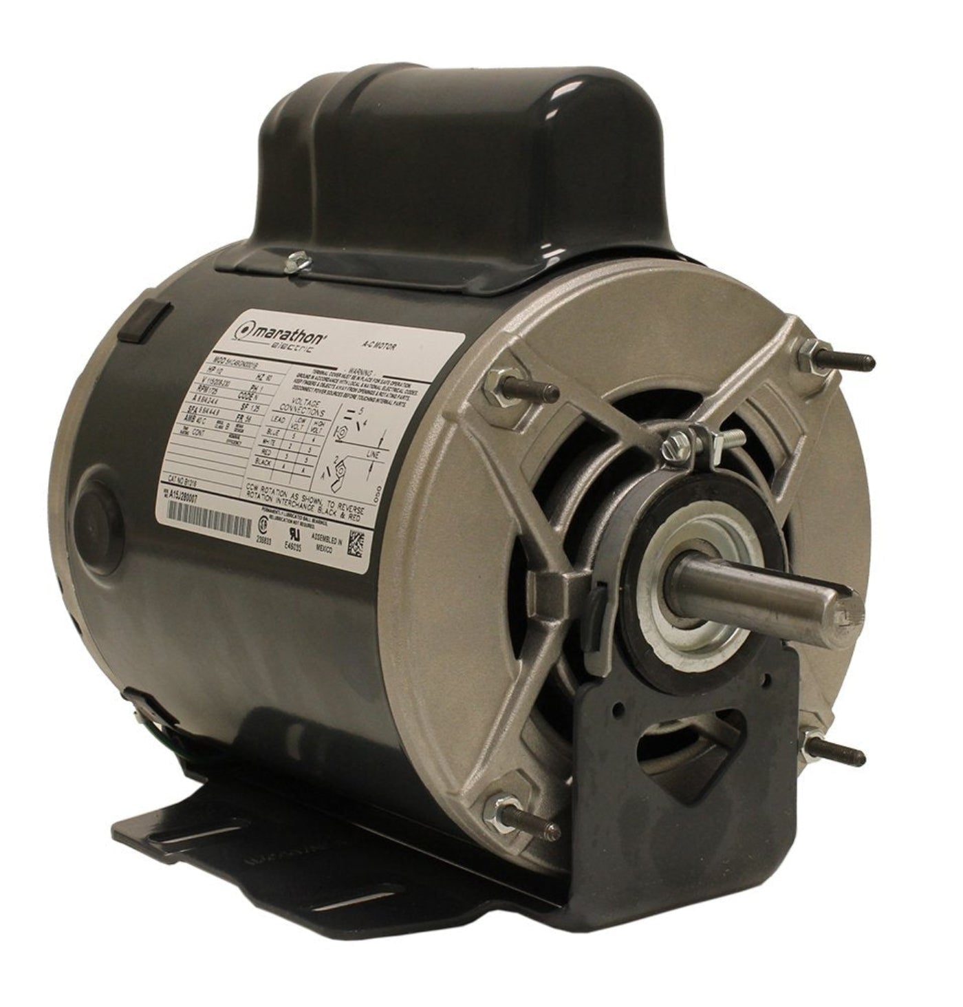 The Marathon Electric MB1316 is a general purpose motor designed for various applications. With a power rating of one half horsepower and operating speeds of one thousand eight hundred revolutions per minute, this motor supports voltages of one hundred fifteen and two hundred eight to two hundred thirty volts. The resilient base and open drip-proof construction provide durability and effective heat dissipation.