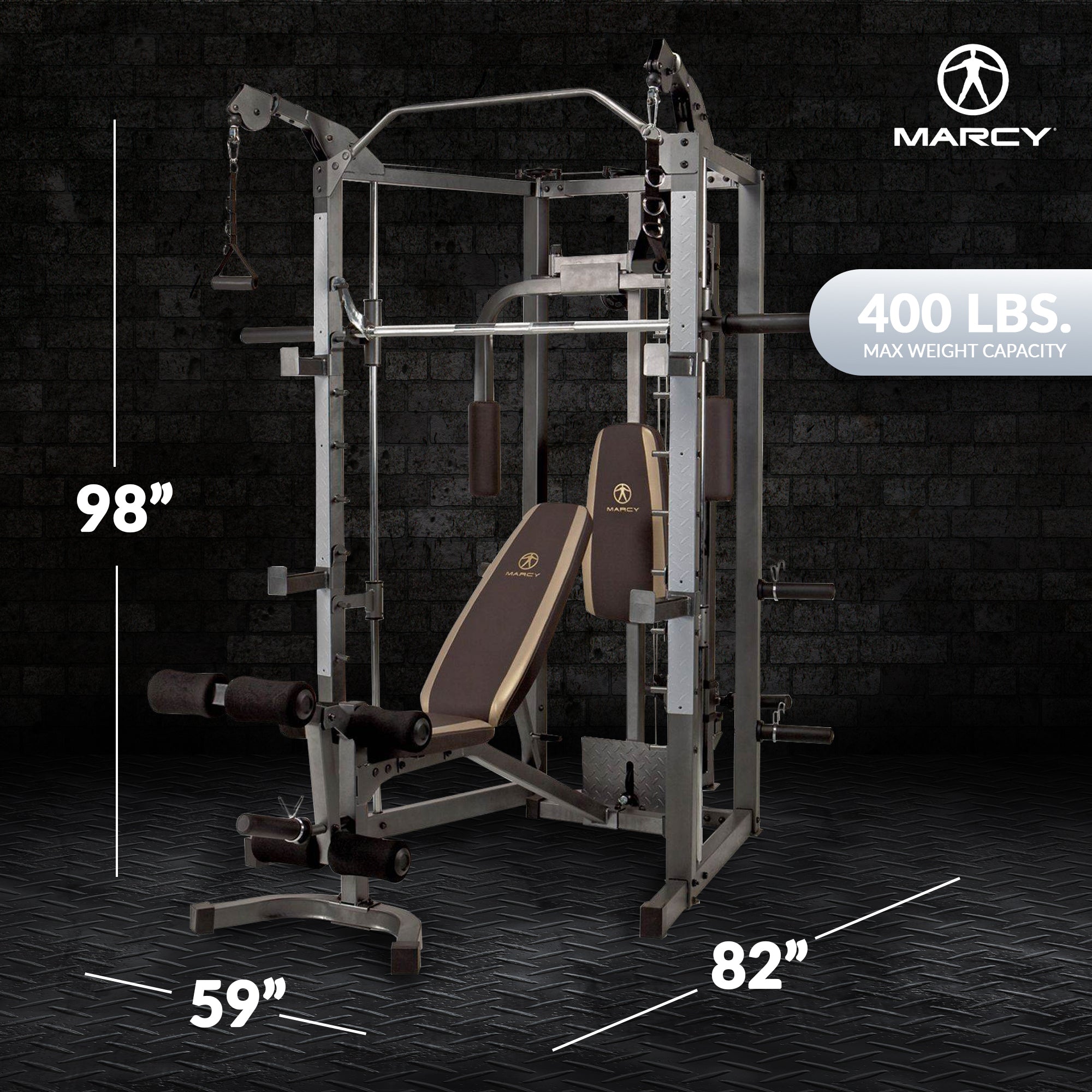 Discover the Marcy Smith Cage Home Gym Machine—a sleek and professional powerhouse for your fitness journey. Engineered for a sculpted physique, it offers a range of exercises to tone and strengthen. Built with heavy-duty construction and a durable powder-coated finish. The design includes an independent motion upper pulley cable crossover and a vertical butterfly for versatility. The dual-function leg developer aligns with knee joints, utilizing 2,000-pound tensile-strength aircraft cables. The adjustable back pad allows for multiple positions, ensuring a customized workout experience, with contoured foam roller pads for added comfort. Nylon pulleys with sealed bearings provide a smooth exercise routine. This gym machine also features a low pulley with row footplate support, expanding your exercise options. Accessories like a shiver bar, ankle strap, link chains, handles, and a "V" bar further enhance your workout possibilities. With oversized square tubing and chrome-plated guide rods, it's built to last. It measures 98 inches long, 59 inches wide, and 82 inches tall and can hold up to 400 pounds. It is ideal to place in your basement, garage, or dedicated workout area. The Marcy Smith Cage Machine saves you time and money while enabling effective strength training from the comfort of your home.