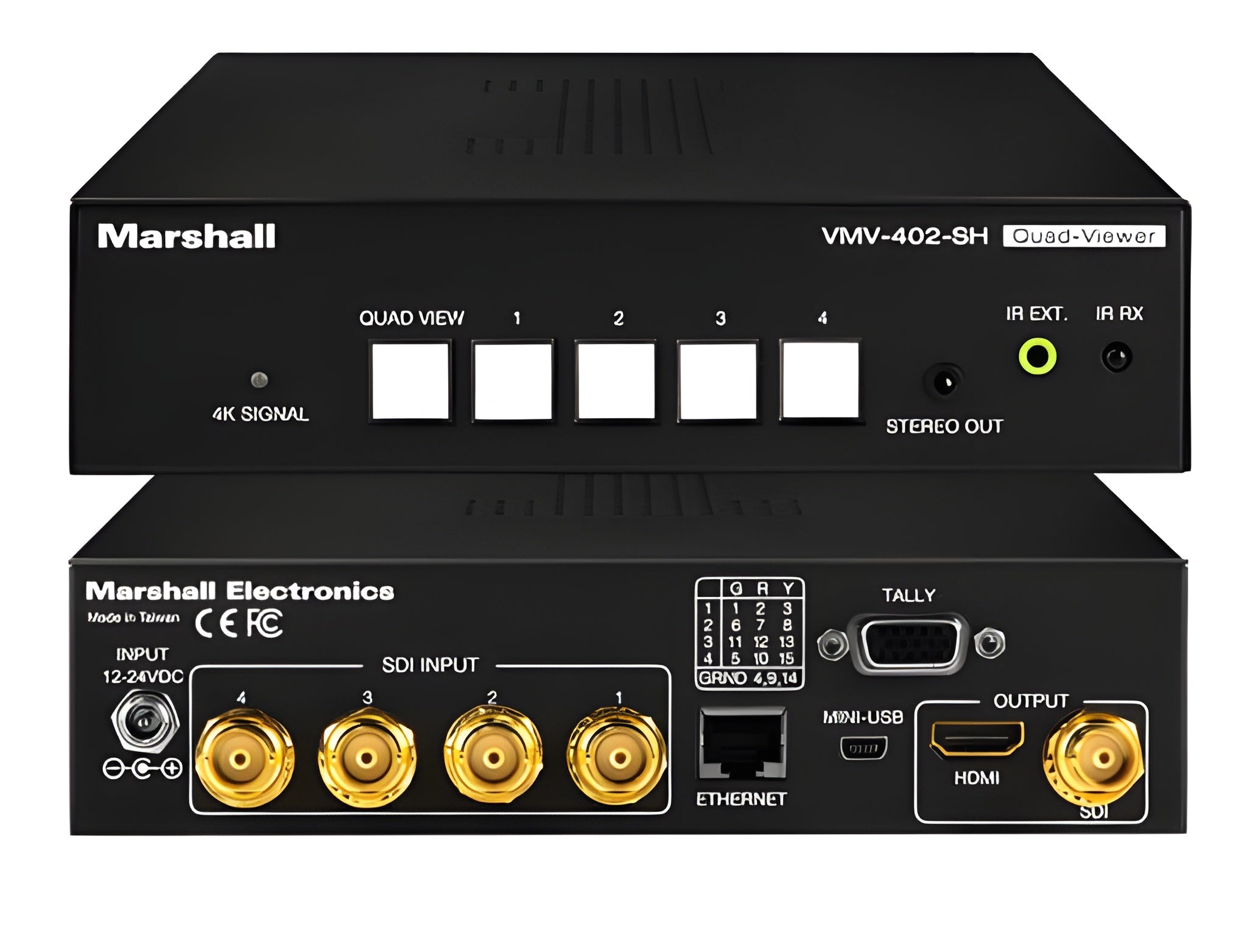 The QVW173-PAC delivers a full broadcast-quality (1080 x 1920) quad-view display that can also act as a 4-input switcher, allowing seamless transitions from up to four media sources. When used together, the QVW173-PAC package allows users to mix and match any combination of video inputs, including non-broadcast computer (VESA) resolutions, to a preselected resolution and frame rate. Each quadrant is also rescaled and reframed for optimal monitoring.With full active throughput, the VMV-402-SH provides picture-perfect seamless upstream switching, which can add years of life to smaller production systems comprised of switchers with limited inputs. If progressive formats are used, the VMV-402-SH's integral scalers are even capable of flawless 4KUHD transformation for 4K streaming and projection of a single image. The QVW173-PAC is a true studio upgrade at a fraction of the cost of a single switcher.